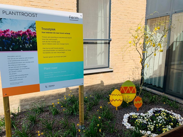 Momenteel is het plekje aangekleed voor Pasen. Ferm wil deze plek seizoengericht blijven inrichten, ook in samenwerking met andere partners.