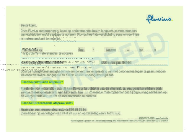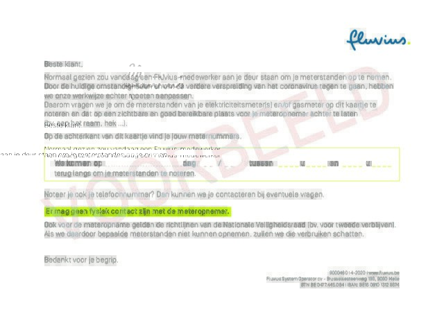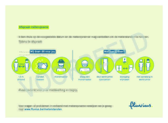 “Zij kunnen dit jaar niet zelf de meterstand doorgeven en krijgen hiervoor een uitnodiging. Indien ze thuis zijn, laten ze de meteropnemer uitzonderlijk binnen op het voorgestelde tijdstip, dat op het kaartje staat. De klant kan het groene kaartje ook ophangen op een zichtbare plaats. De opnemer zal wel aanbellen. We zorgen ervoor, dat alles veilig verloopt en vragen om de instructies van het kaartje op te volgen .”