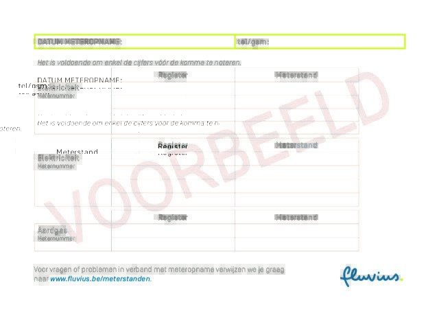 “Onze opnemers bussen 2 dagen voor opname een wit of groen kaartje in de woningen, waarvan wij de meterstanden nodig hebben. De klant kan zijn meterstanden uitzonderlijk zelf opnemen en noteren op het witte kaartje. De dag van opname kan hij het kaartje omhoog hangen aan het venster of op een andere zichtbare plaats (bus, hek…). Die datum staat steeds vermeld op het kaartje.”