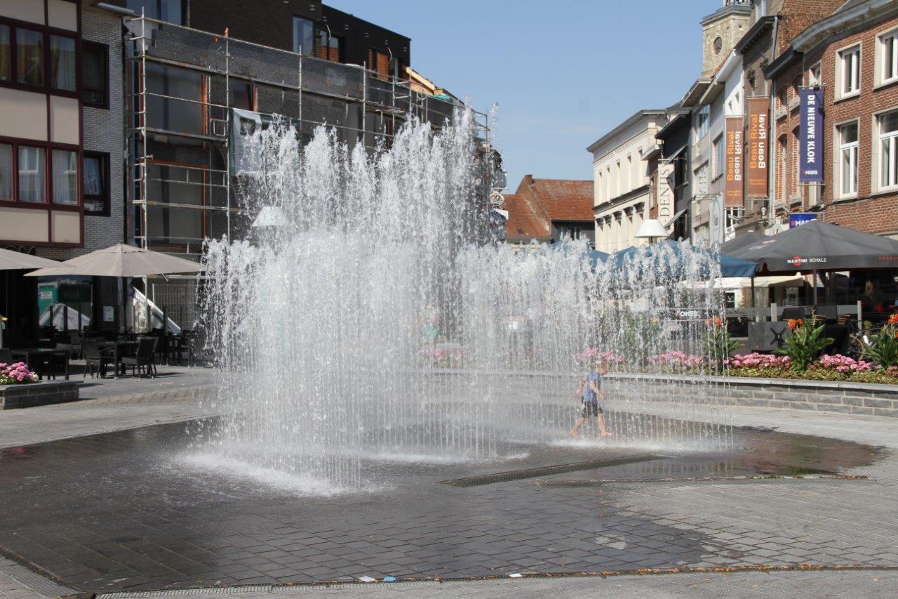 Dat de fontein op de Graanmarkt een week later in actie kwam, heeft zijn redenen. “Het onderhoud, het beheer en de opstart daarvan gebeuren niet door onze technische dienst”, aldus schepen Marc Torrekens (Open VLD). “Dit is volledig in handen van een gespecialiseerde firma. De opdracht was al gegeven, maar omwille van het bouwverlof zat er wat vertraging op de uitvoering.”