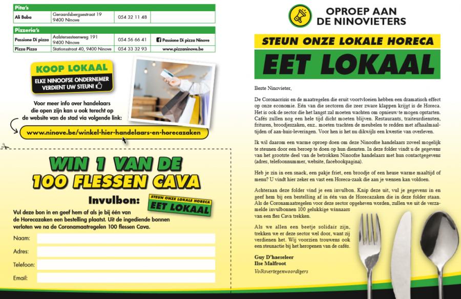De organisaties verspreiden een folder in alle brievenbussen van Ninove en deelgemeenten met daarin de contactgegevens van het grootste deel van de betrokken handelaars.
