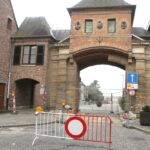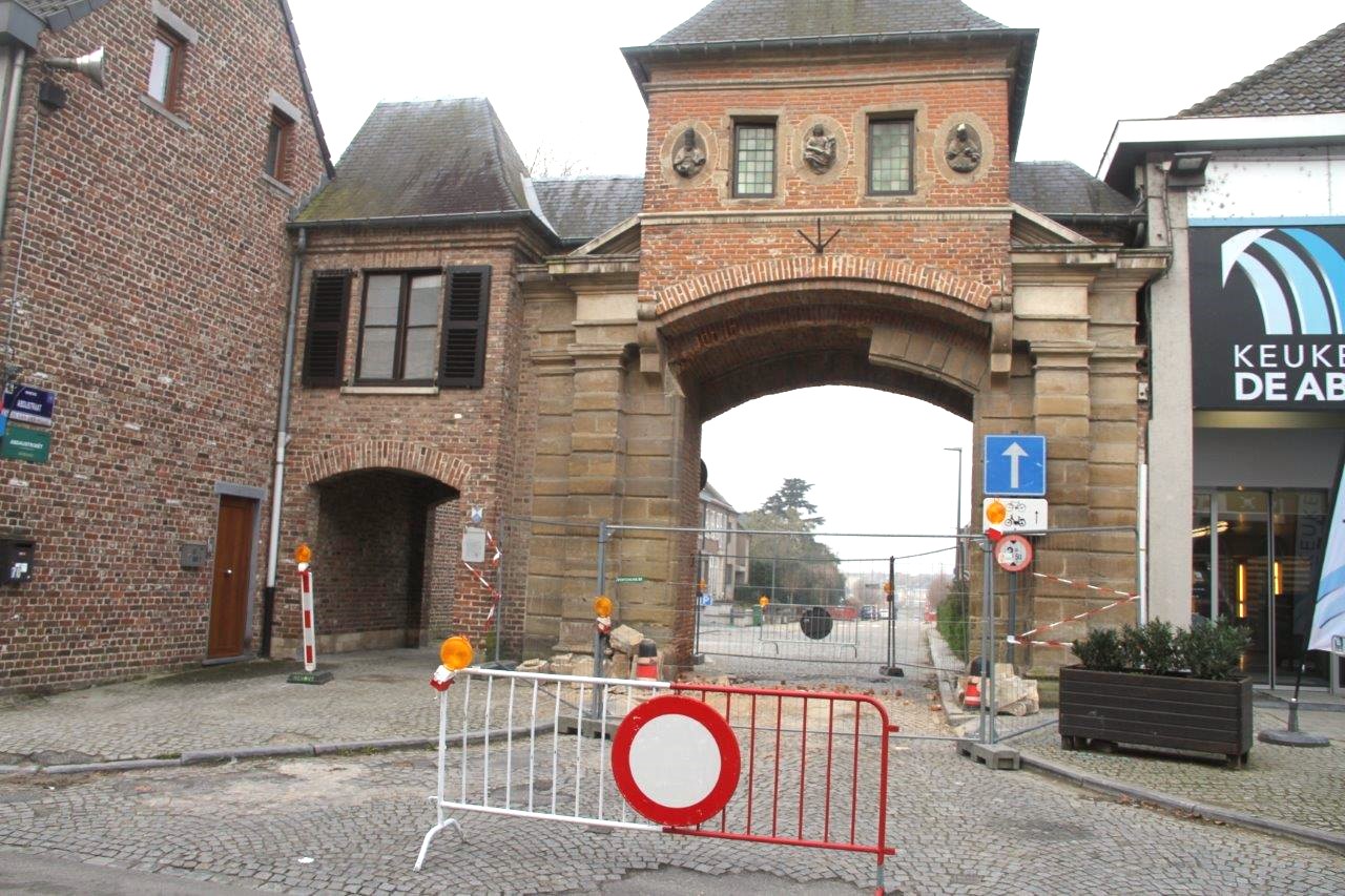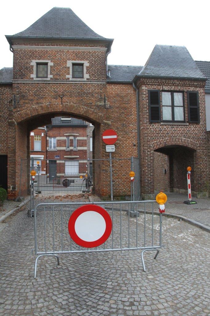 De toegang tot de Abdijstraat is volledig afgesloten. Voetgangers kunnen langs de onderdoorgang links van de poort nog wel passeren.