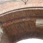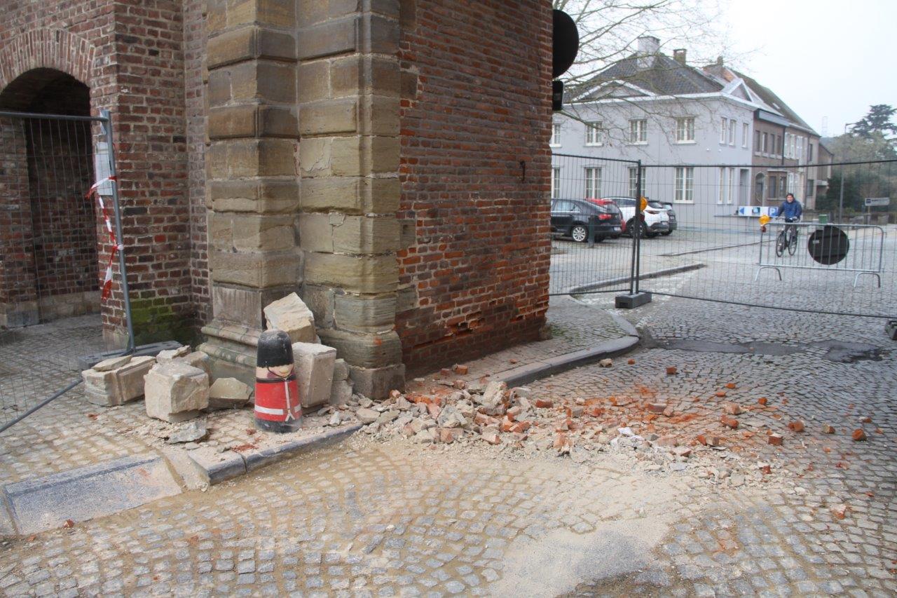 De vrachtwagen was te hoog voor de onderdoorgang van de poort, waardoor de boog van de toegangspoort ernstig werd beschadigd en de zware stenen naar beneden vielen.
