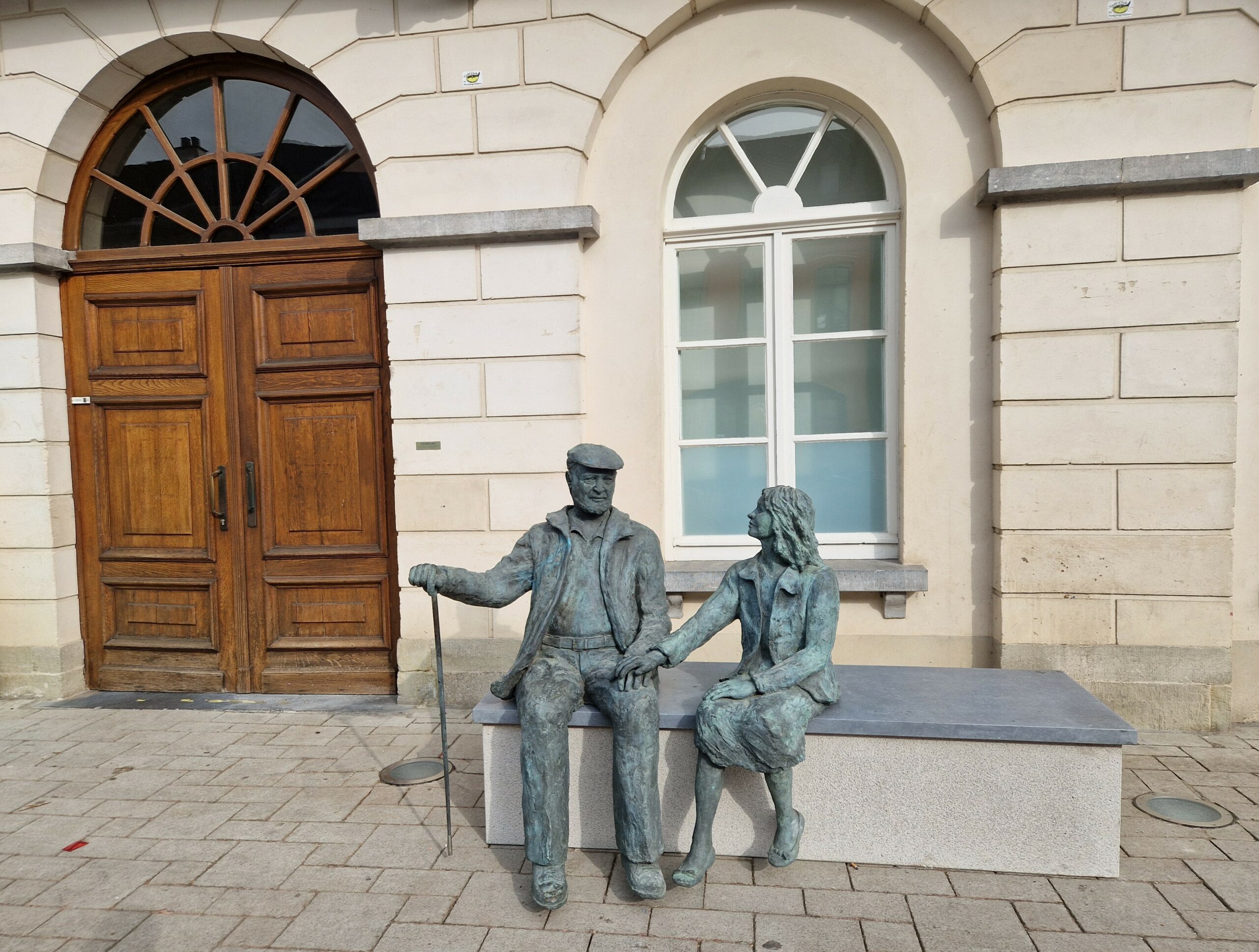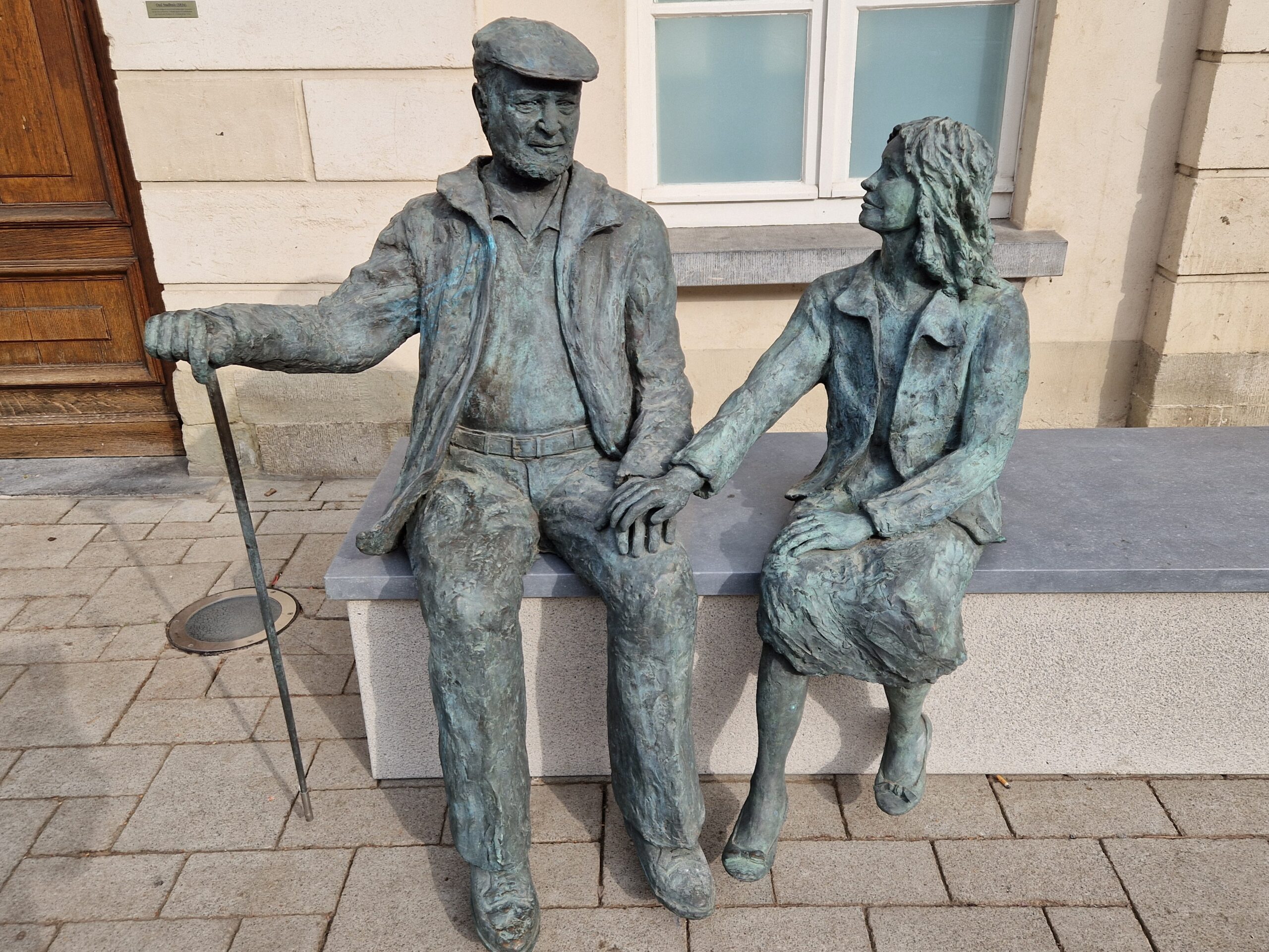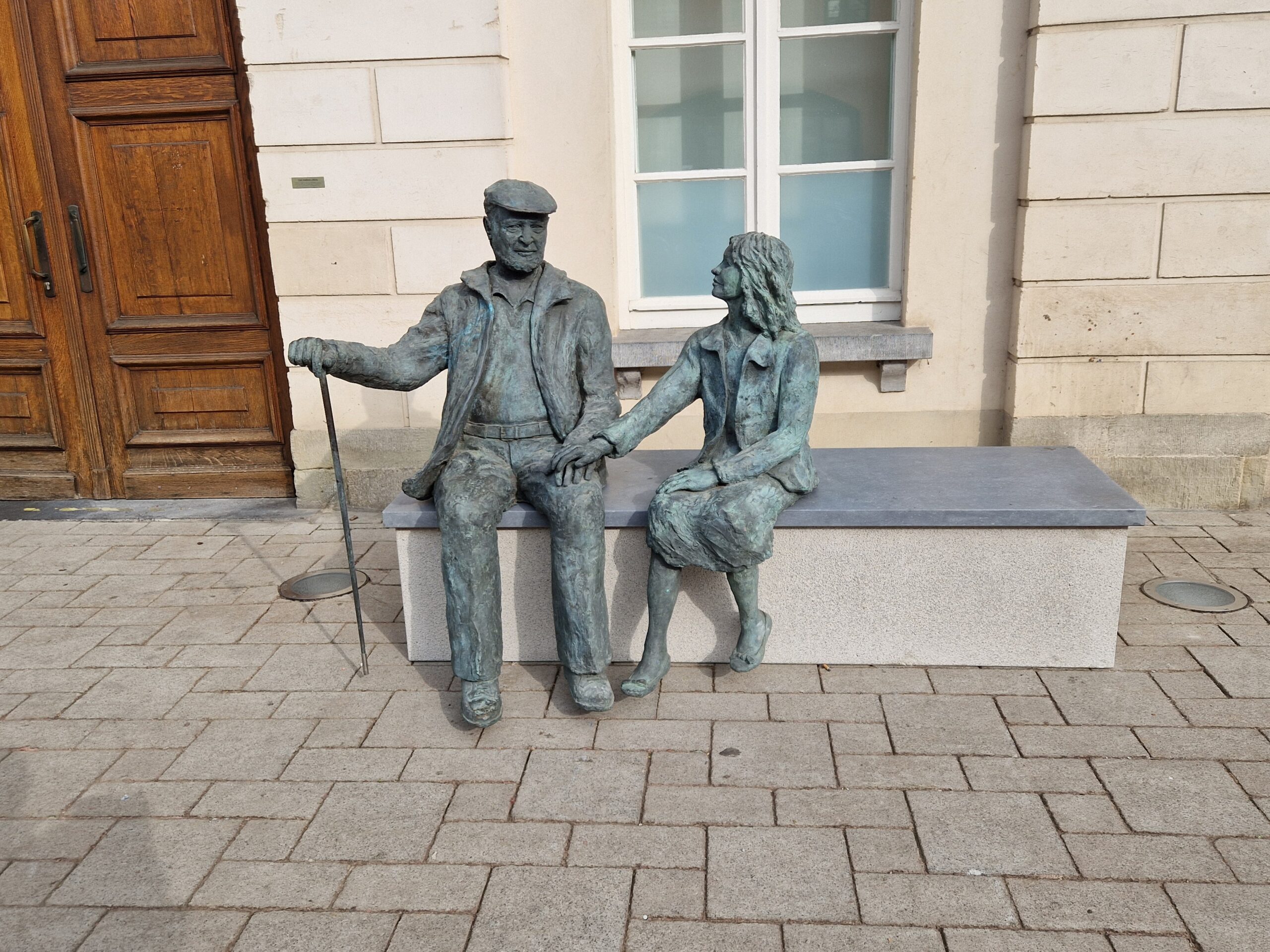 De stad kocht dat beeld van kunstenaar Michal in 2010 aan. ‘De lange weg’ symboliseert de levensweg van een mens tussen jong zijn en ouder worden. Die beeldengroep van een grootvader en zijn kleindochter op een bank staat/zit niet toevallig voor het Oud Stadshuis. Daar kwamen en komen mensen langs op kernmomenten van hun leven.