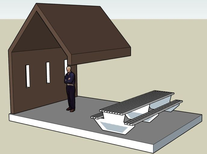 De stad Ninove en de dienst cultuur reageerden eveneens positief en contacteerden kunstenaar Sam Dendooven uit Aspelare om een ontwerp te maken. De kapelvormige constructie in cortenstaal (4,5 m h., 4 m d. en 3,5 m br.) is verankerd in een betonnen sokkel (7 m x 4 m). De gesloten westgevel heeft drie verticale doorkijkopeningen. De tafel en banken vormen één geheel en kunnen van onder het gewelf naar buiten worden gerold op wieltjes: in de winter onder de overkapping en in de zomer erbuiten.