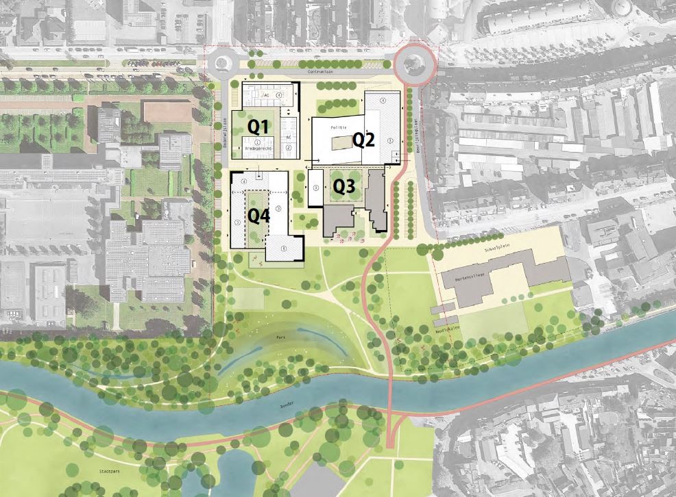 De 4 verschillende kwadranten worden omringd door groen. Tussen de huidige administratieve site en de Dender voorziet het plan één grote groene zone. “Door dit terrein te ontharden, komt er een extra natuurlijke waterbuffer in de stad, die wateroverlast kan helpen tegengaan. De uittekening van het gebied ontstond in overleg met ‘Ruimte voor Water’, waarin onder meer de Vlaamse Waterweg, de Vlaamse overheid en de provincie Oost-Vlaanderen zitten. Deze zone koppelt het nuttige aan het aangename, doordat ze de Denderoever met haar prachtige natuur ook de stad binnentrekt.”