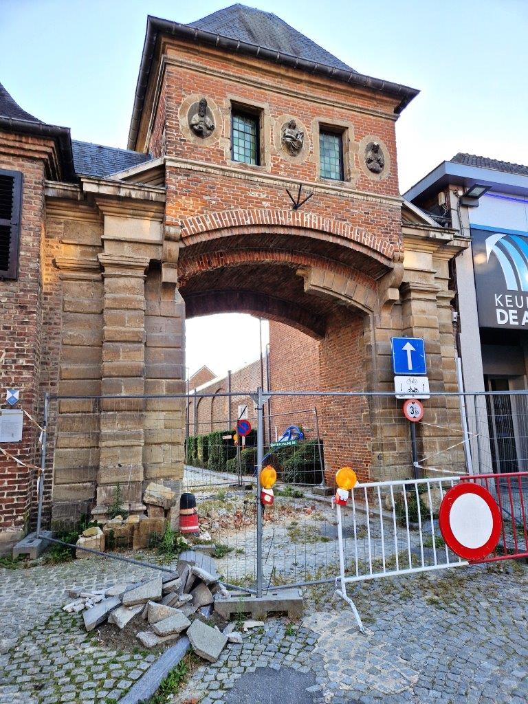 Een vrachtwagen was donderdagochtend 7 maart te hoog voor de onderdoorgang van de poort, waardoor de boog van de toegangspoort ernstig werd beschadigd en zware stenen naar beneden vielen.