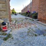 Ondertussen zijn we 5 maand later en is er letterlijk nog geen steen verlegd. De brokstukken liggen nog op exact dezelfde plaats, als waar ze zijn naar beneden gekomen. Tussen de kasseistenen groeit inmiddels gras.