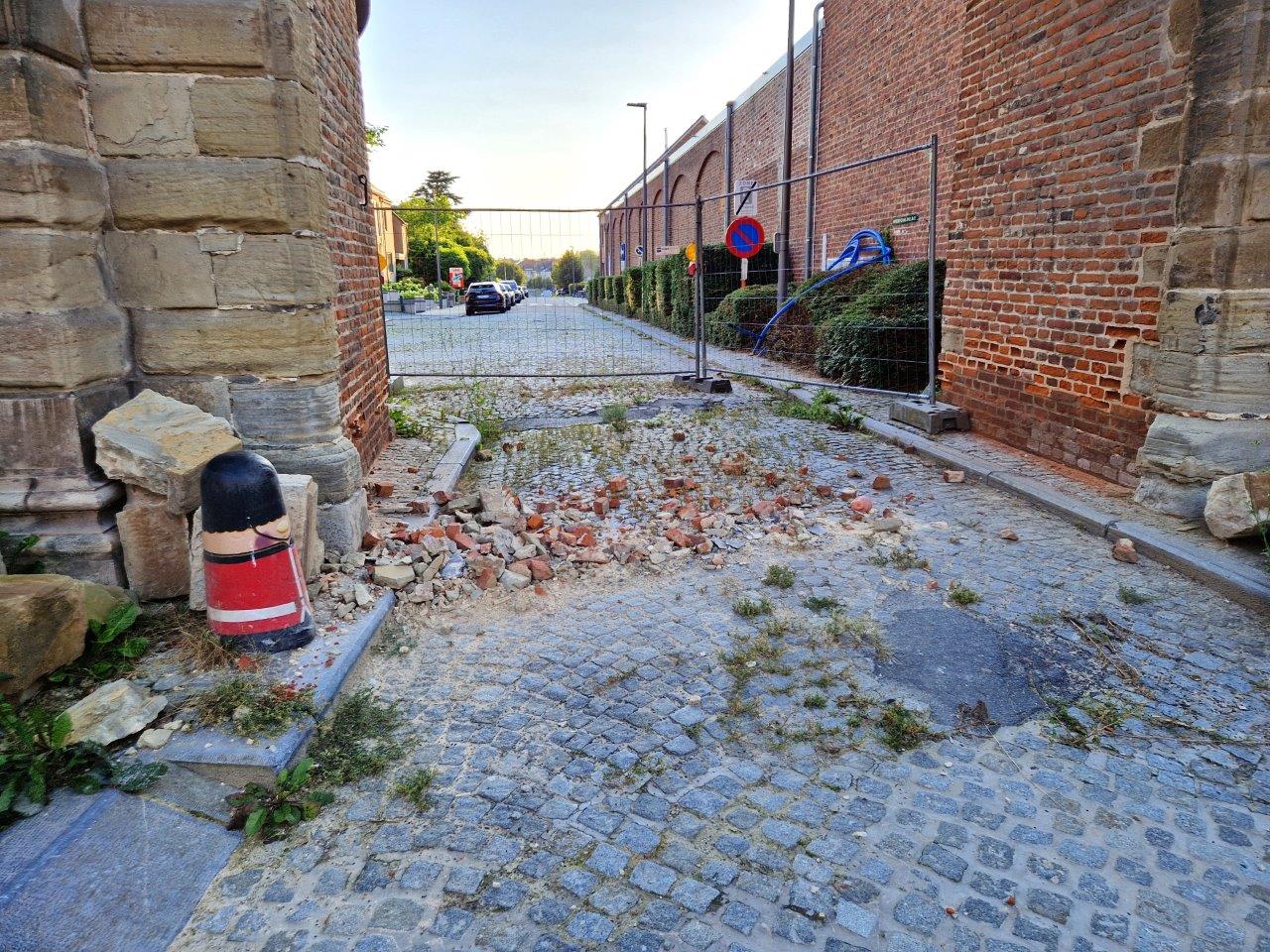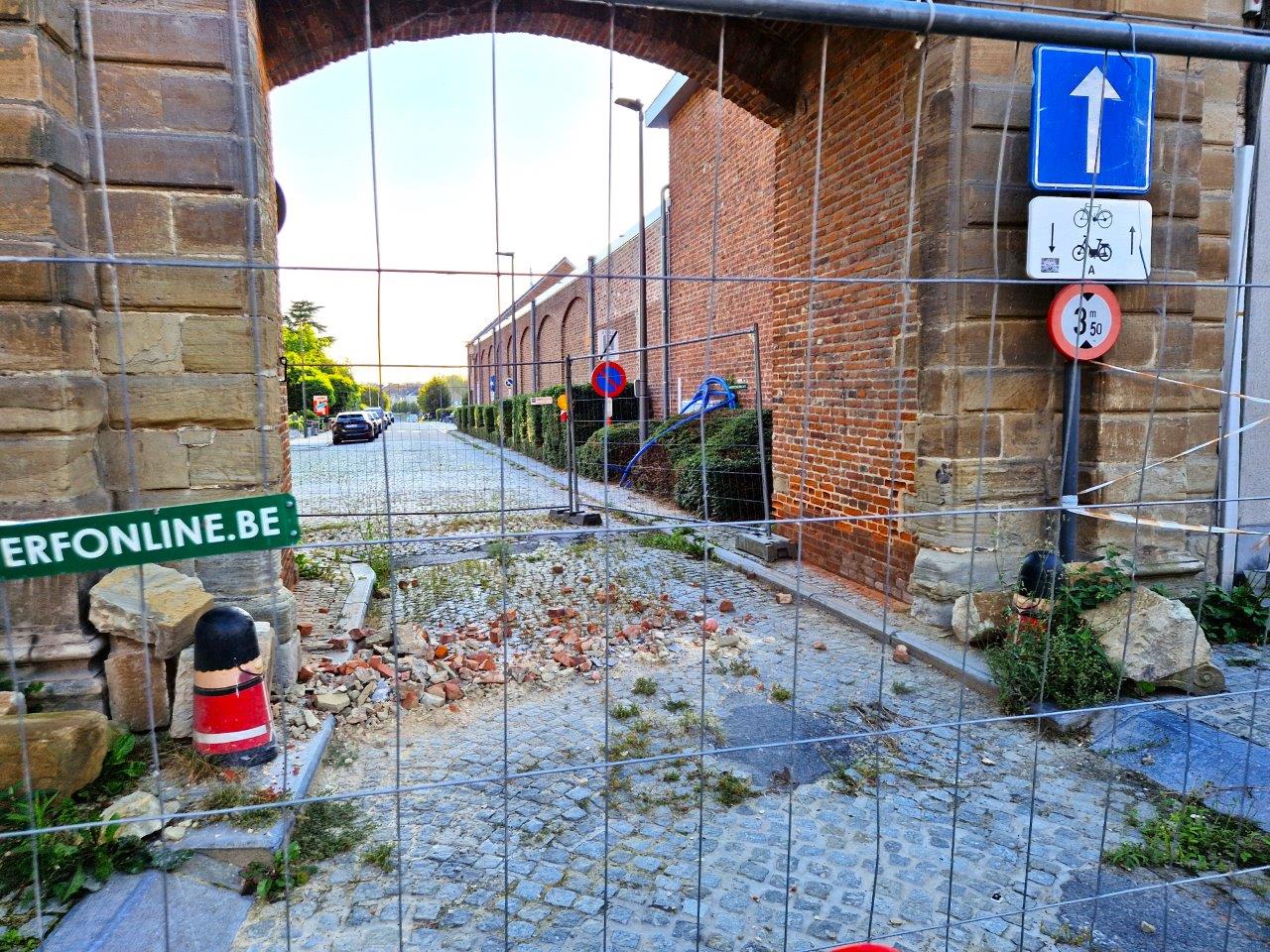 De toegang tot de Abdijstraat blijft volledig afgesloten in afwachting van de herstelling. Voetgangers kunnen langs de onderdoorgang naast de poort nog wel passeren.