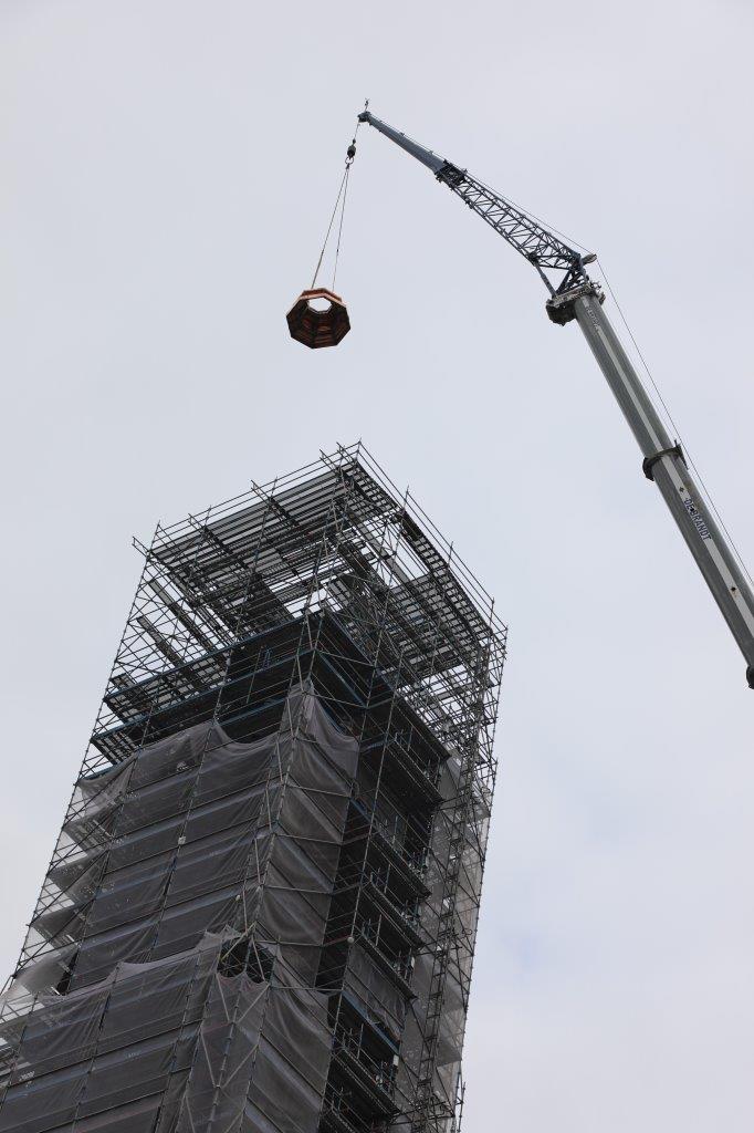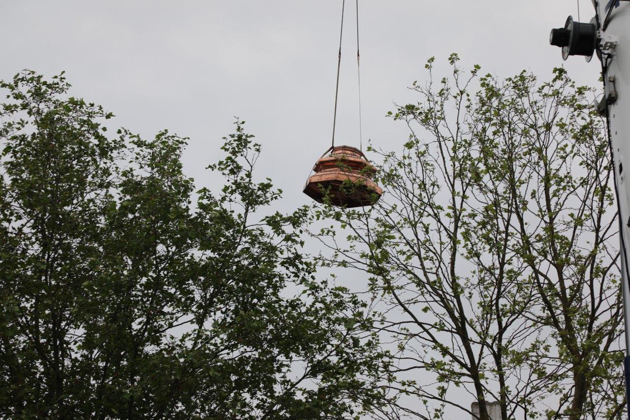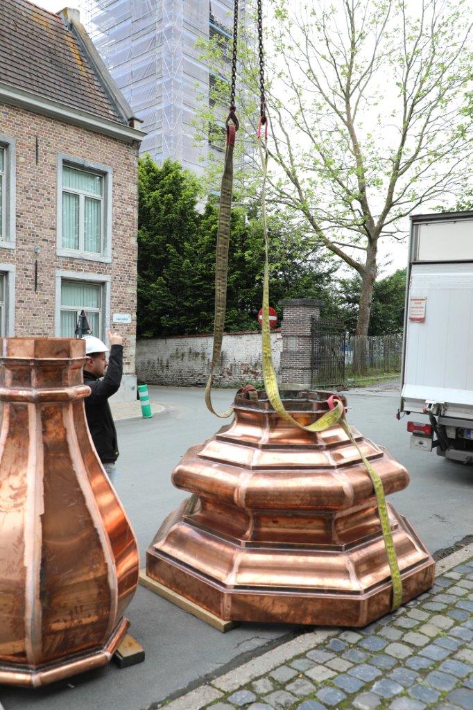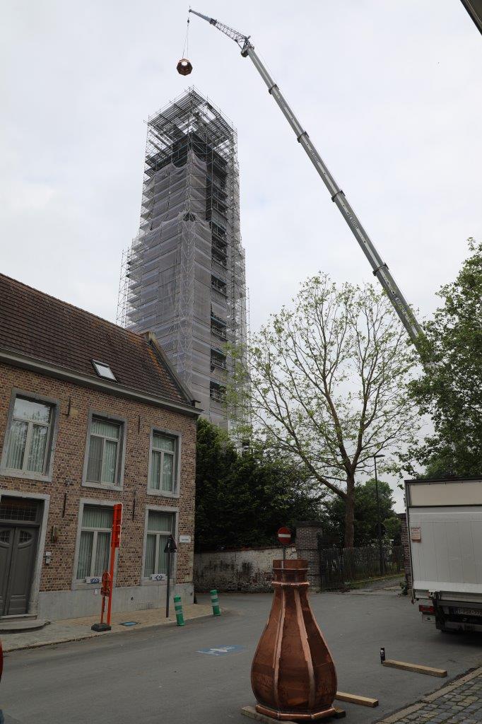 NINOVE – Met een grote kraan zijn donderdag 30 mei de nieuwe koperen koepel en het vergulde kruis bovenop de gerestaureerde toren geplaatst. Een precisiewerkje, dat we van nabij hebben gevolgd.