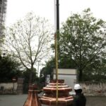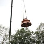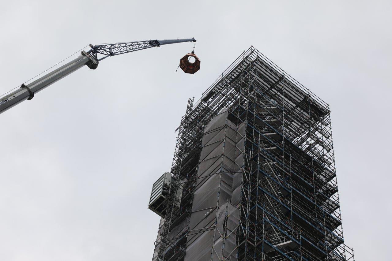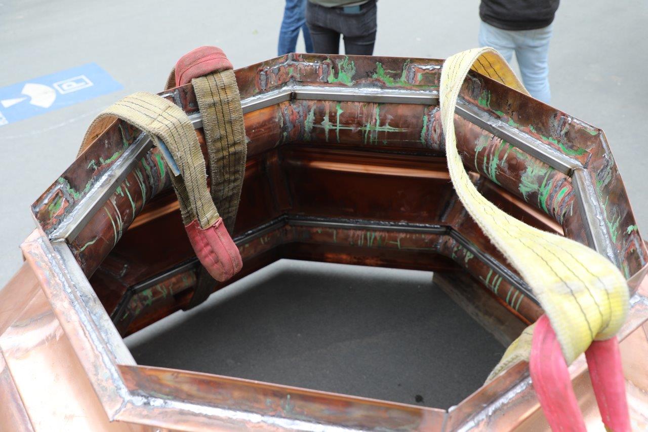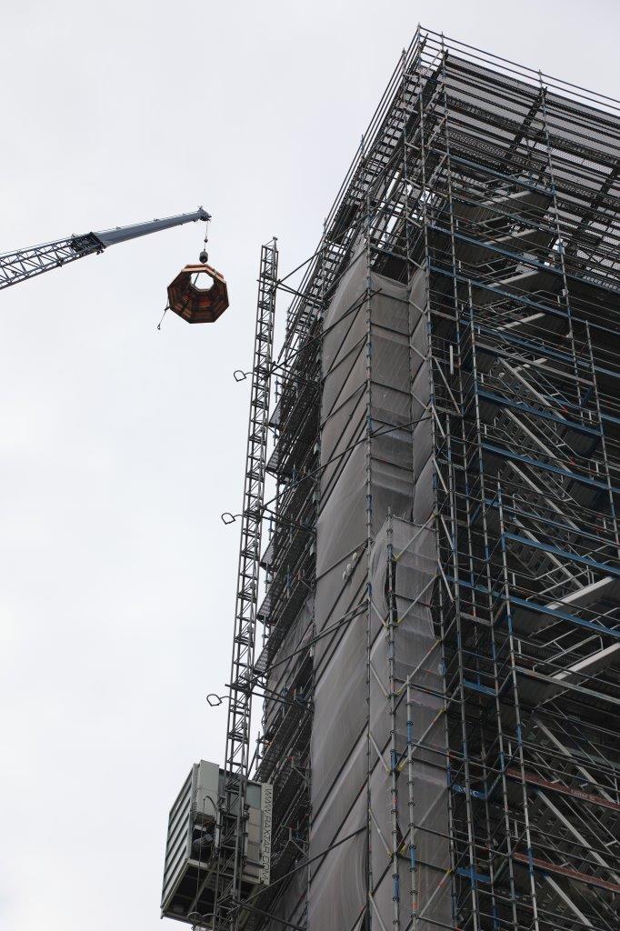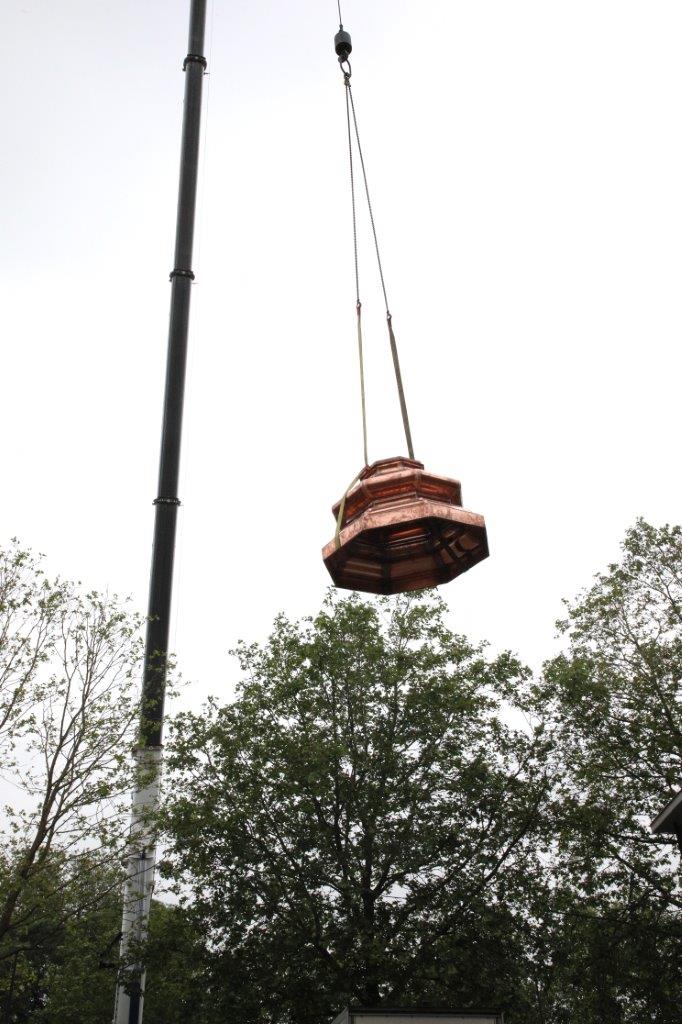 NINOVE – Met een grote kraan zijn donderdag 30 mei de nieuwe koperen koepel en het vergulde kruis bovenop de gerestaureerde toren geplaatst. Een precisiewerkje, dat we van nabij hebben gevolgd.