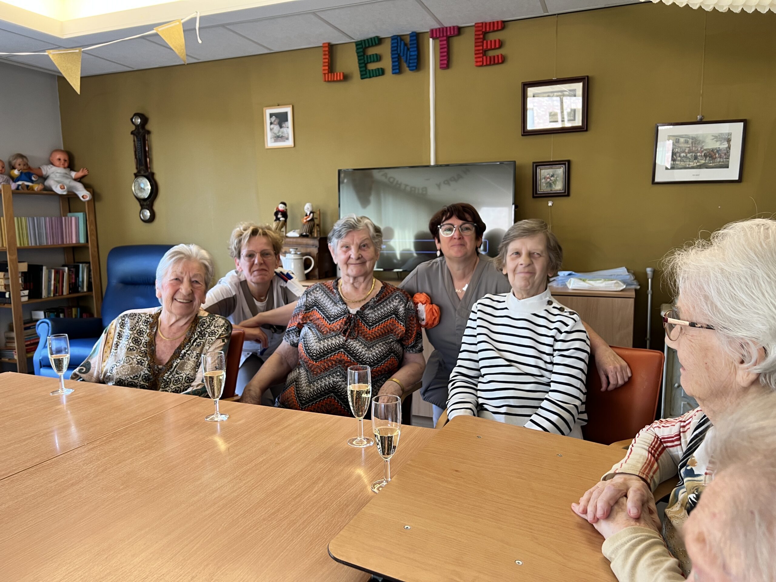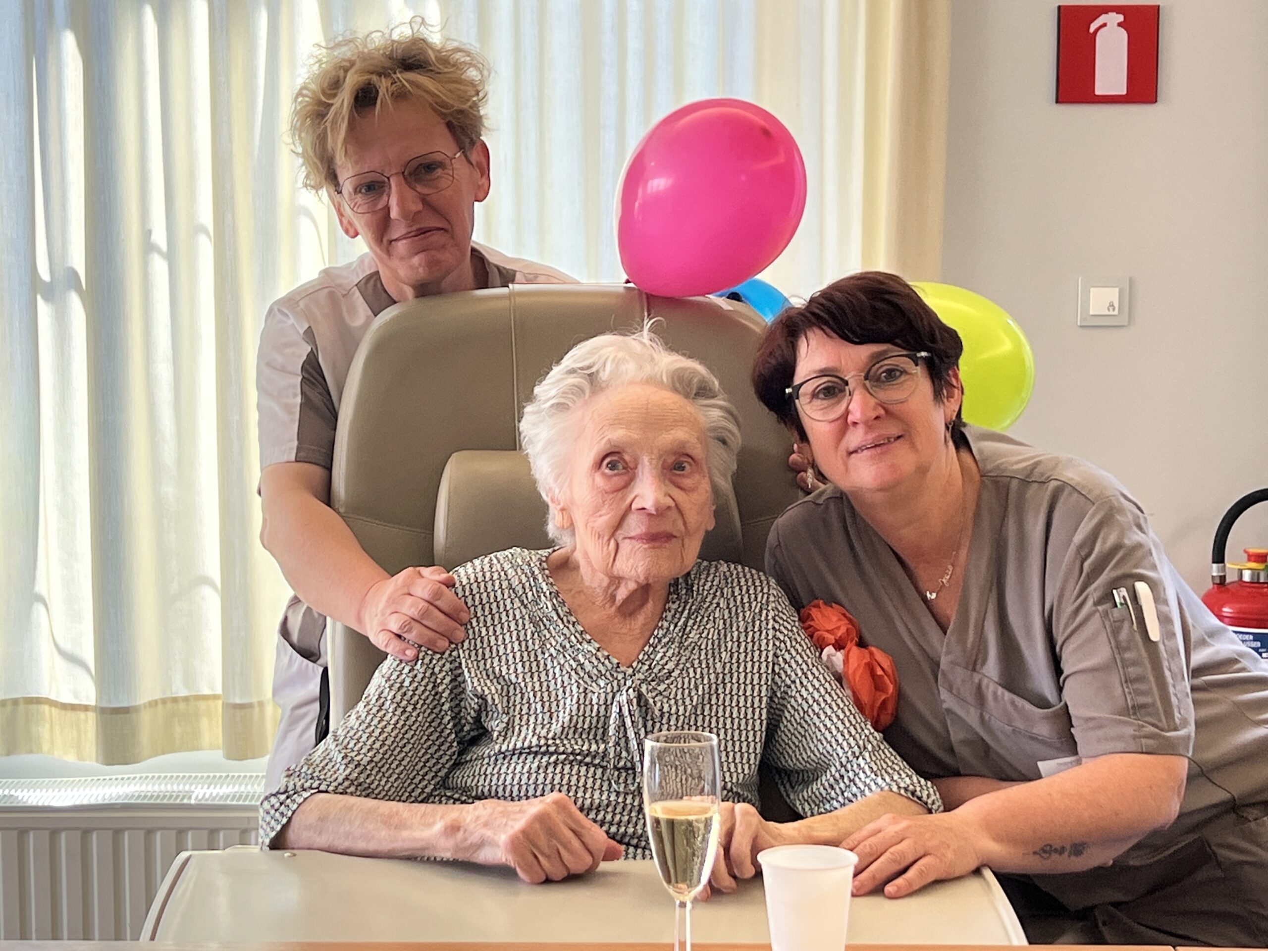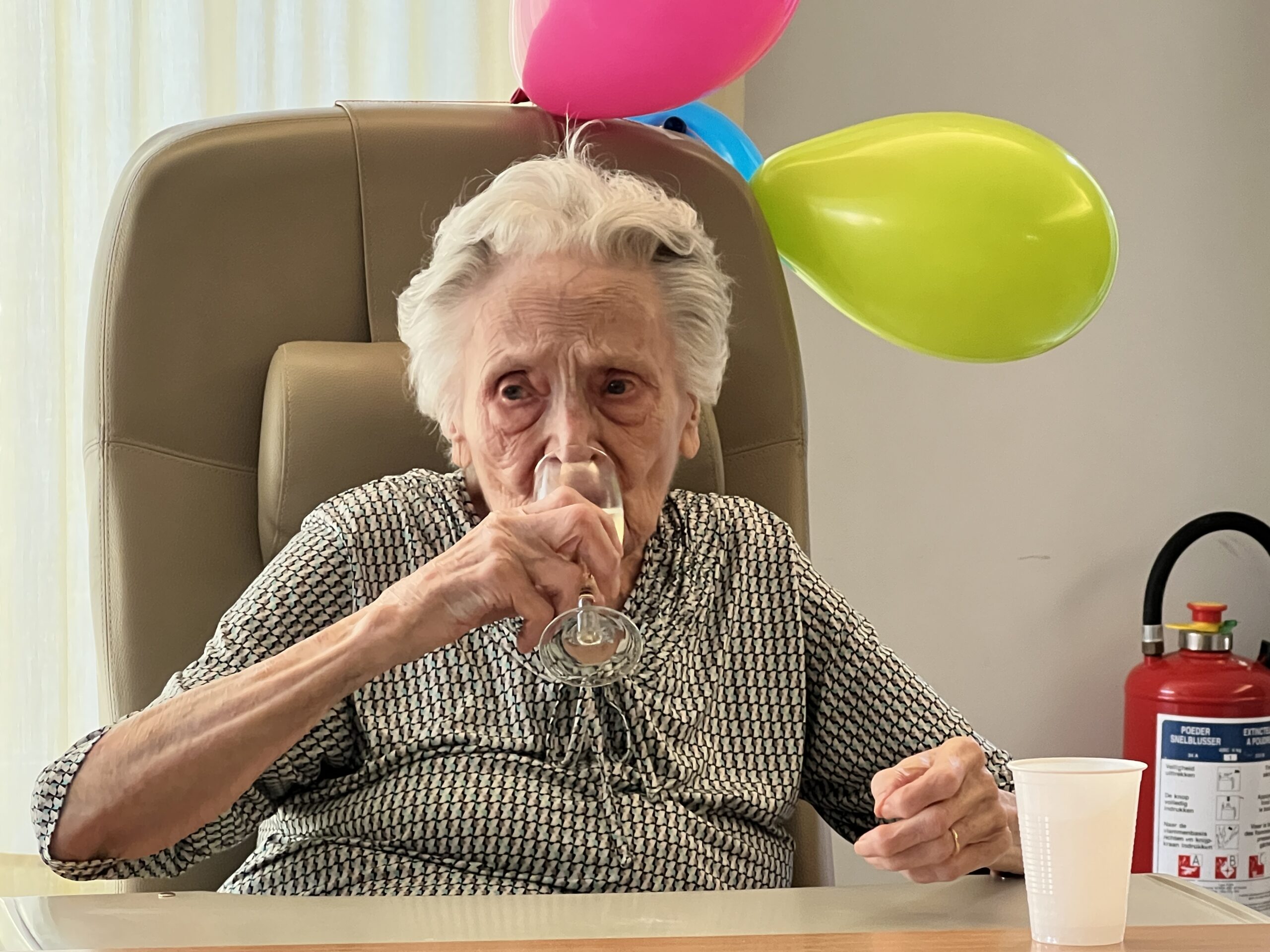 De schepen voor sociale zaken Veerle Cosyns kwam ook even langs. Een bloemstuk en een glaasje cava maakten het verjaardagsfeestje compleet.
