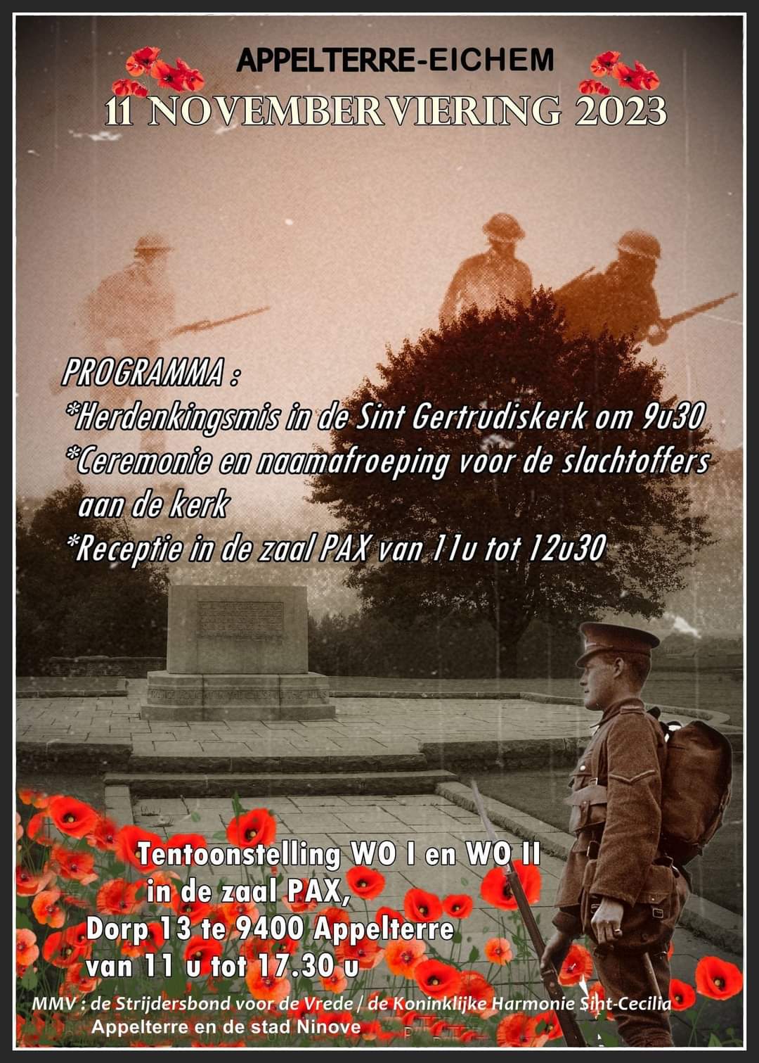 Zaterdag 11 november heeft de herdenking plaats in Appelterre-Eichem. Na de eucharistieviering om 9.30 uur in de St.-Gertrudiskerk, volgt om 10.15 uur een bloemenhulde door het stadsbestuur en de vaderlandslievende verenigingen aan het monument op het kerkplein. Daar heeft ook de naamafroeping van de slachtoffers plaats. Een klaroenblazer en de Koninklijke Harmonie Sint-Cecilia luisteren de plechtigheid op.