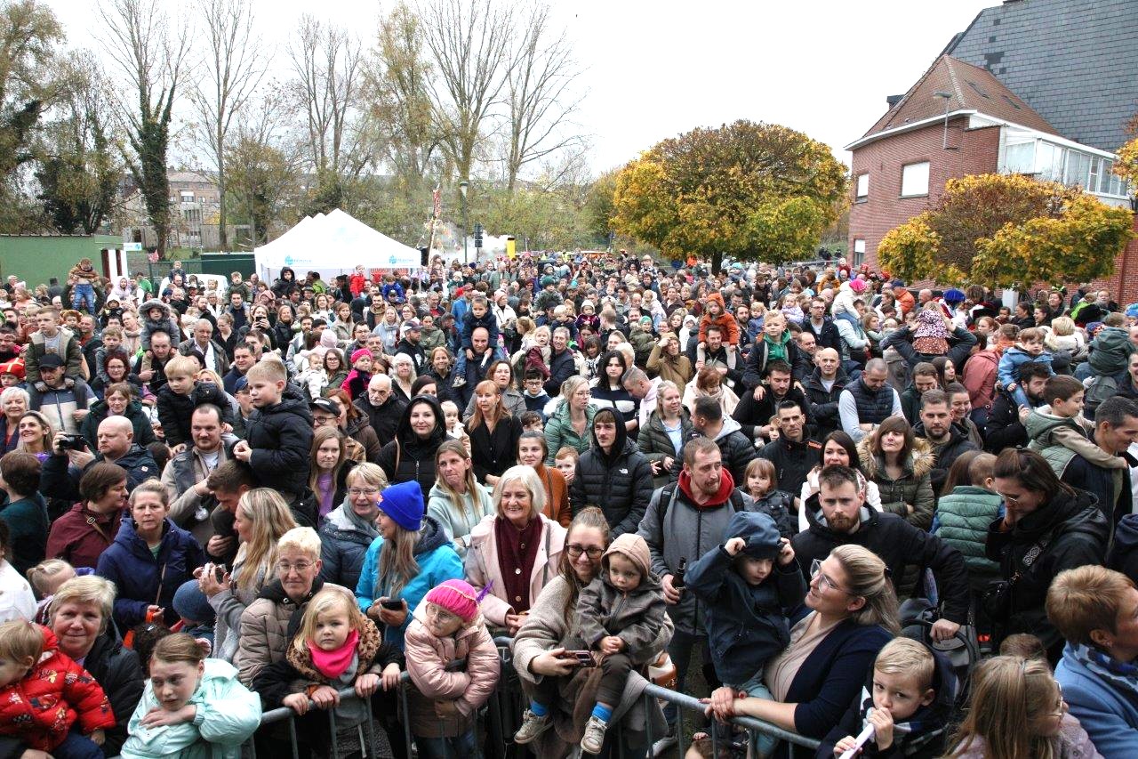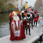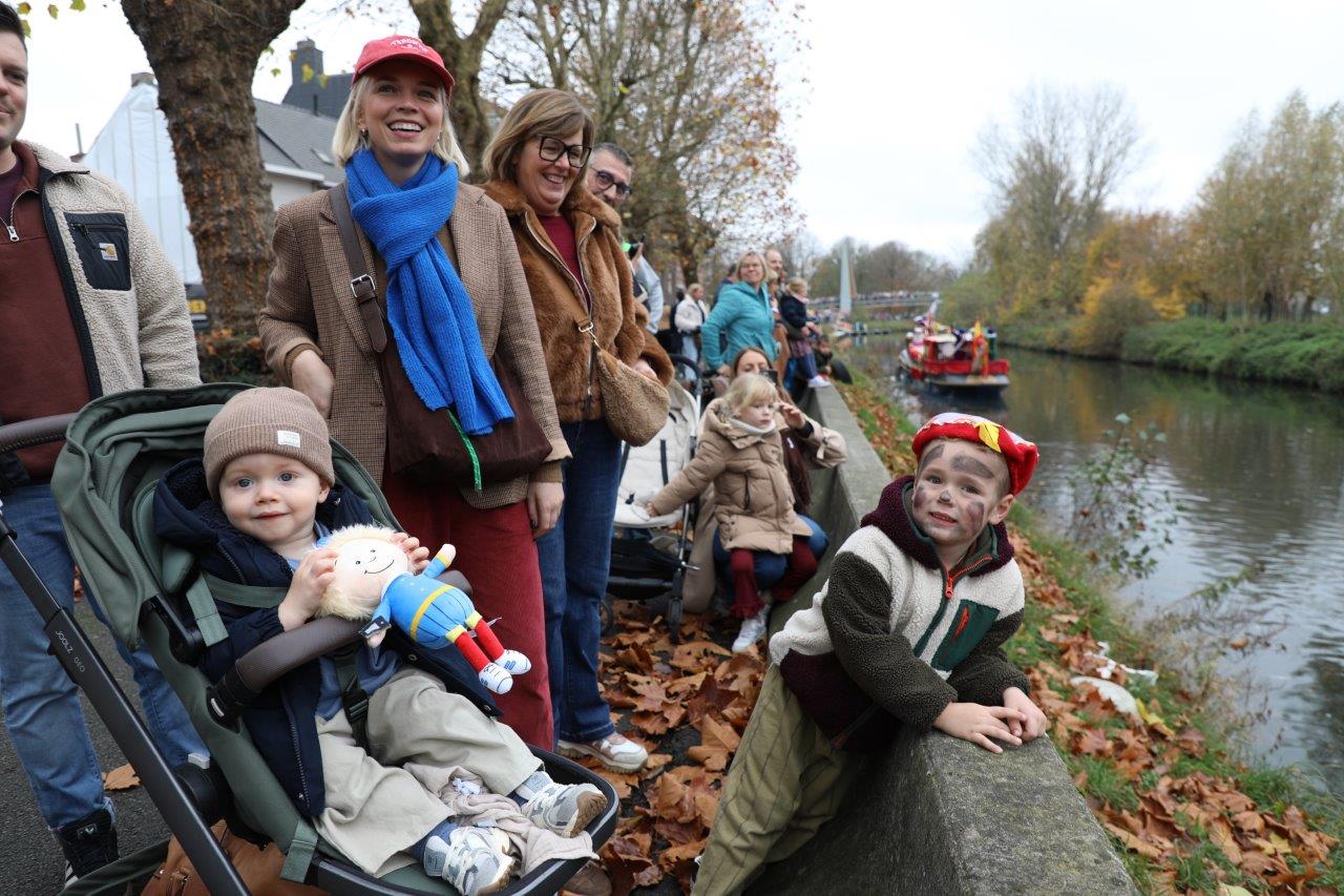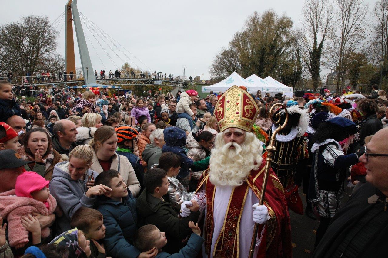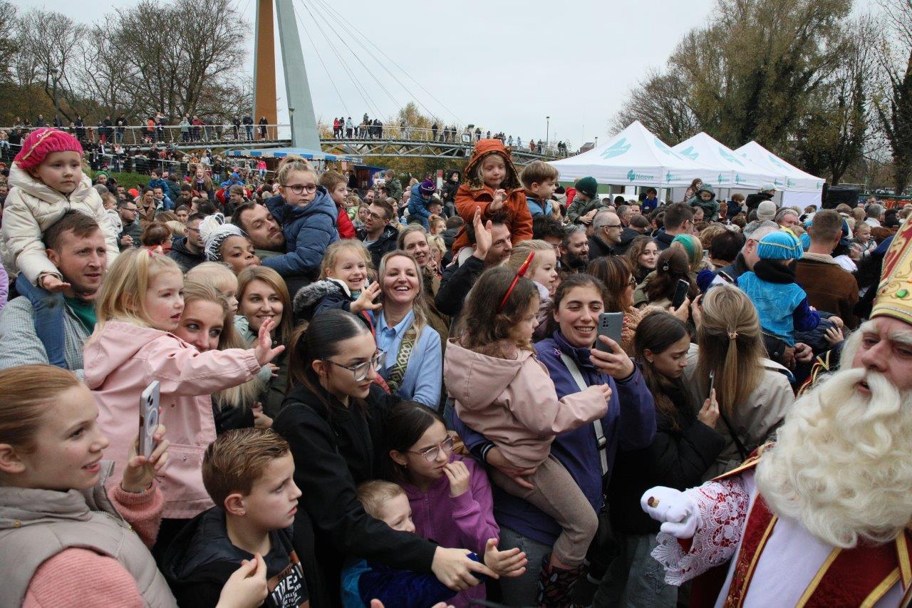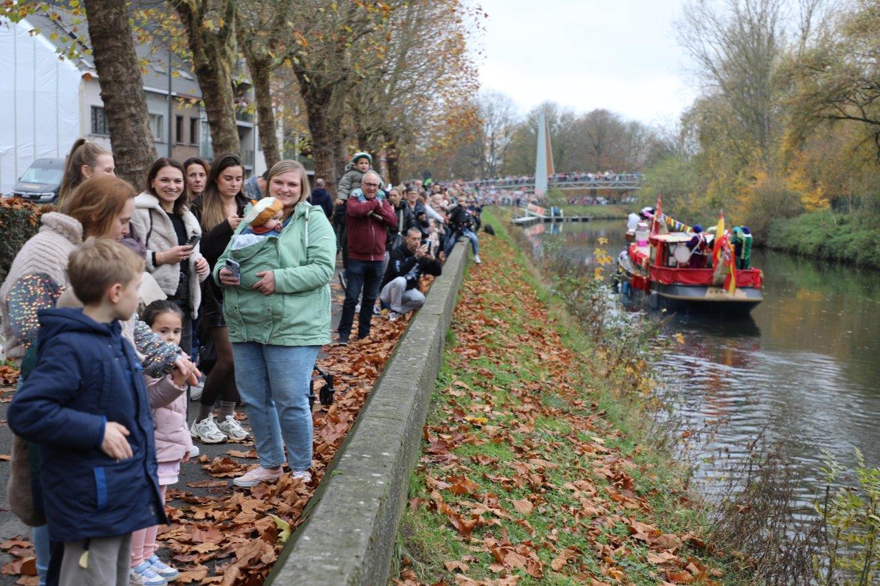 De boten meerden aan ter hoogte van ’t Oeverstekske, waarna de Sint en zijn gevolg zich door de massa een weg baanden naar het podium op de Ganzenweide.