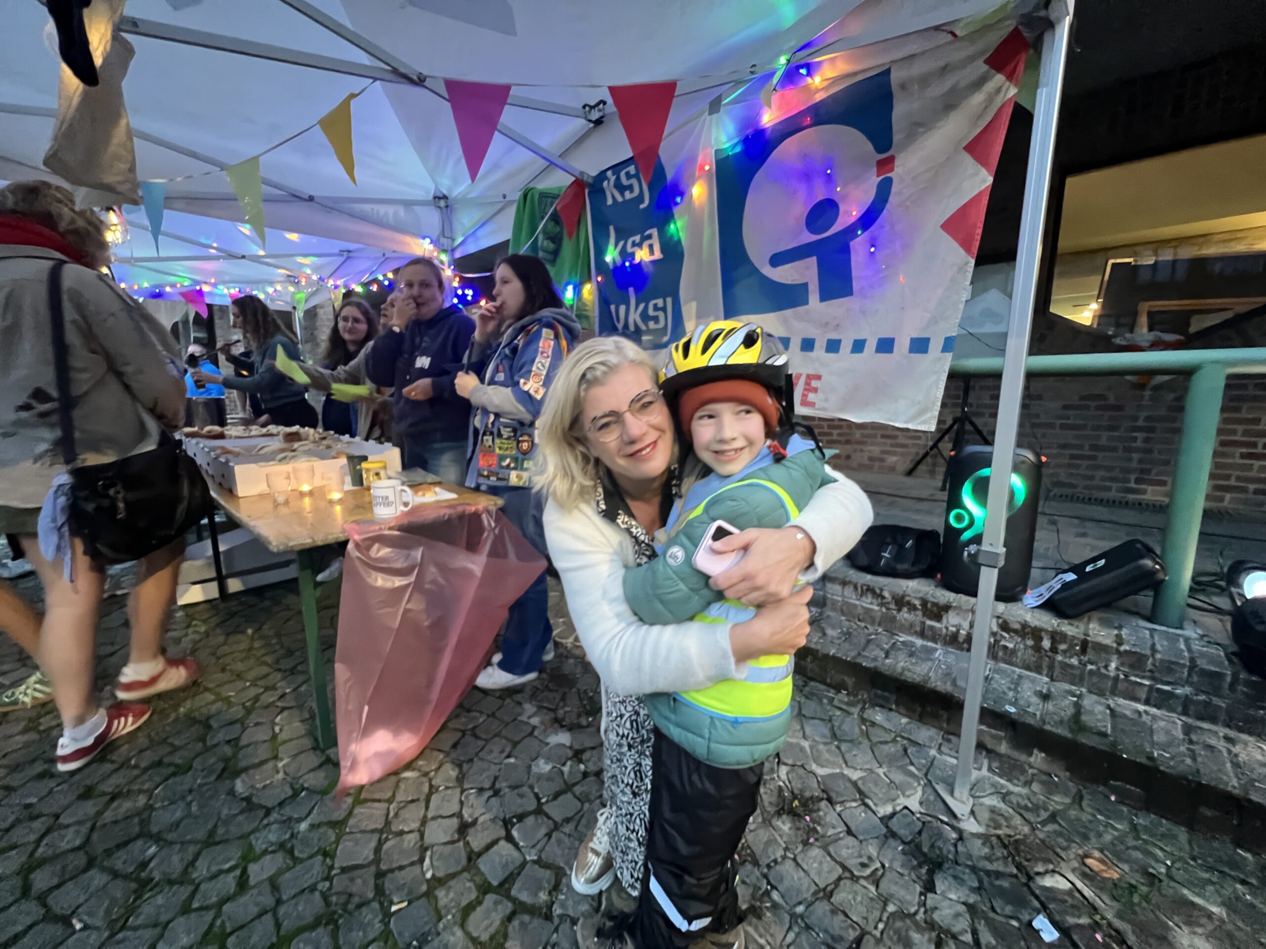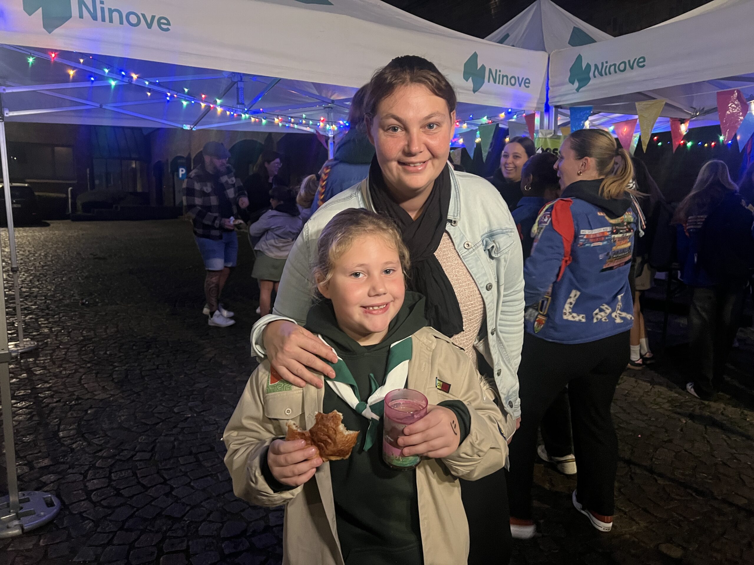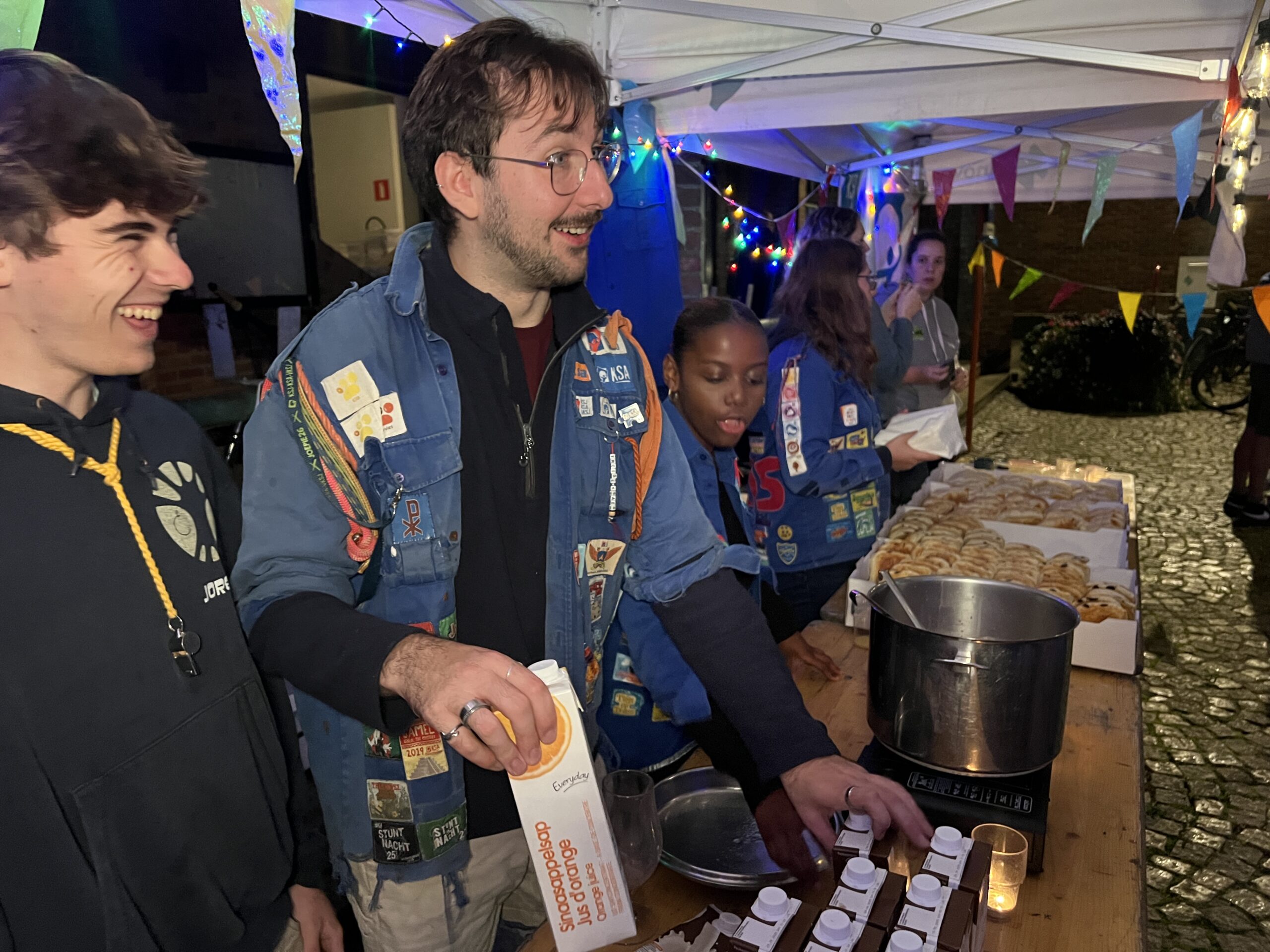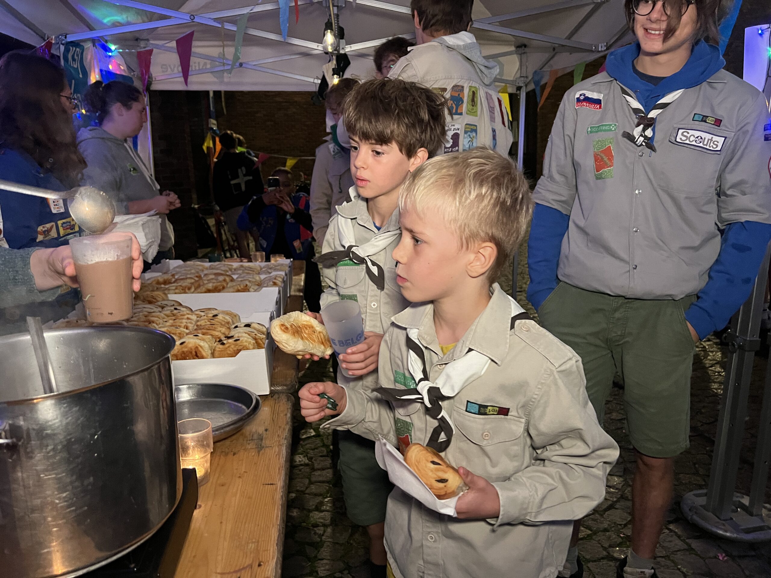 Ze konden hier gratis genieten van koffiekoeken en warme chocomelk onder twee voorwaarden: ze moesten hun jeugdbewegingsuniform dragen én een eigen beker meebrengen. Al keken de organisatoren hierop niet heel strikt toe, want burgemeester Tania De Jonge, een aantal ouders en onze reporter kregen ook wat warm lekkers toegestopt, zonder die toebehoren.