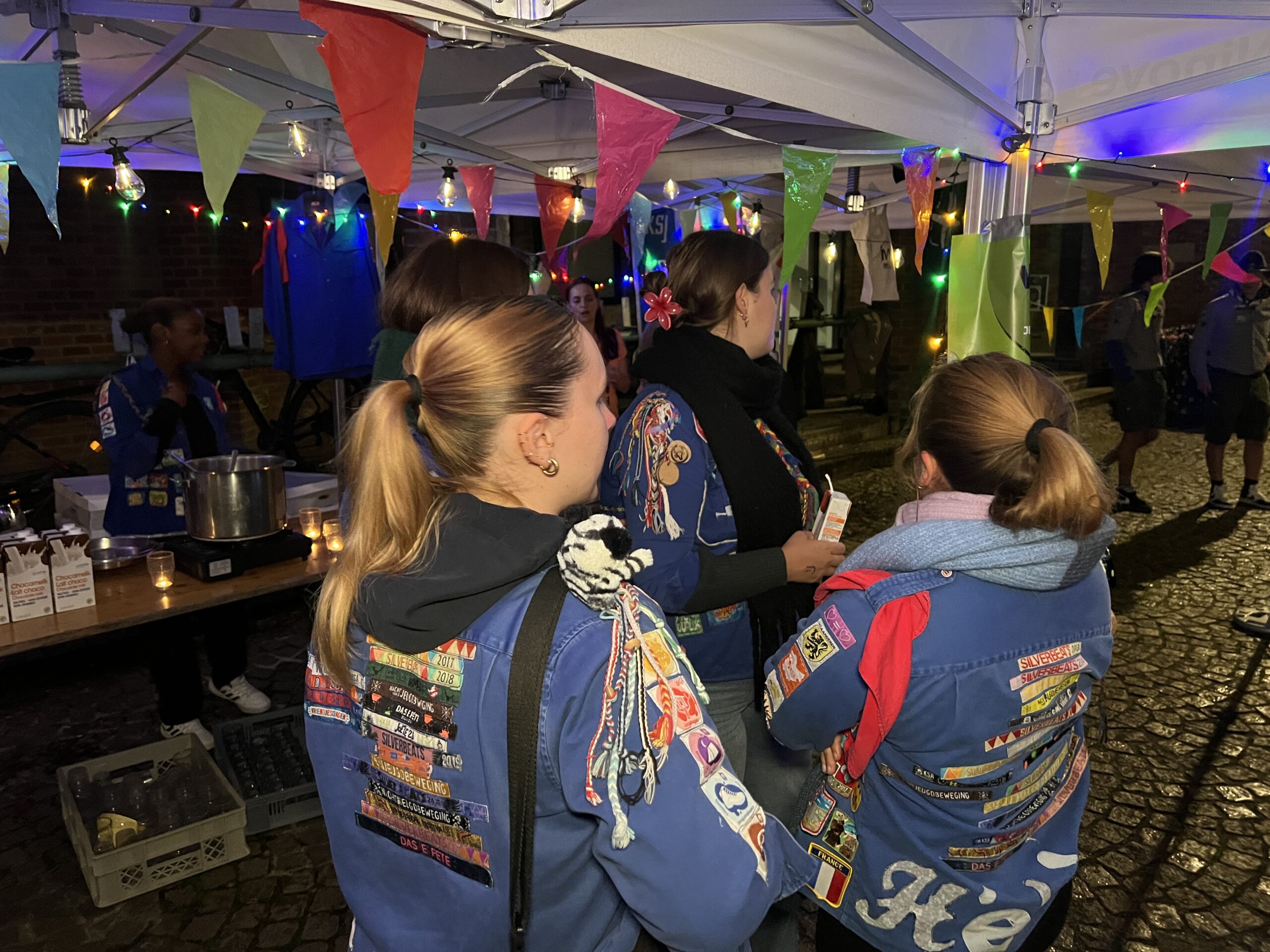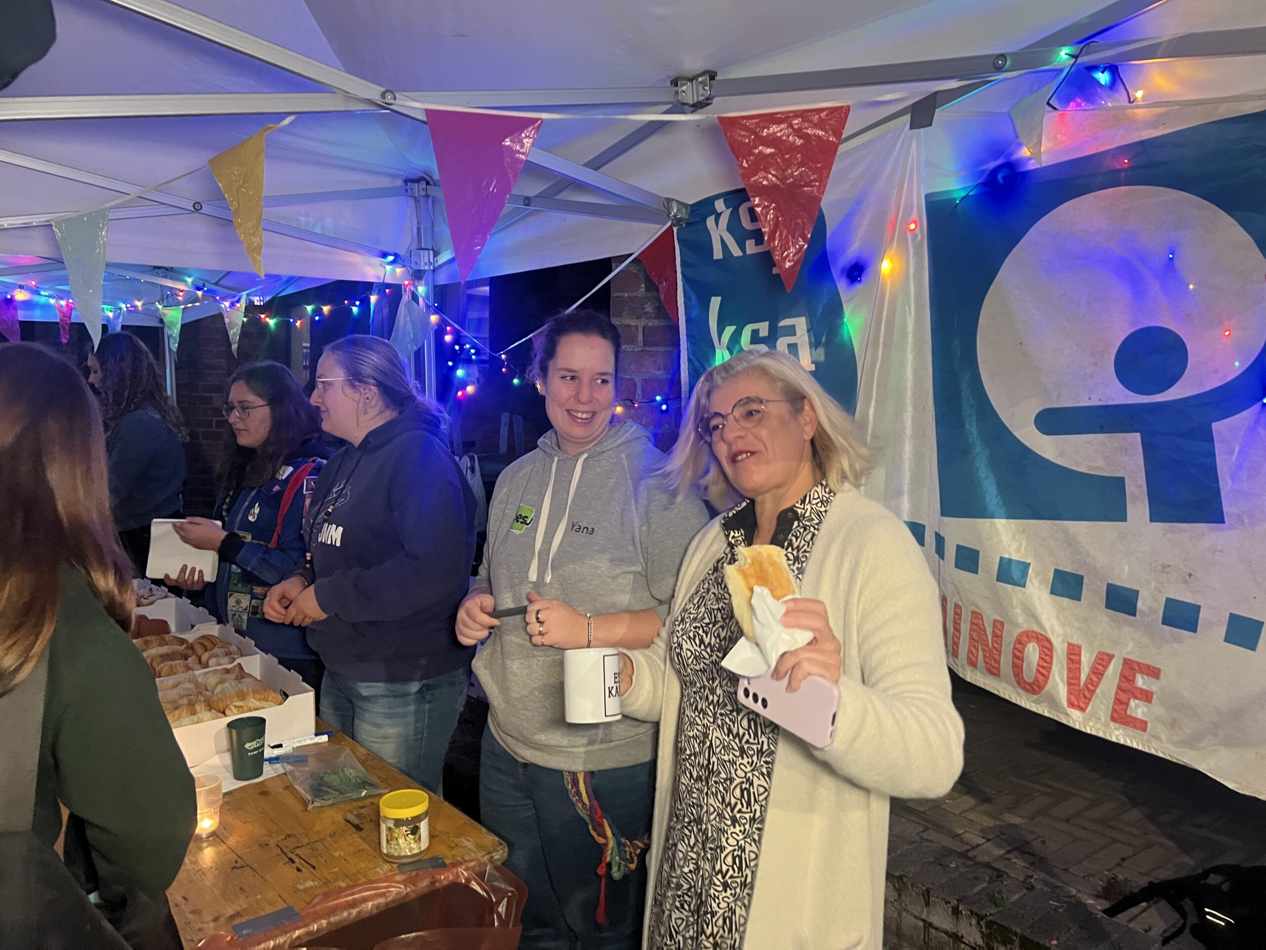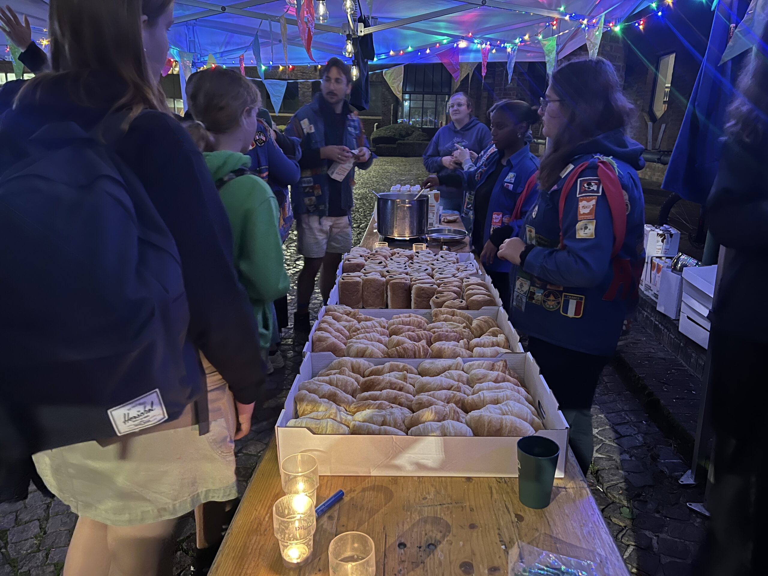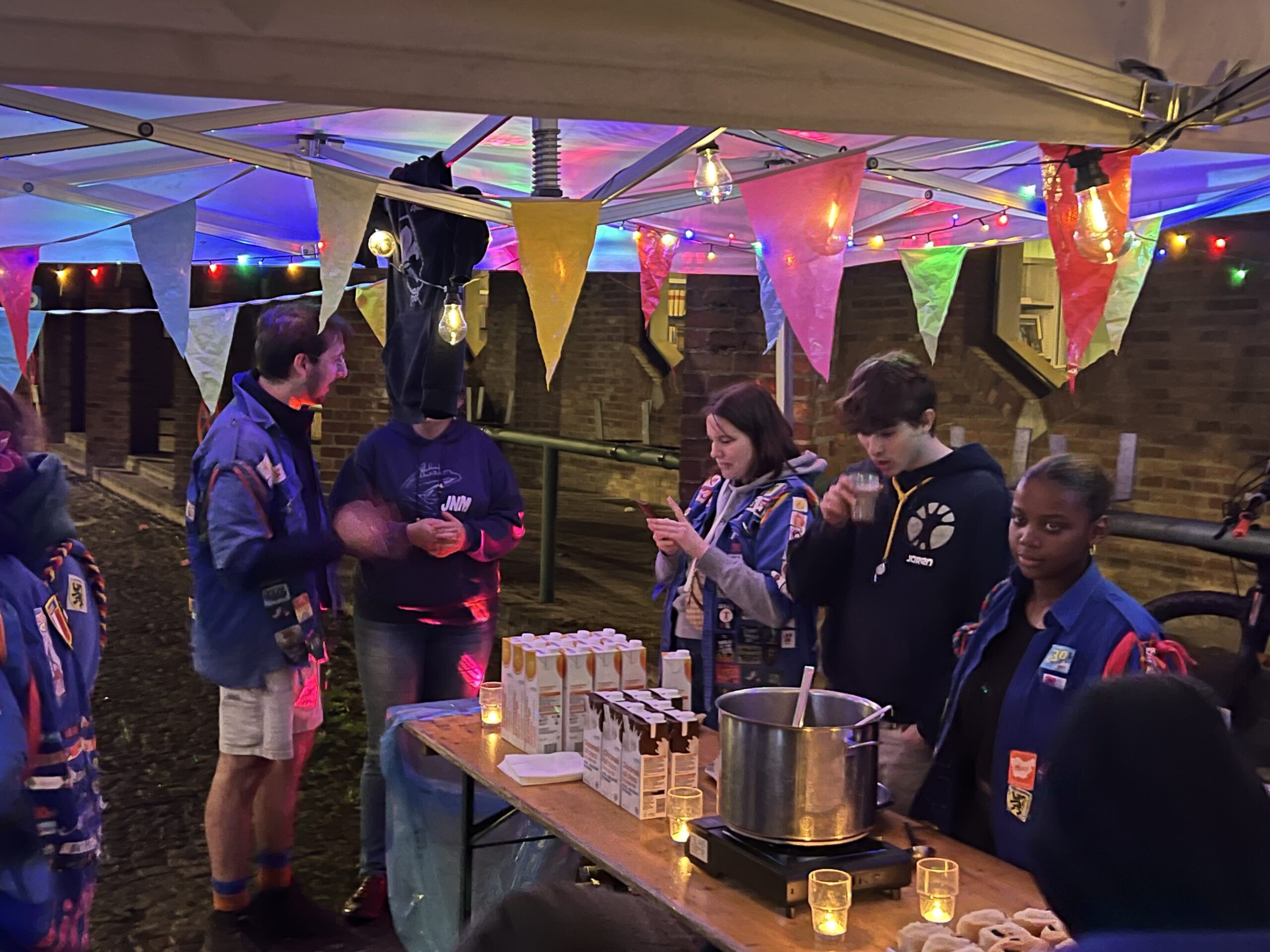 Ze konden hier gratis genieten van koffiekoeken en warme chocomelk onder twee voorwaarden: ze moesten hun jeugdbewegingsuniform dragen én een eigen beker meebrengen. Al keken de organisatoren hierop niet heel strikt toe, want burgemeester Tania De Jonge, een aantal ouders en onze reporter kregen ook wat warm lekkers toegestopt, zonder die toebehoren.