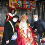 Na de show op het podium konden alle kinderen een zakje snoep afhalen bij de Sint. Ze mochten hem ook hun lijst met wensen overhandigen. Op zijn schoot zitten was niet mogelijk wegens de coronamaatregelen.
