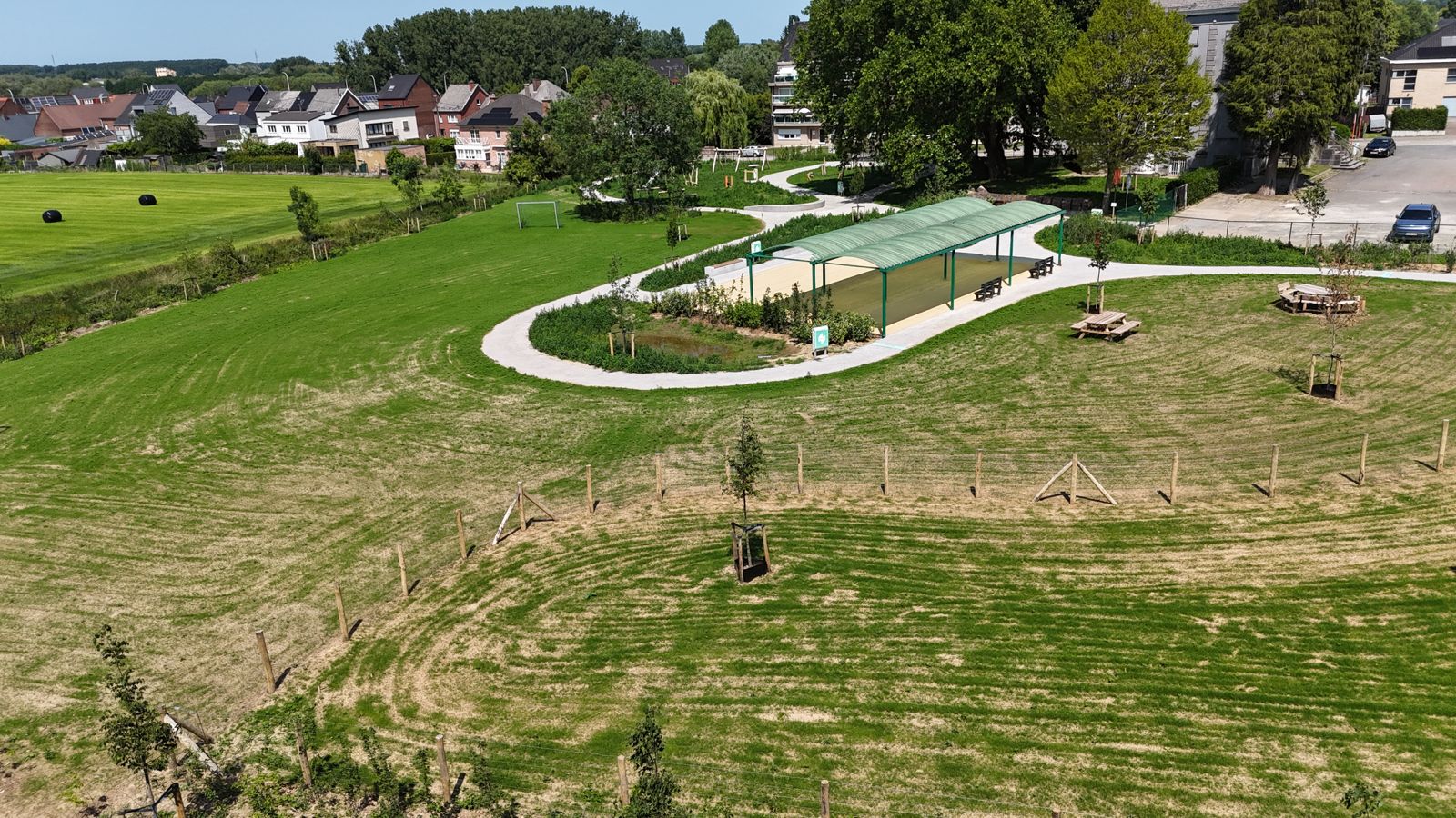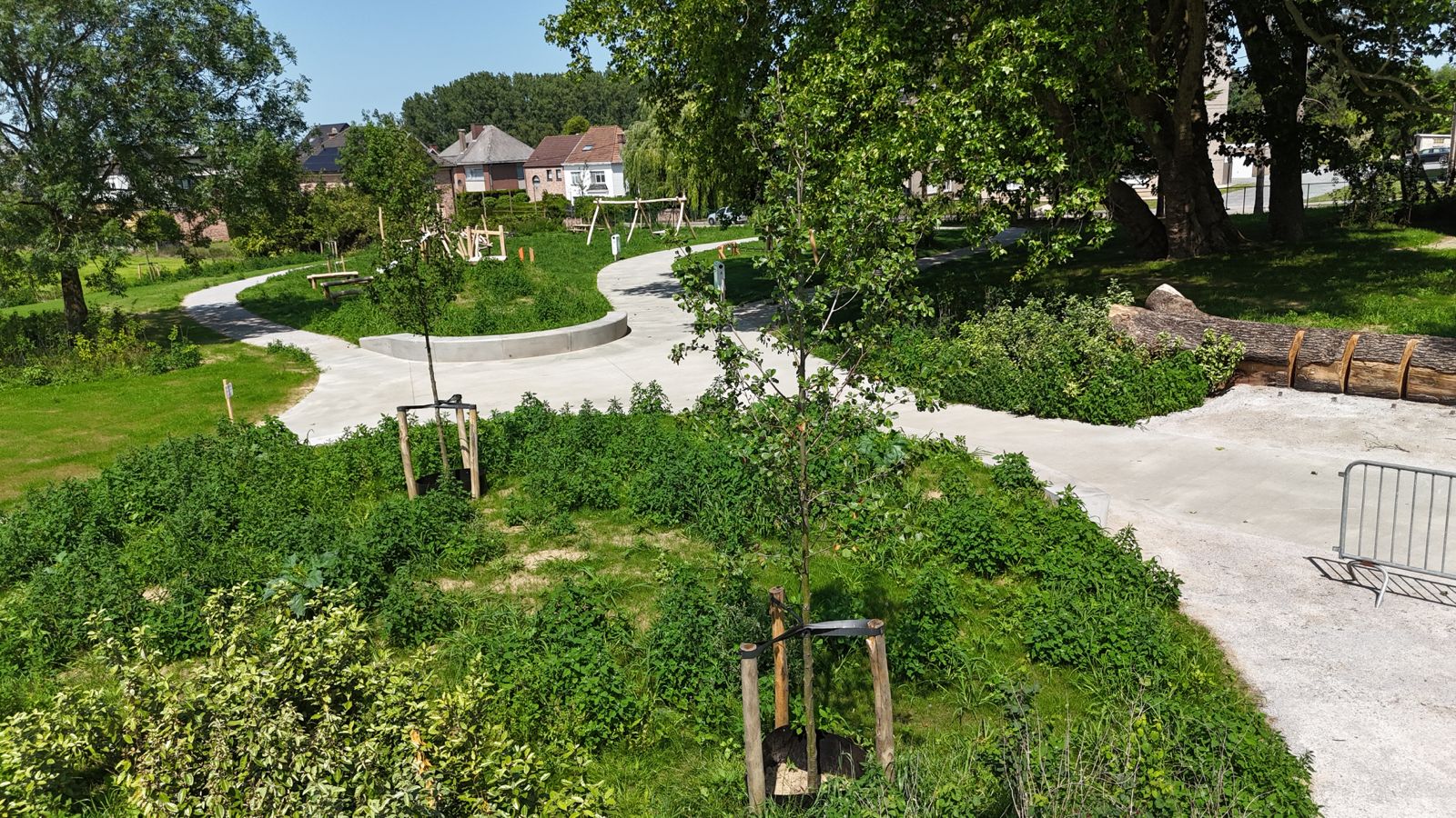 Het bestaande speelplein kreeg een grondige transformatie: een hondelosloopweide, nieuwe sport- en speeltuigen, 2 petanqueterreinen, waterdoorlatende voetpaden voor rolstoelgebruikers. Het moest een intergenerationeel en inclusief speelterrein worden. De omgehakte atlasceder kreeg als zitbank een nieuwe functie. Het ingezaaide grasperk is nog niet helemaal doorgegroeid, maar dat komt op termijn in orde; de natuur laat zich niet dirigeren.