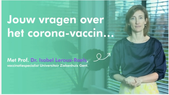In een video van 120 seconden geeft Prof. Dr. Isabel Leroux-Roels, diensthoofd van het Centrum voor Vaccinologie (UZ Gent), in een heldere taal een antwoord op veel gestelde vragen m.b.t. het corona-vaccin.