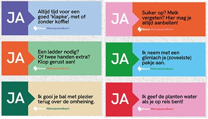 Een behulpzame buurt heb je natuurlijk niet één dag per jaar. Daarom biedt de stad 6 stickers aan met speelse, warme boodschappen, die je op je brievenbus kan kleven en die het hele jaar door zichtbaar zijn.