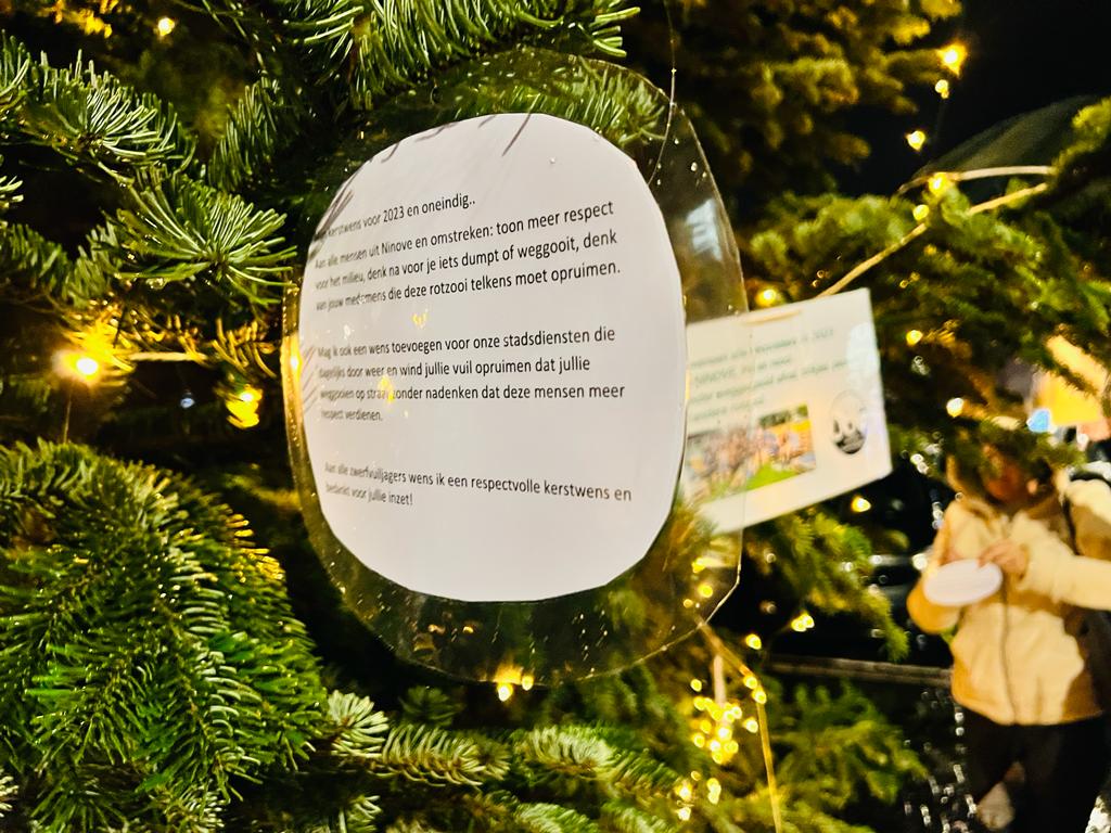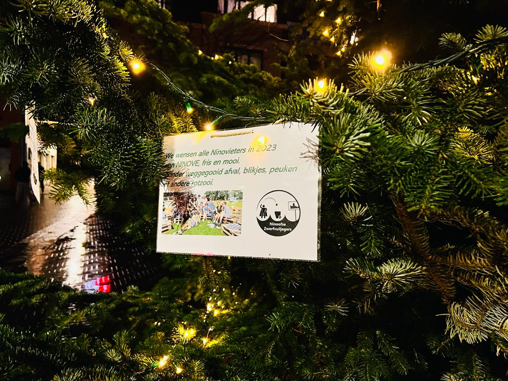 Toch besluiten Kris en de Ninoofse zwerfvuiljagers 2022 met een positieve actie. Ze tooiden donderdag 22 december de kerstboom op de Graanmarkt met zwerfvuilslingers, een oproep en wensen voor de Ninovieters en de stadsdiensten.