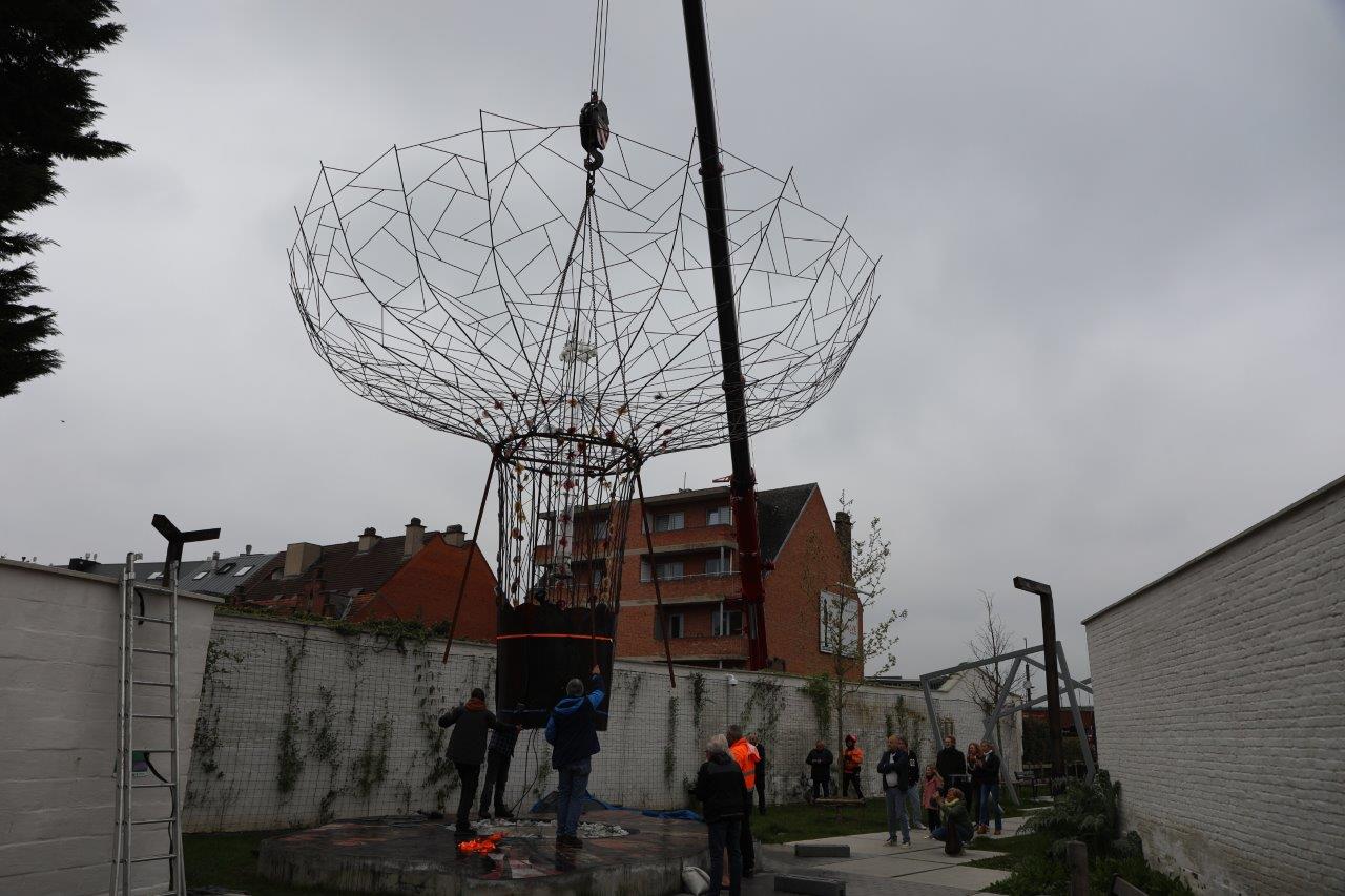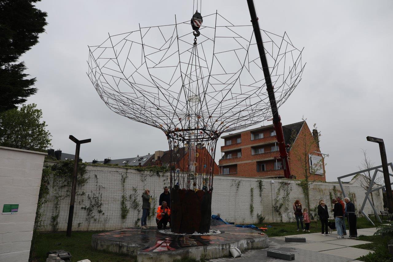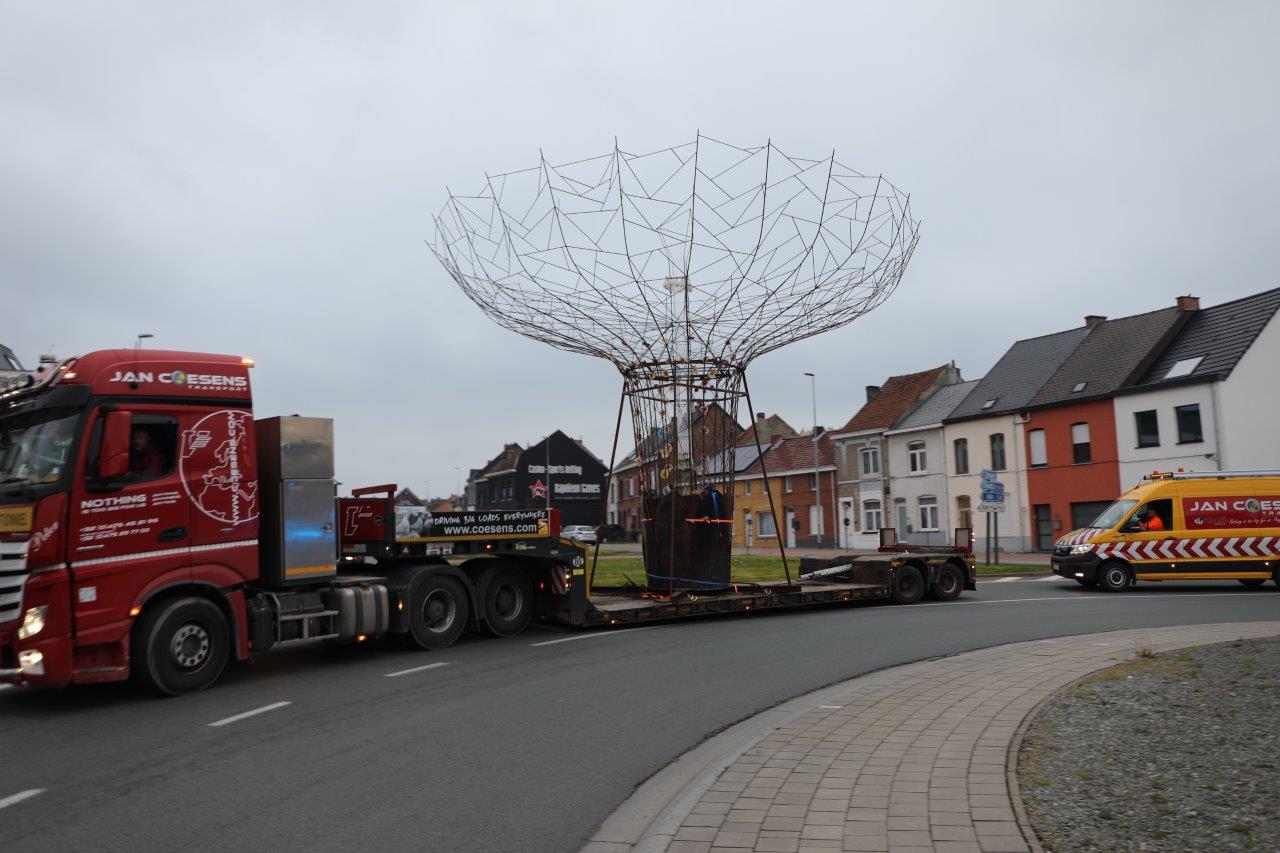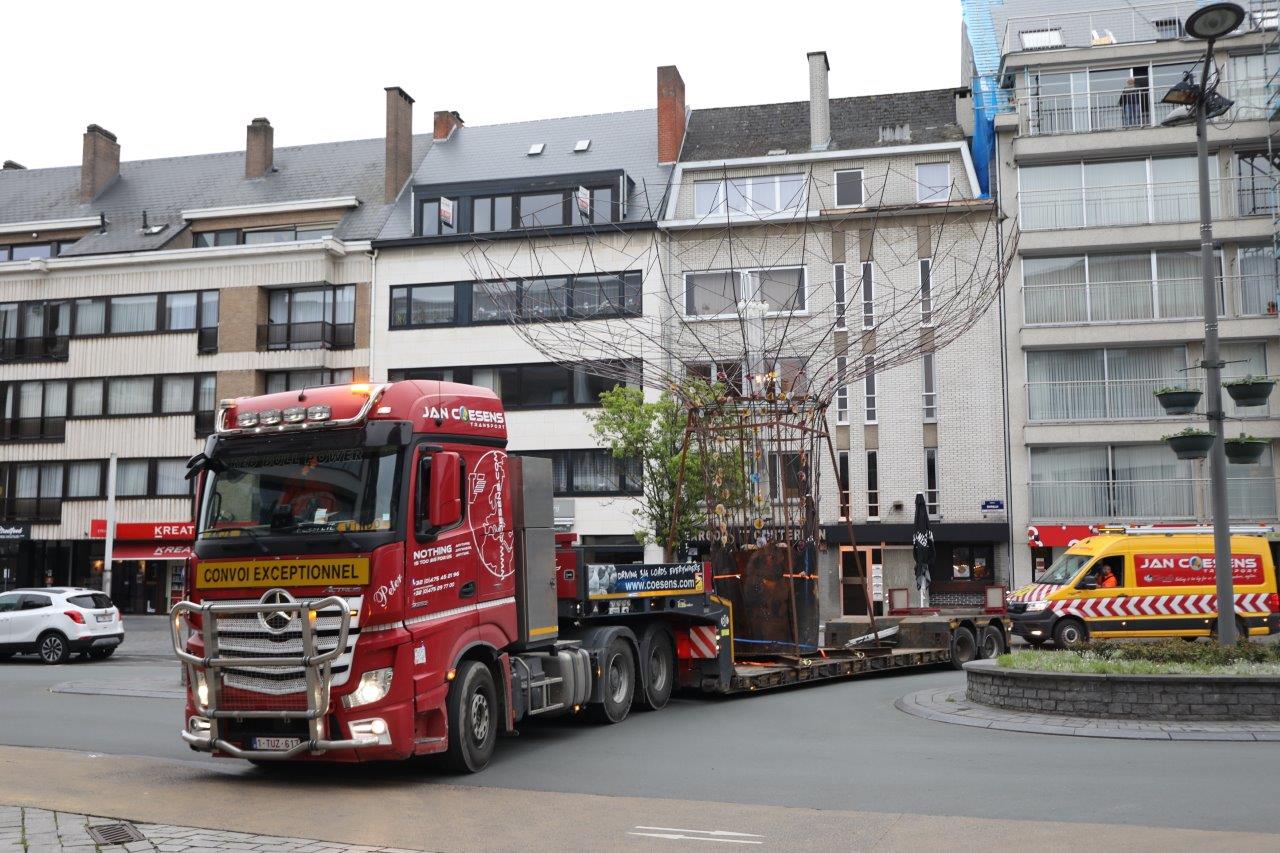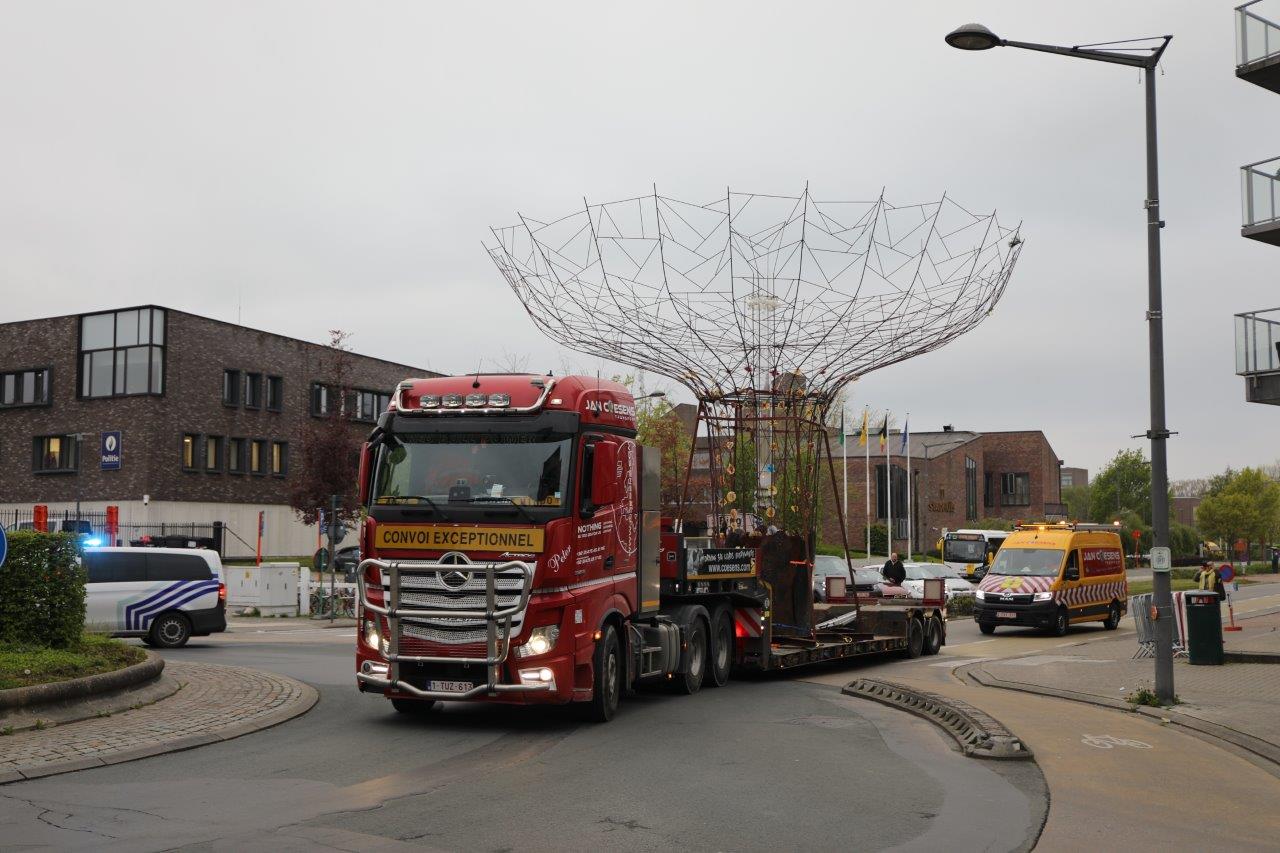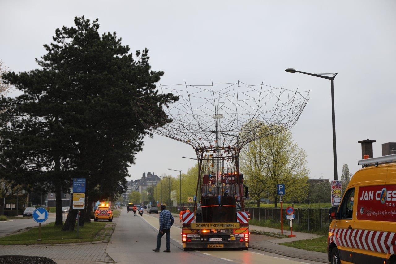 NINOVE – De kunstboom van William Arijs is zaterdagochtend 29 april van aan de Outerstraat getransporteerd naar zijn definitieve bestemming in de Beversteeg.