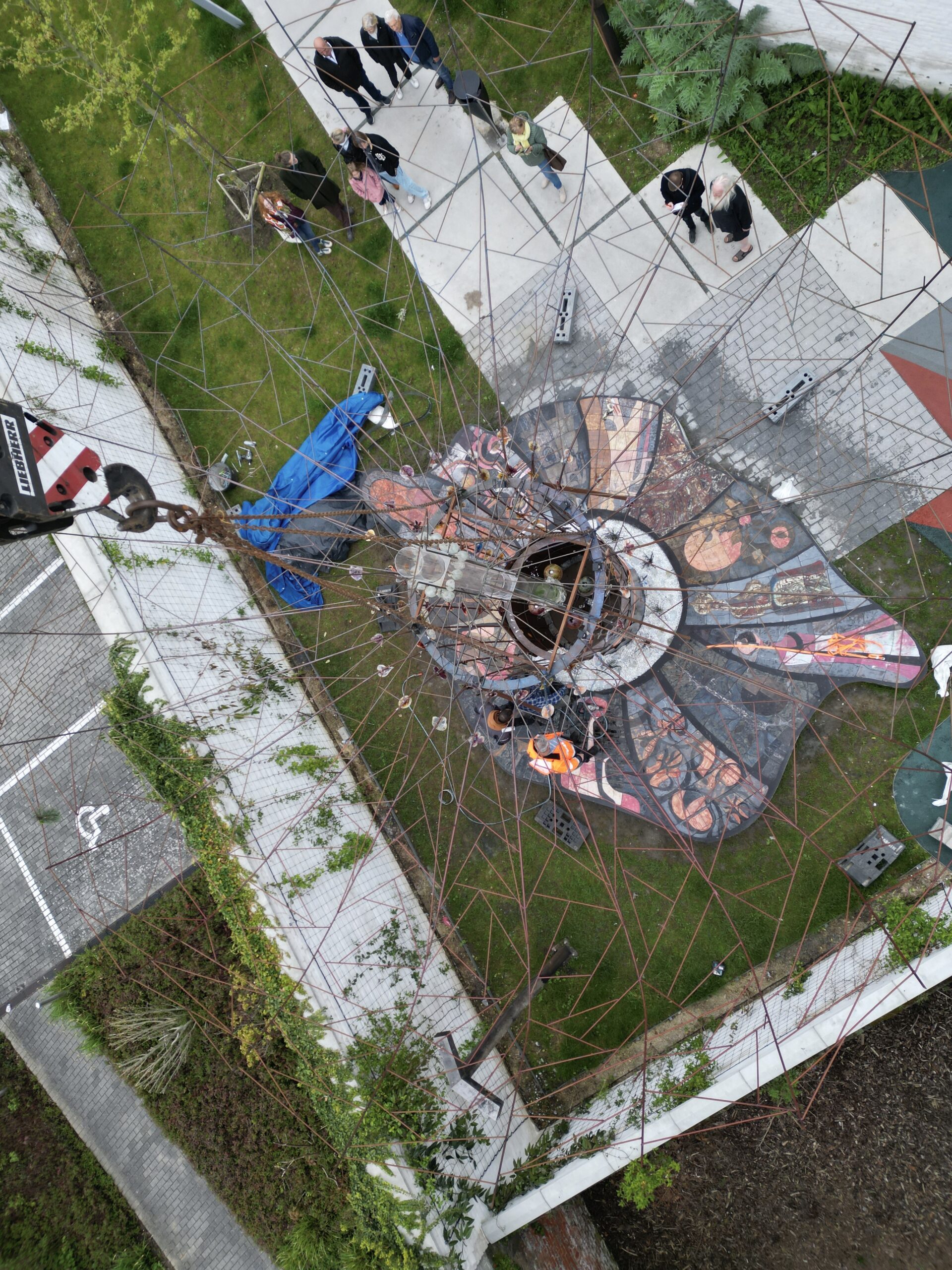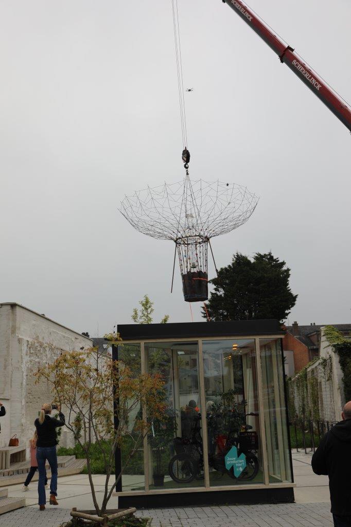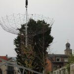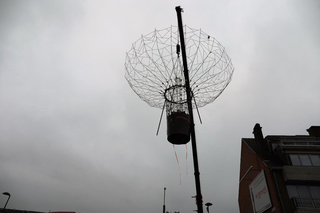 De kunstboom is dan om 8.30 uur op zijn definitieve plaats gehesen in de Beversteeg. Een precisiewerk, waaraan ook de stadsdiensten met man en macht meewerkten.
