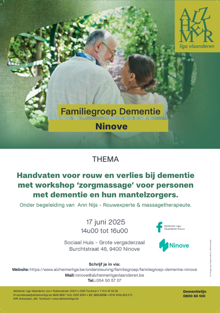 - Inschrijven: via Familiegroep Dementie – ninove@alzheimerligavlaanderen.be – 054-50 57 07.