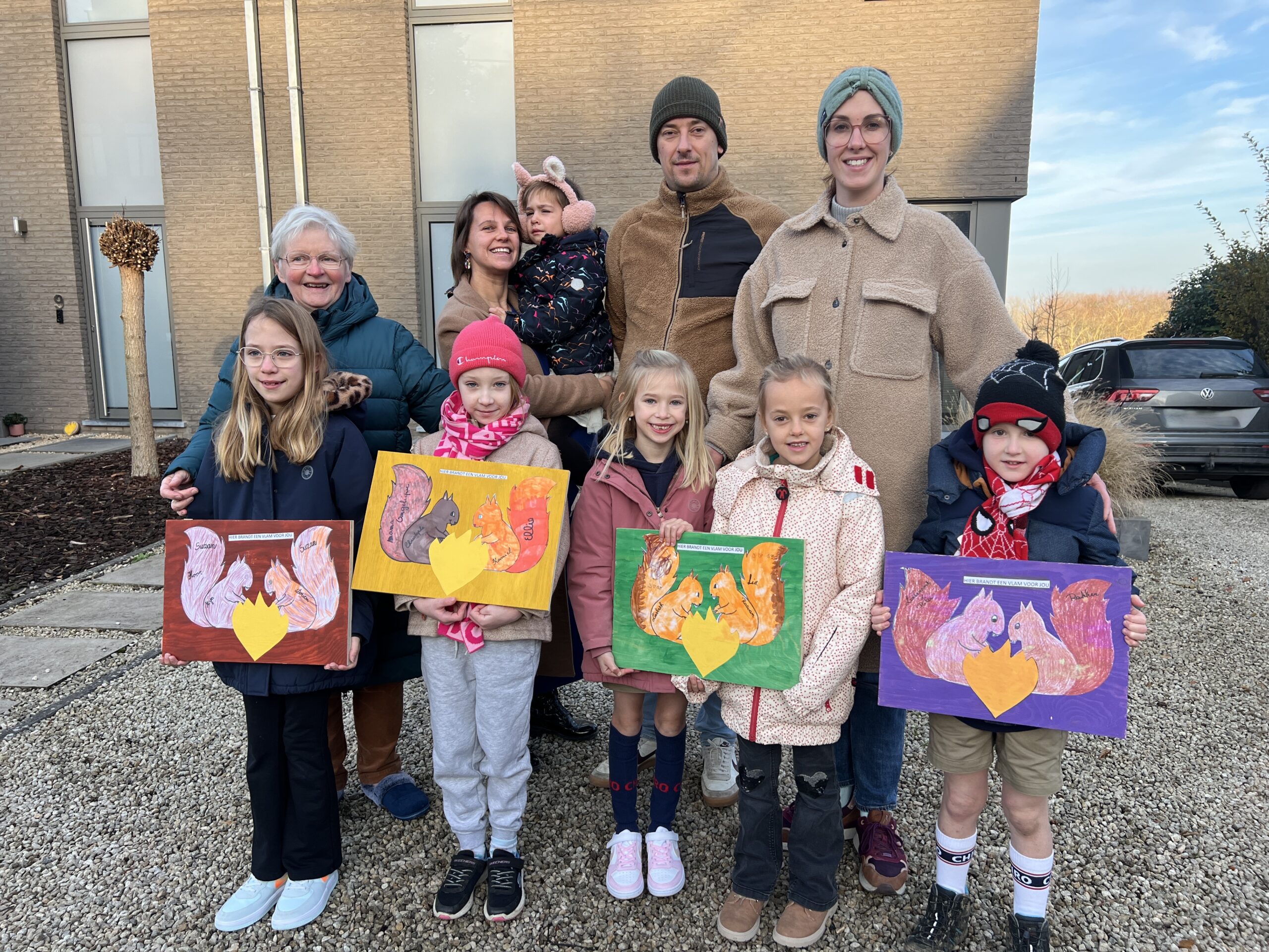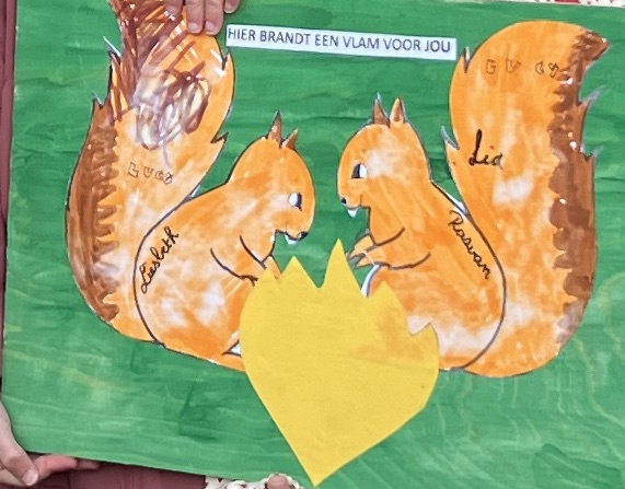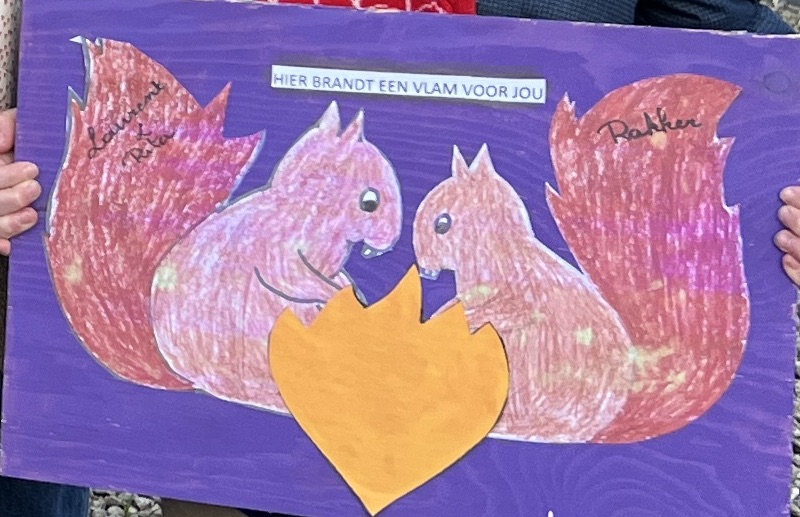 Dit keer ontwierp ze een plakkaat rond het thema van De Warmste Week, dat de ouders en kinderen van het dorp vorm gaven. “Het zijn er twintig, bedoeld voor mensen in Pollare Dorp, die niet zoveel bezoek meer krijgen. Het plakkaat stelt twee eekhoorntjes voor, die hier veel voorkomen. Zij dragen de vlam van De Warmste Week. Daarbij staat de tekst ‘Hier brandt een vlam voor jou’. Meer is het niet, maar ze hebben dit echt heel mooi uitgewerkt.”