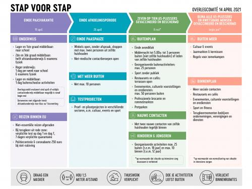 De versoepelingen gaan in een aantal stappen: ze starten na de paasvakantie en zetten zich door tot begin juni.