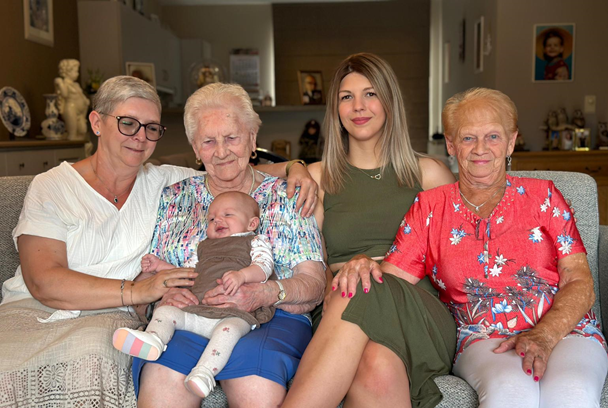 De vijf vrouwen op de foto, volgens leeftijd: Suzanne Duffeleer (98 jaar), Hermine Vernaillen (79 jaar), Annick Van den Spiegel (54 jaar), Silke Beeckman (28 jaar) en Milou Hermine (3 maand).