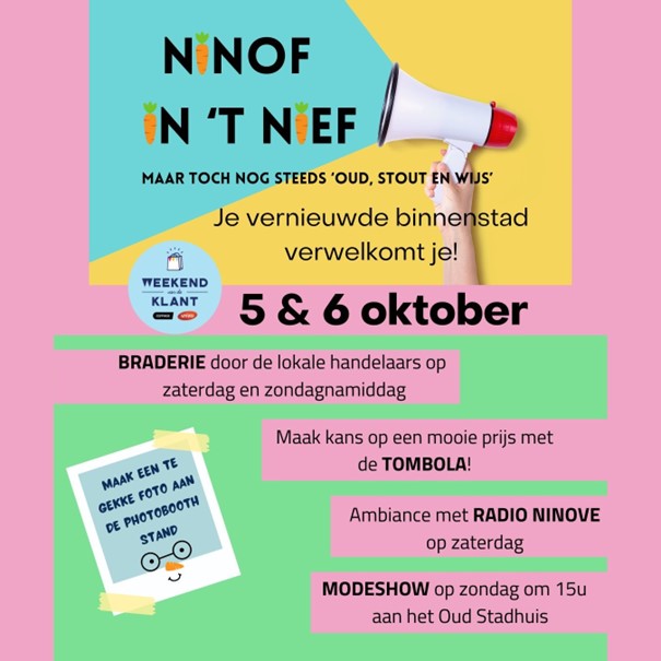 Op 5 en 6 oktober doen de handelaars iets extra om de vernieuwde stadskern wat in de kijker te zetten Tegen volgende week zouden de meeste werken klaar zijn, op een aantal details na. Ze willen niet wachten op de officiële inhuldiging en organiseren ‘Ninof in ‘t Nief’ met een tombola, modeshow en op zaterdag radio Ninove aan het Oudstrijdersplein. Binnenin maakt elke handelaar natuurlijk een vreugdedansje omdat ze weer bereikbaar zijn, de stad erop vooruit gaat en ze uit het stof zijn.