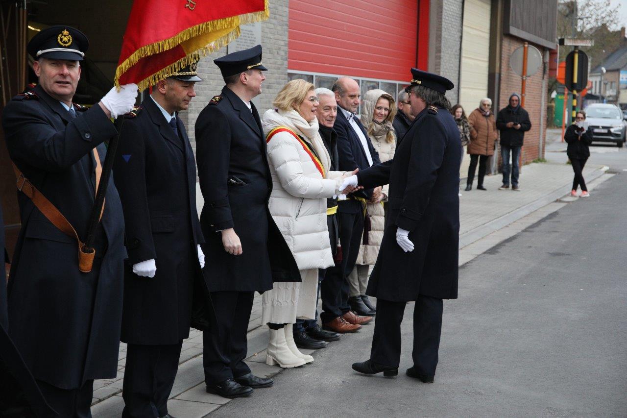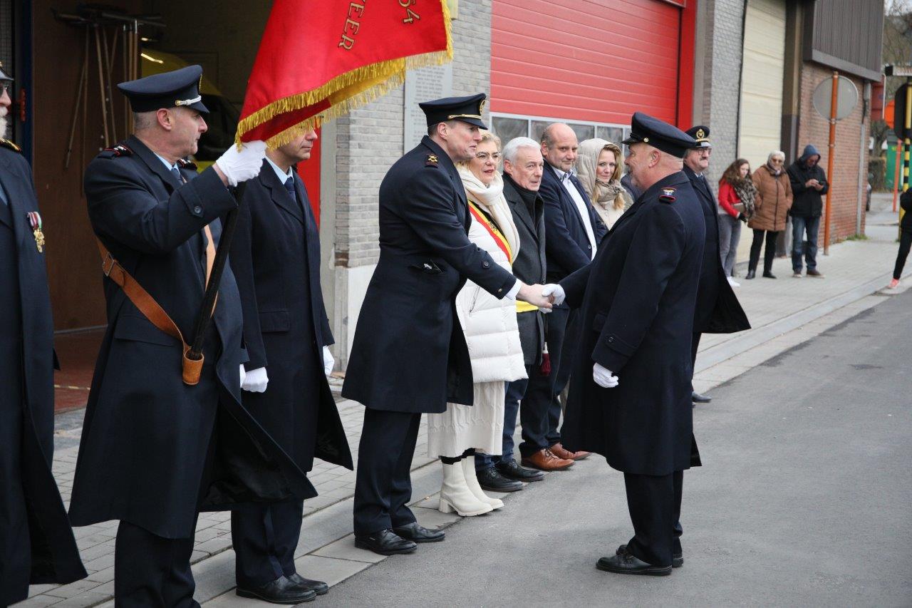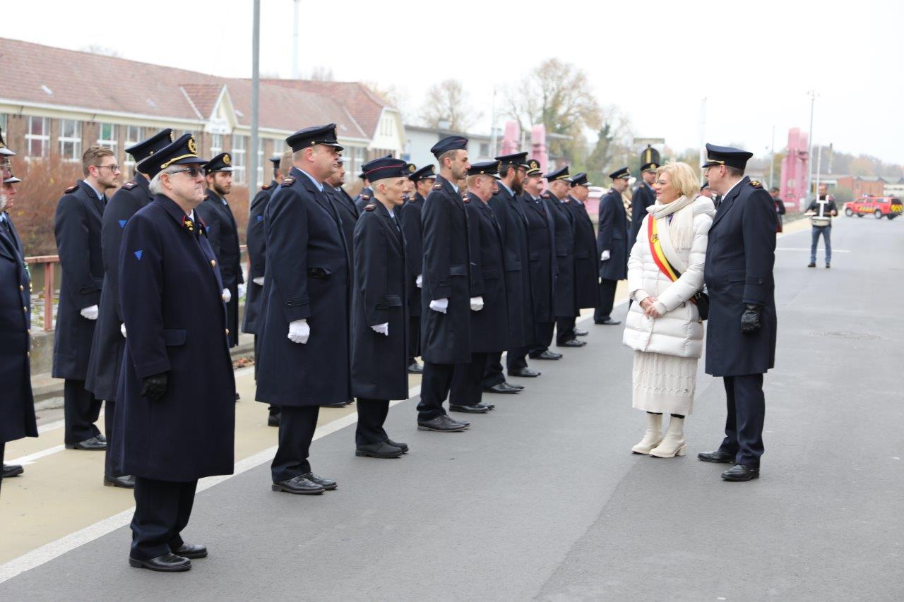 Na de viering schouwde burgemeester Tania De Jonge ter hoogte van de brandweerkazerne de troepen. Zij deed dat in het gezelschap van haar schepenen Marc Torrekens, Alain Triest, Henri Evenepoel en Katie Coppens.