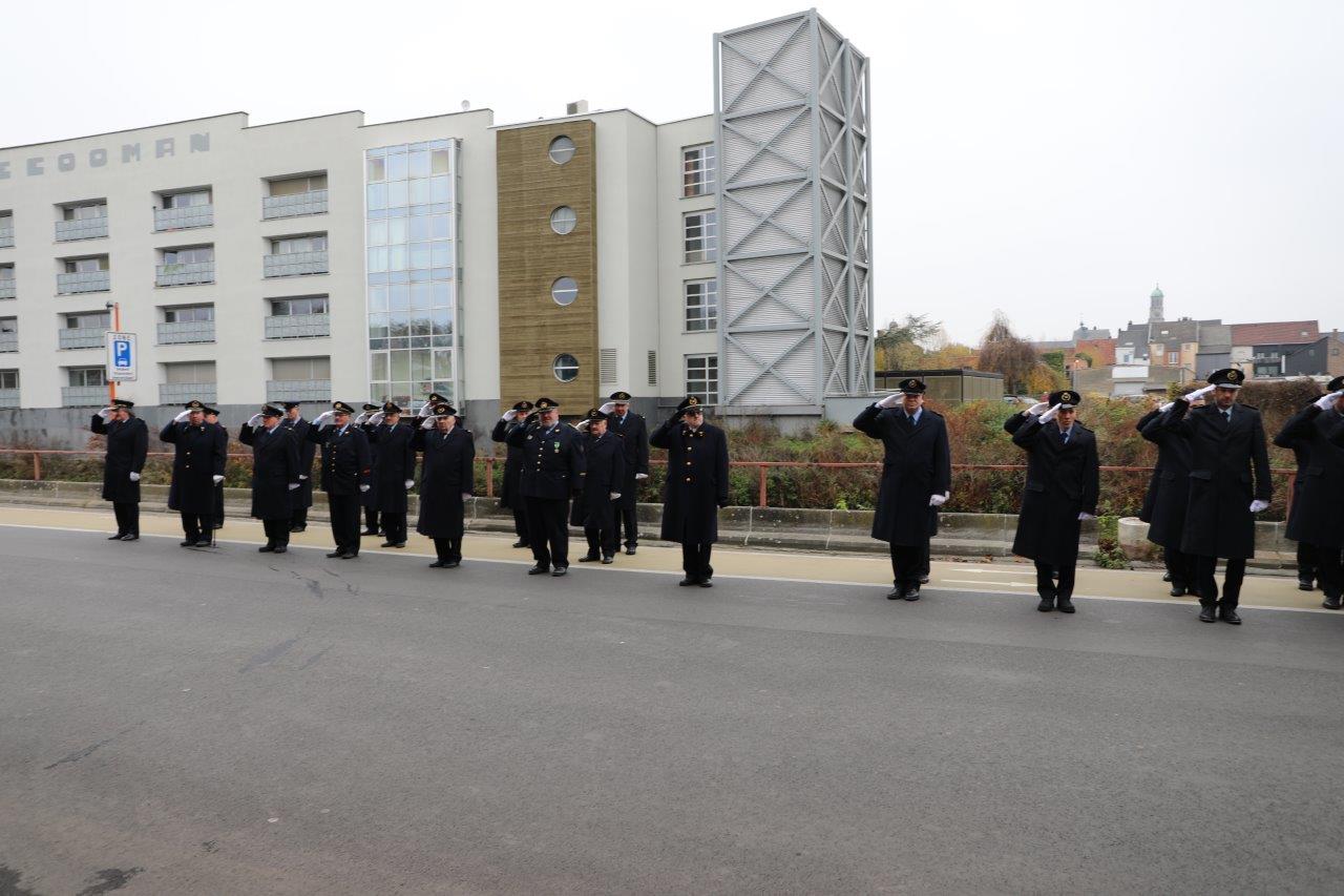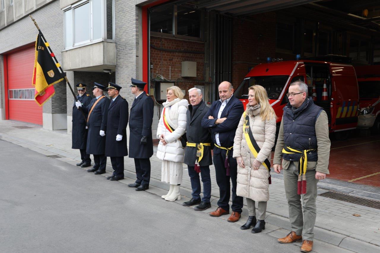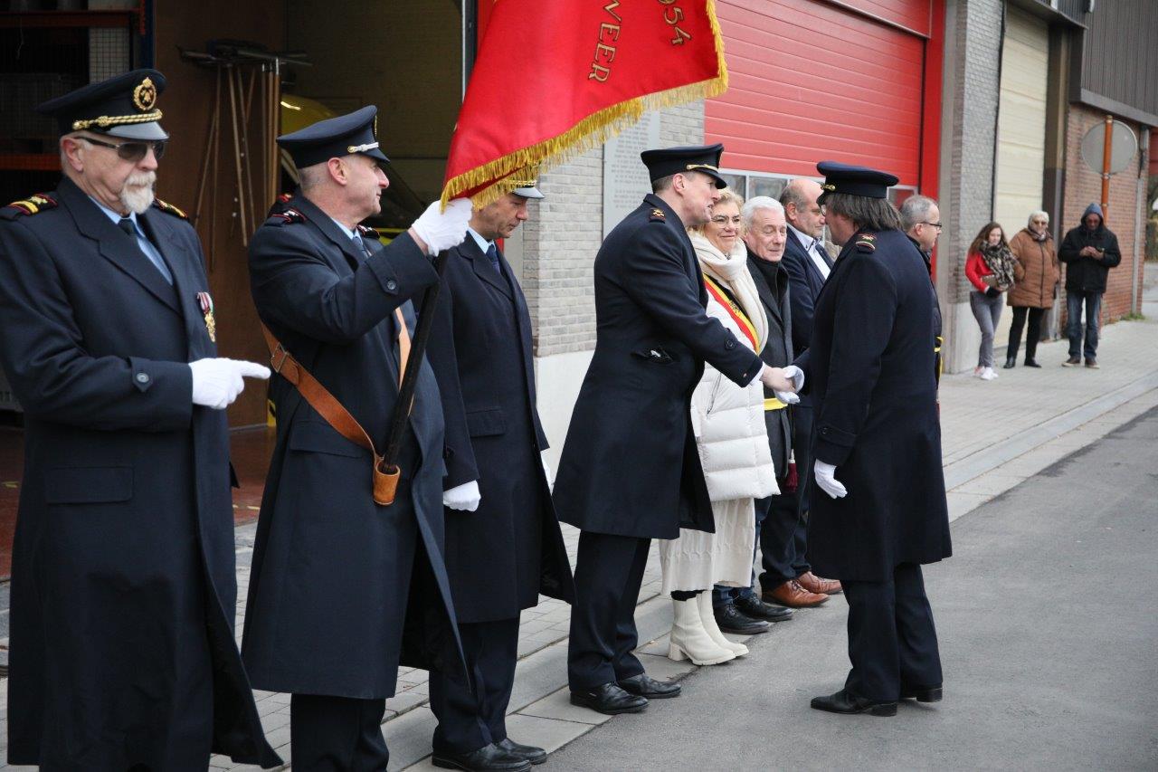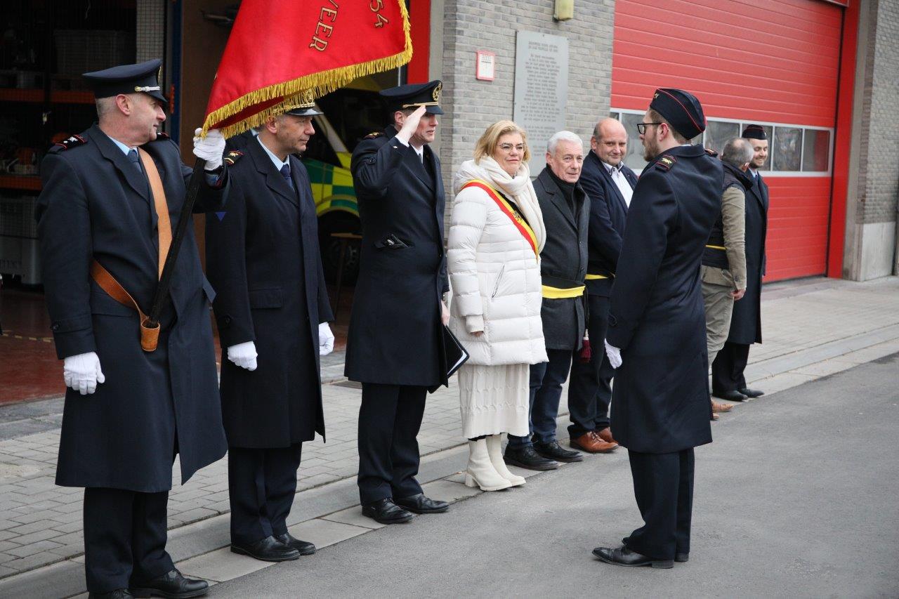 Na de viering schouwde burgemeester Tania De Jonge ter hoogte van de brandweerkazerne de troepen. Zij deed dat in het gezelschap van haar schepenen Marc Torrekens, Alain Triest, Henri Evenepoel en Katie Coppens.