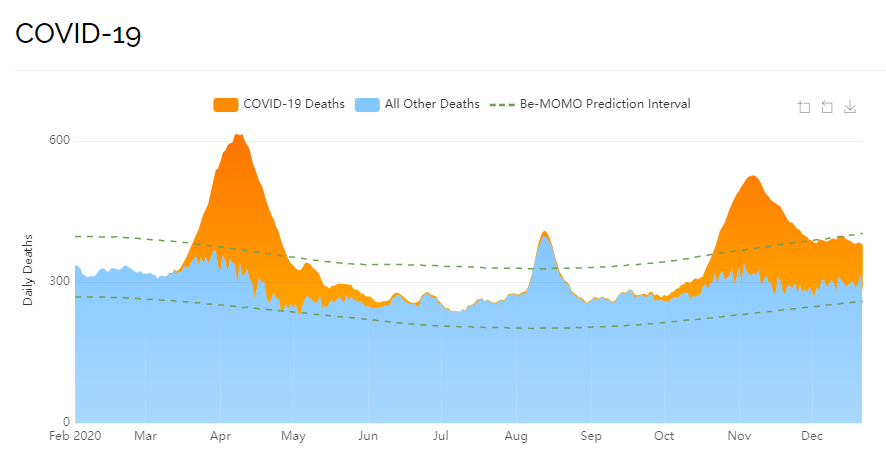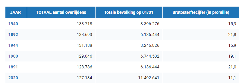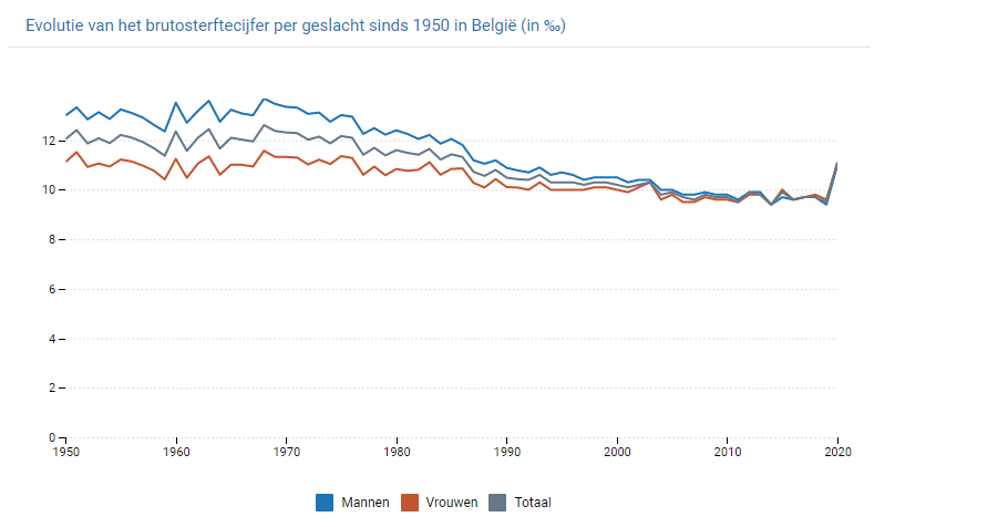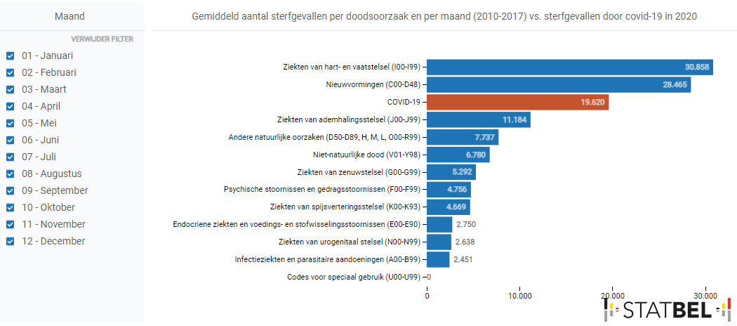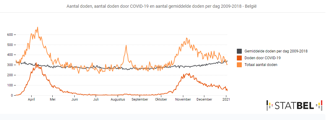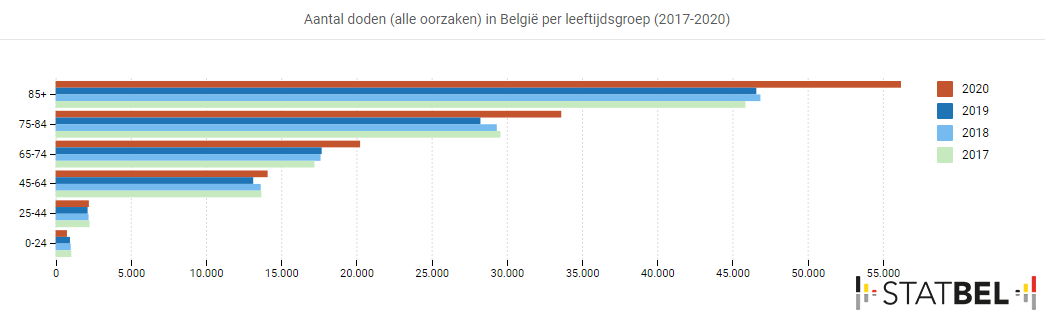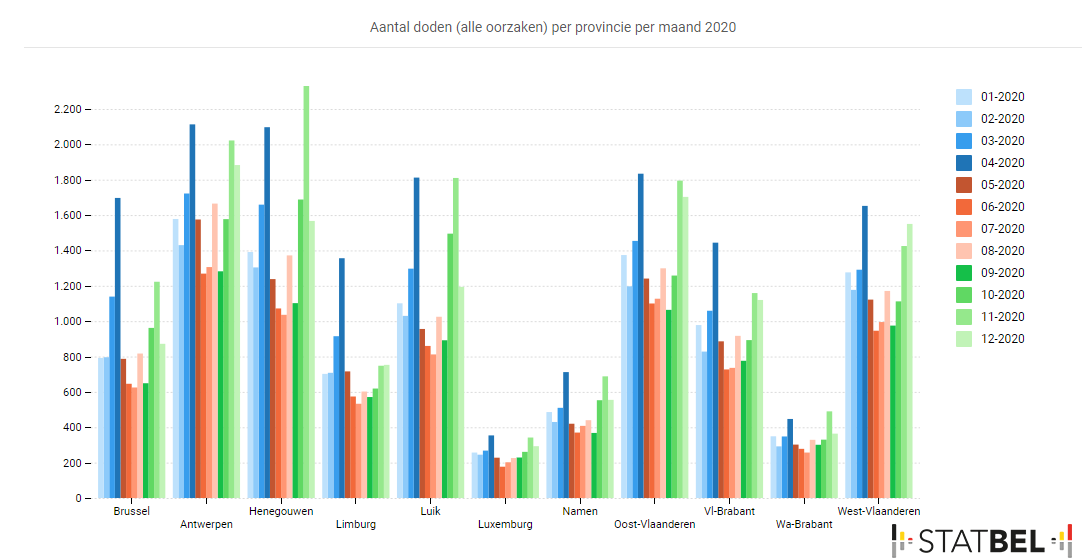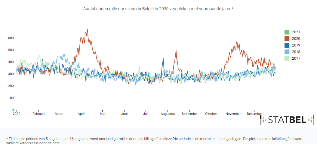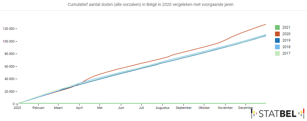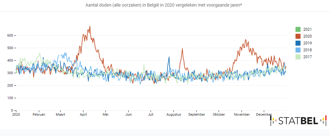 Satbel publiceerde de voorlopige Belgische sterftecijfers voor 2019 en 2020, in combinatie met de officiële sterftecijfers voor 2017, 2018 en soms de voorgaande 10 jaar. Deze cijfers en grafieken van Statbel vormen een aanvulling op de gegevens van Sciensano.
