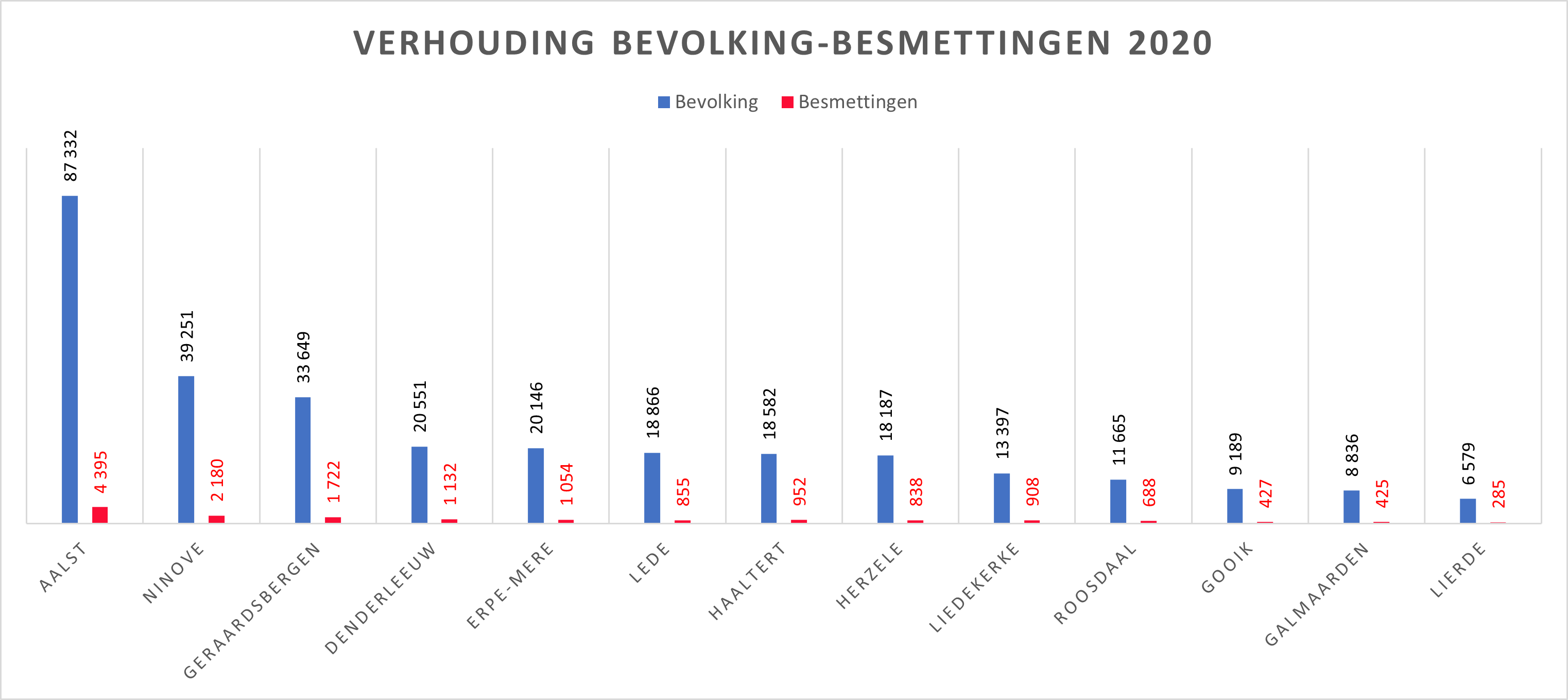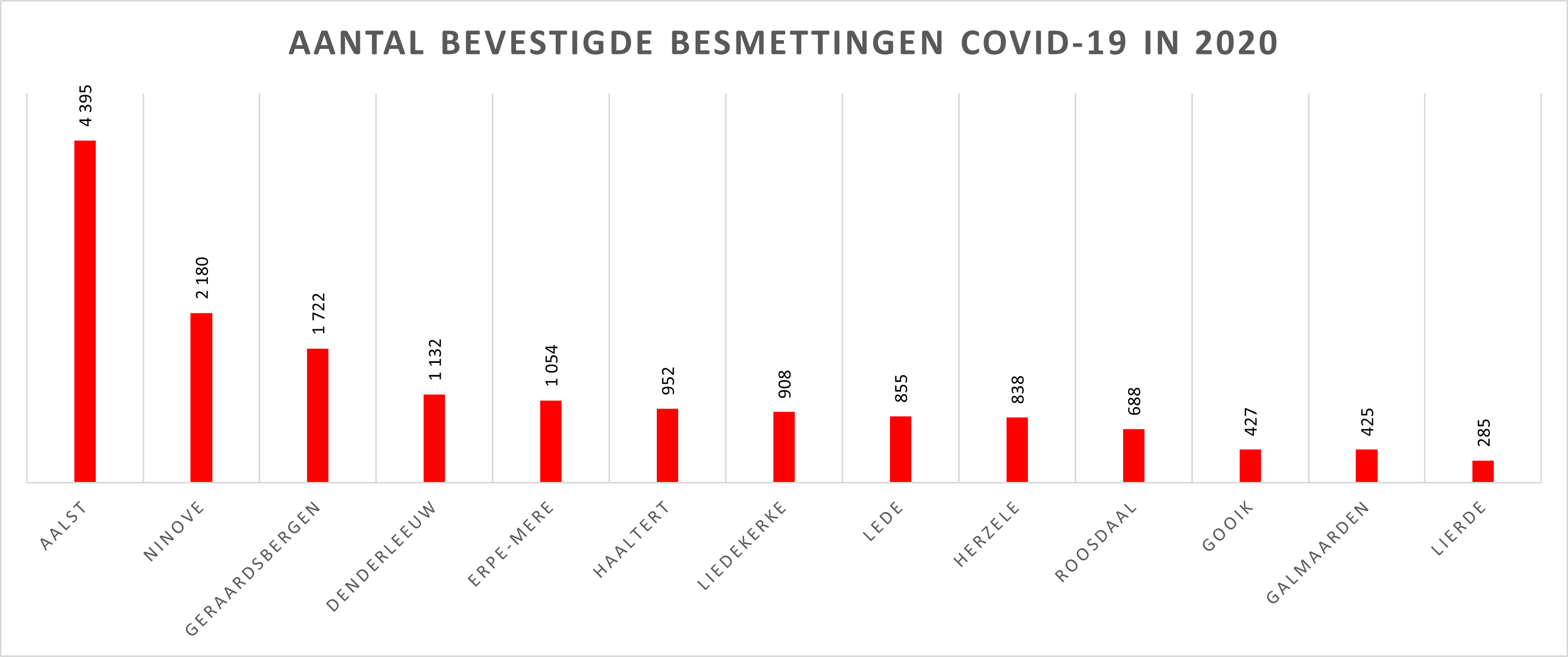 In 2020 zijn in Aalst 4.395 bevestigde besmettingen geregistreerd, in Ninove 2.180. Het minste besmettingen vielen in Lierde met 285, al noteerden we in deze laatste gemeente dus de grootste oversterfte.