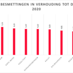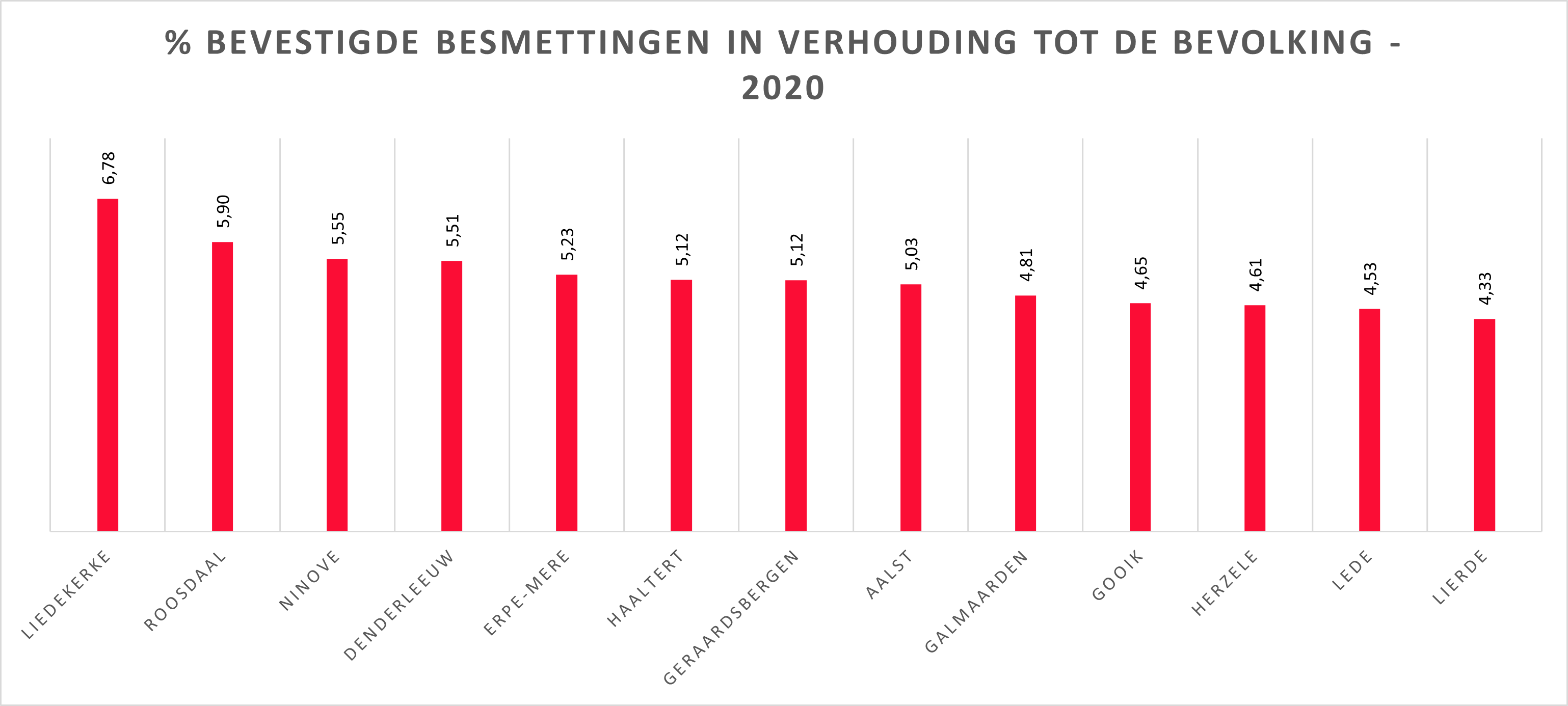 Als we het aantal besmettingen voor 2020 afzetten tegenover het aantal inwoners, komen we aan een gemiddelde van 5,18 % bewoners, die met COVID-19 zijn besmet geraakt. Liedekerke zit daar met 6,78 % boven, Lierde heeft de laagste besmettingsgraad met 4,33 % Voor Ninove is deze 5,55.
