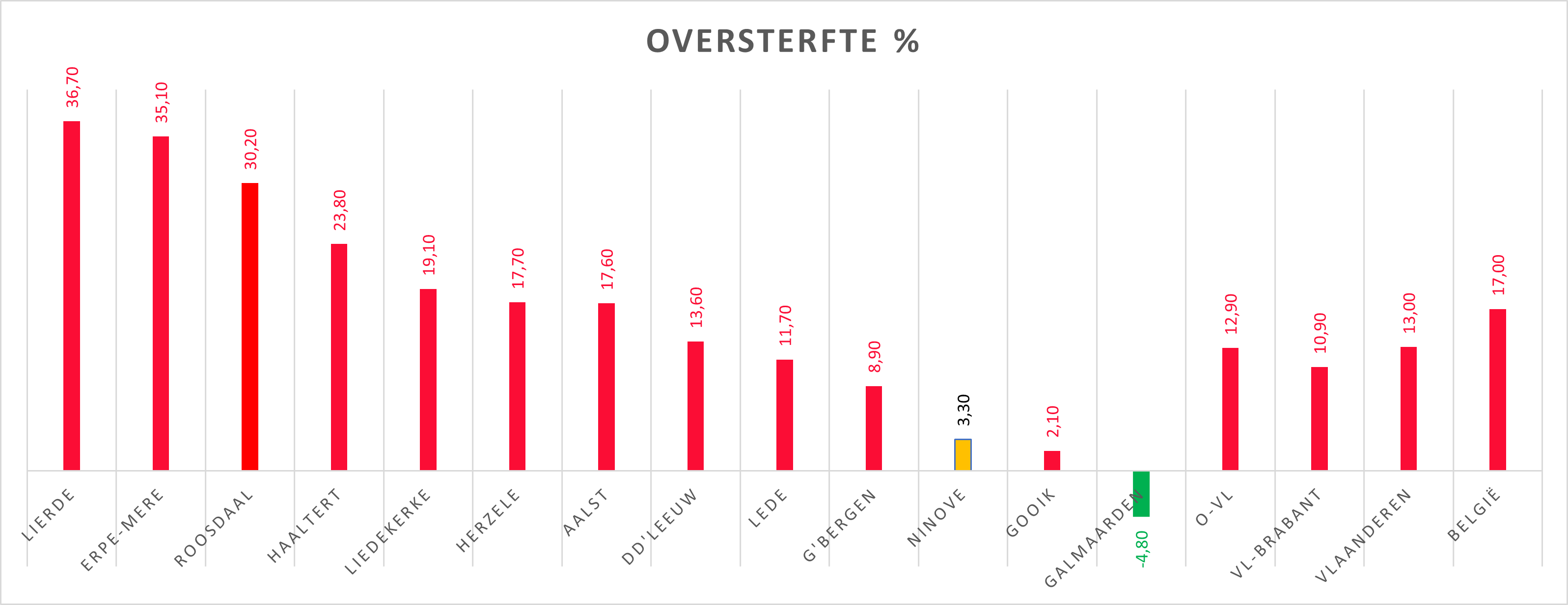 Lierde kende de grootste oversterfte: 36,70 %. Galmaarden tekende daarentegen 4,8 % ondersterfte op: daar stierven dus minder mensen, dan statistisch te verwachten was. Ninove had een eerder lage oversterfte van 3,30 %.
