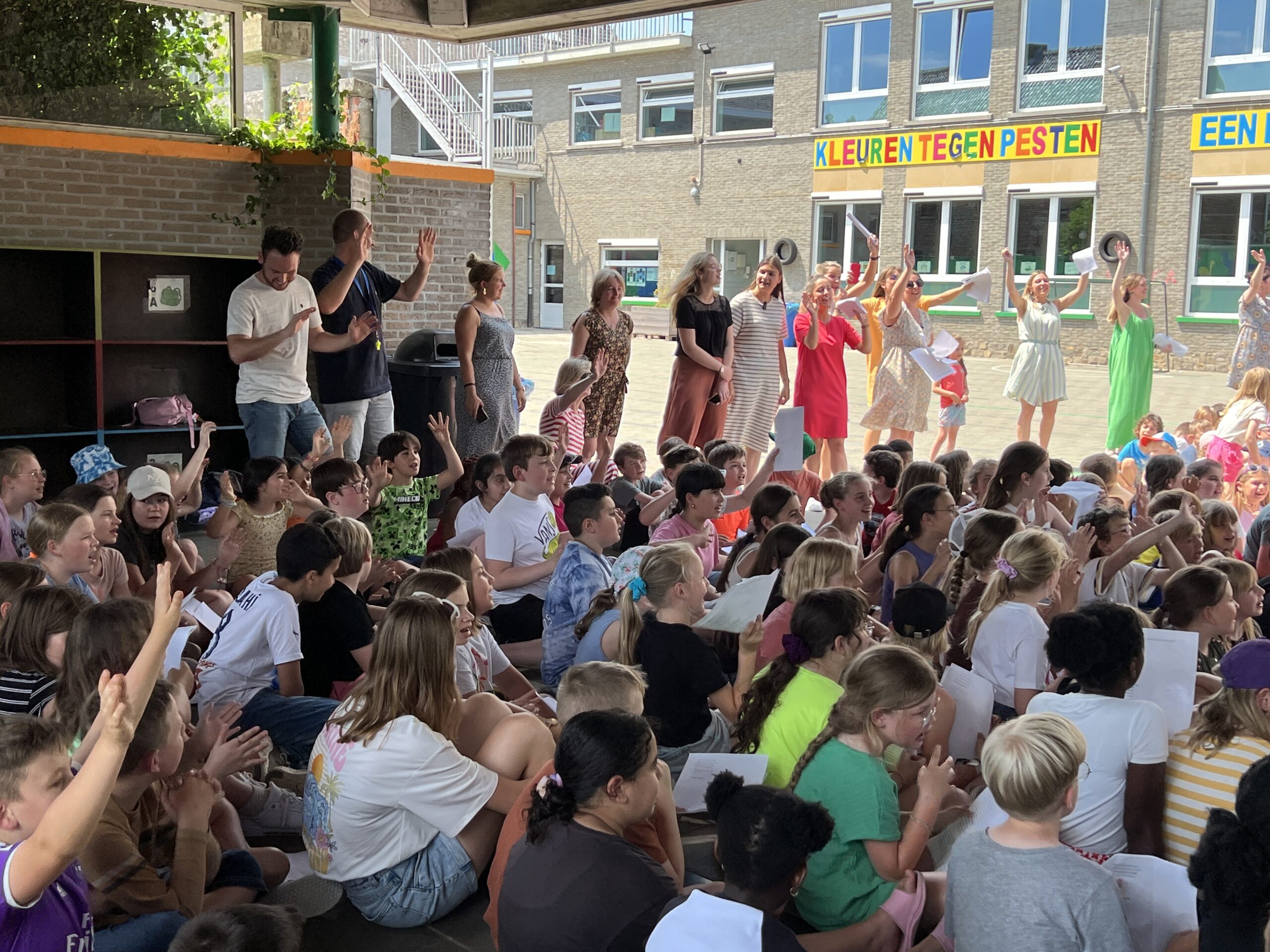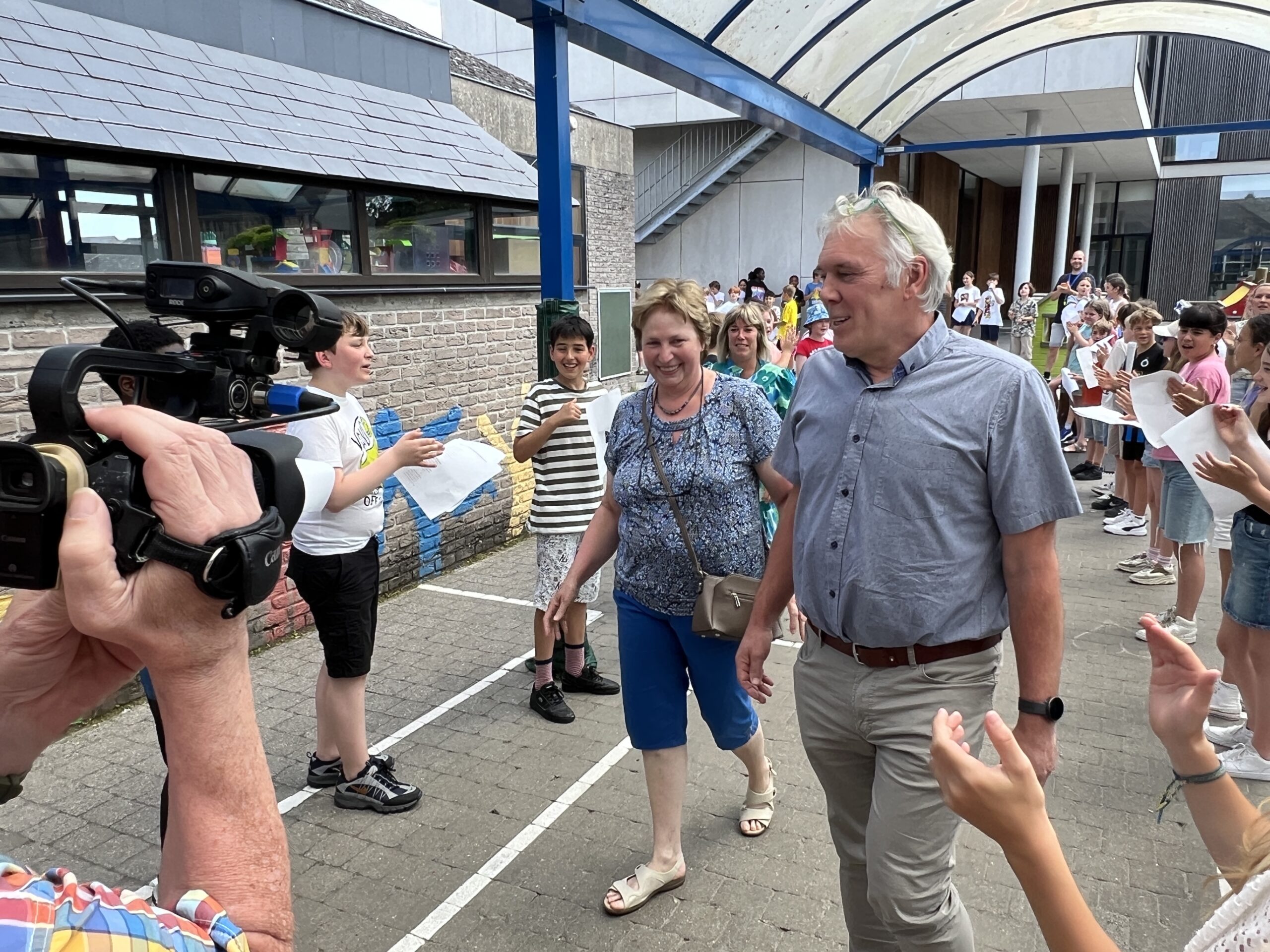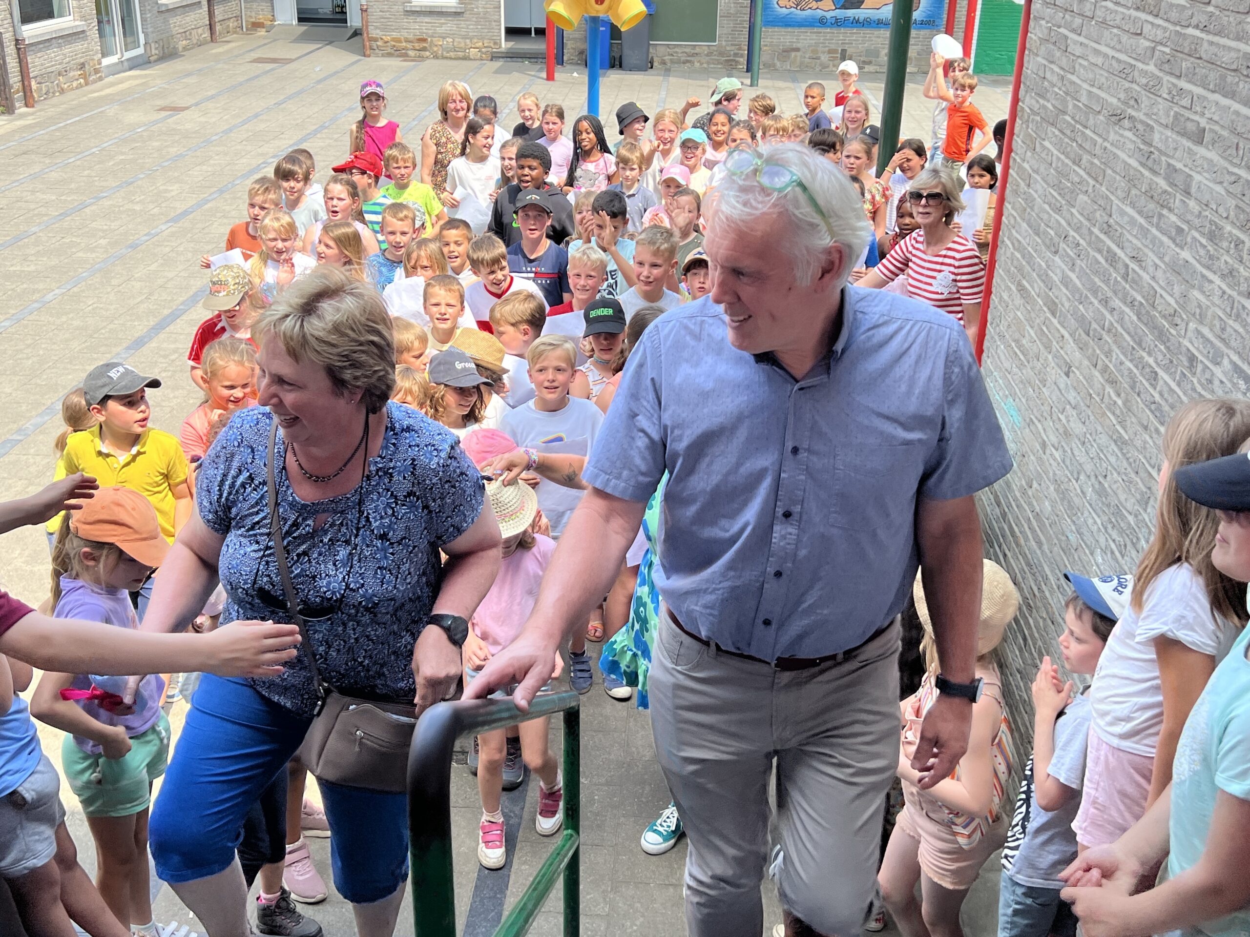 “Juf Myriam stopt na meer dan 40 jaar dienst”, vertelde ons nog directeur Jeroen Cooman. “Logisch, dat we haar in de bloemen zetten. We hebben het voor haar zo mooi mogelijk gemaakt en ik denk, dat ze dit zeker apprecieert. Dat wil tegelijk zeggen, dat het bijna mijn beurt is aangezien juf Myriam evenveel dienstjaren heeft als ik. Maar het is afscheid nemen voor nieuwe dingen, de gang van het leven. Iedereen hier verdient een mooi afscheid omwille van hun inzet voor de school. Ik ben altijd al zeer fier geweest op mijn team, dus ook vandaag. Er komen weinig teams in onze buurt.”