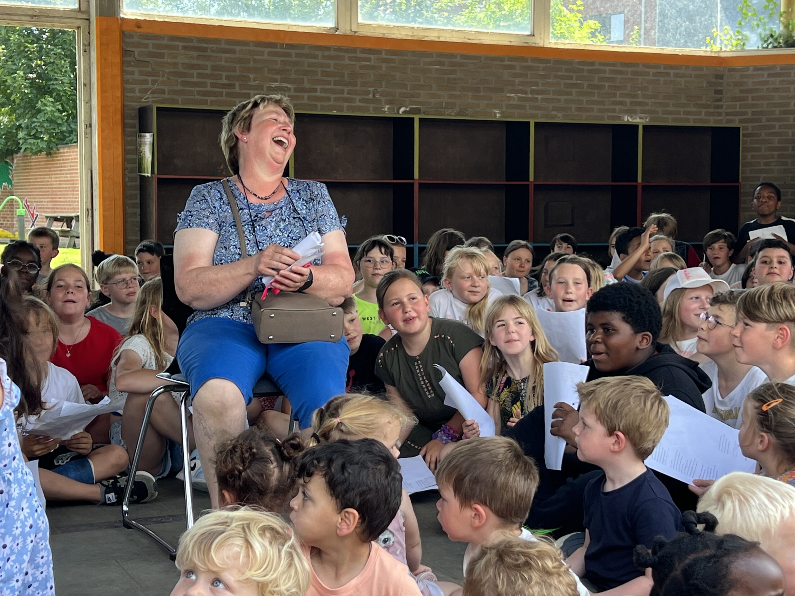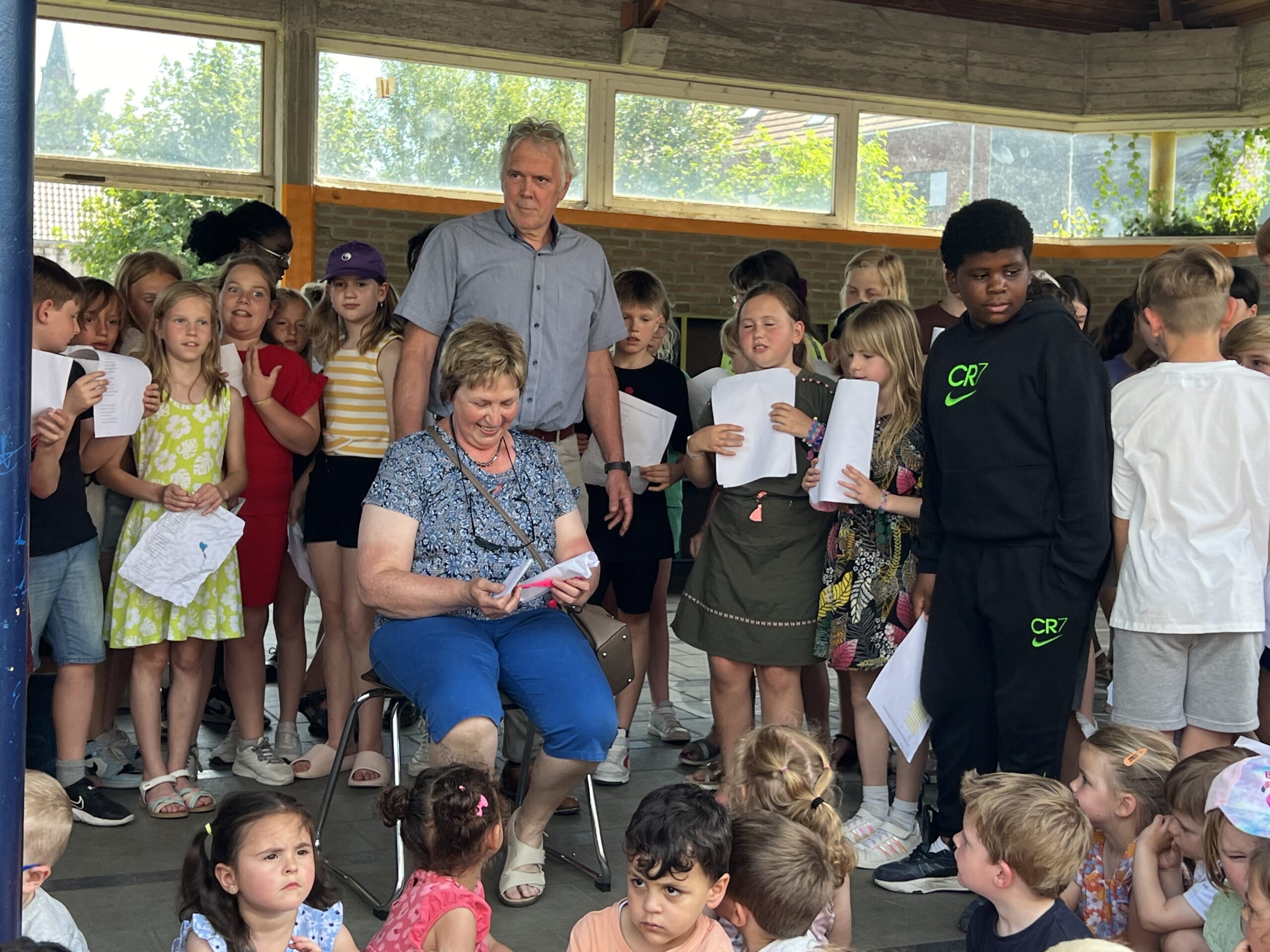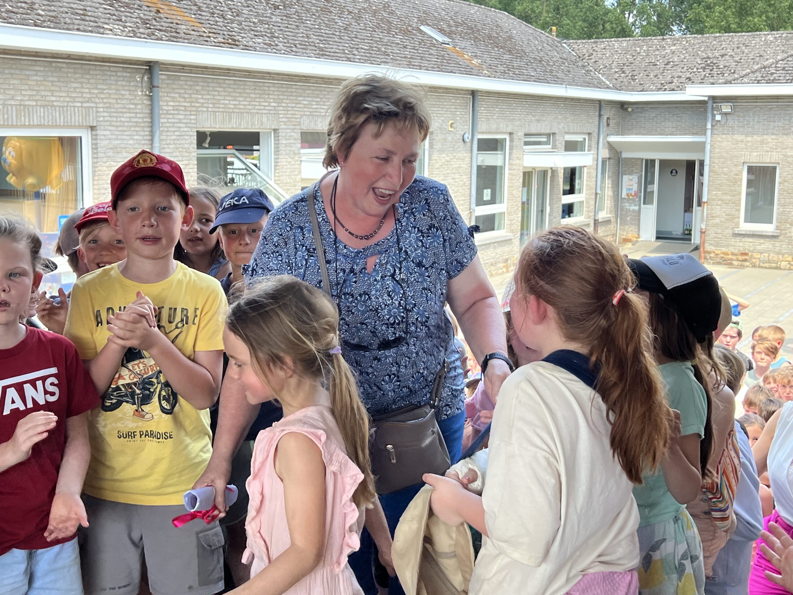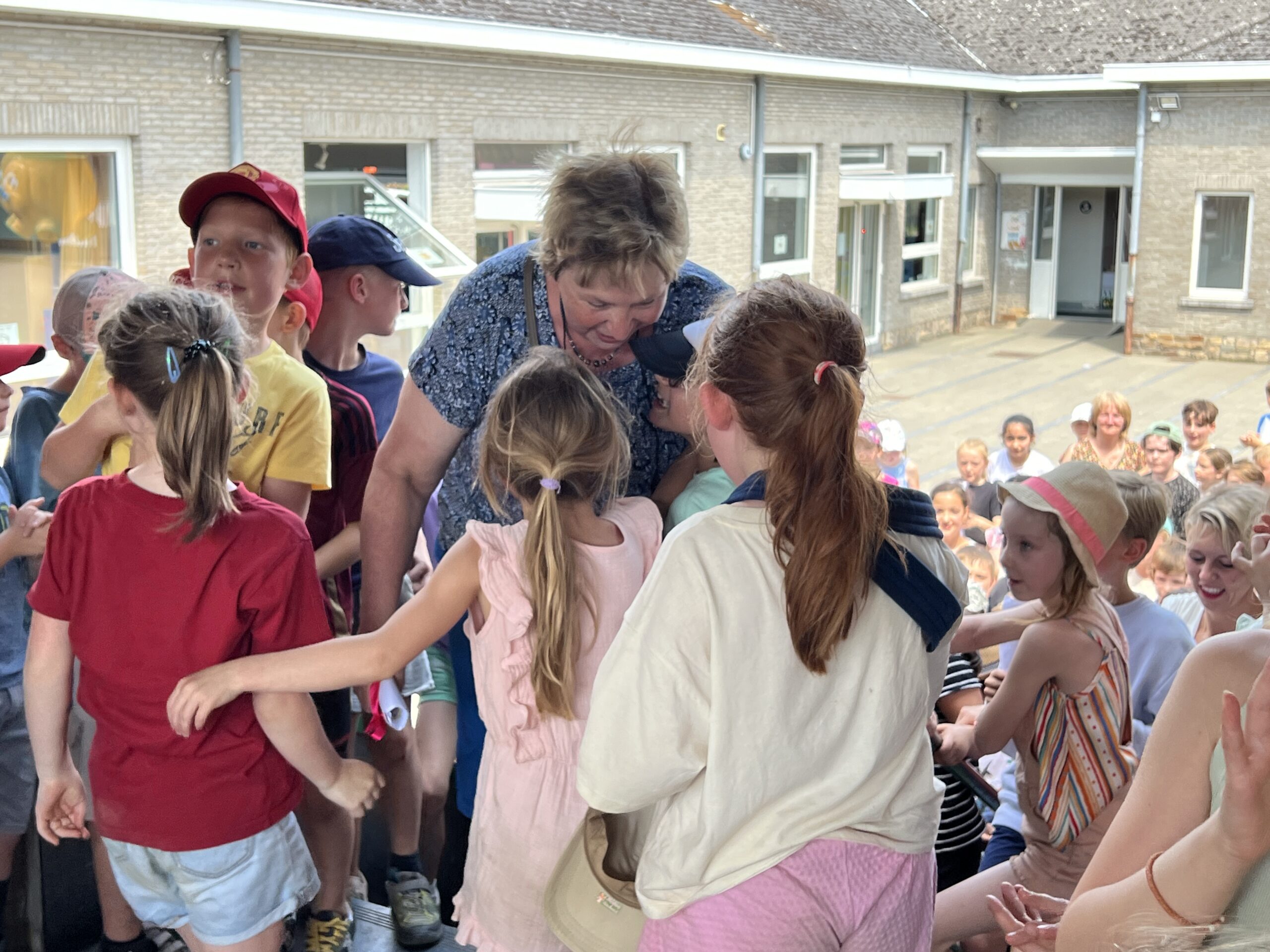 “De meeste onder jullie hebben in mijn klasje hun eerste stapjes gezet naar de grote school”, zegde ze in haar afscheidsspeech aan de leerlingen. “Soms met een traantje, soms ook heel stoer en trots. Ik heb jullie opgevangen, getroost, aangemoedigd en af en toe wat ingetoomd. Ik was heel graag de juf van de instappertjes, de engeltjes en soms ook de bengeltjes. Ik heb van jullie genoten, heb jullie zien groeien en openbloeien en daarvoor wil ik jullie allen bedanken.”