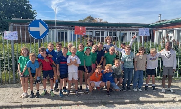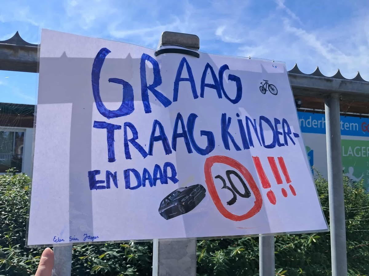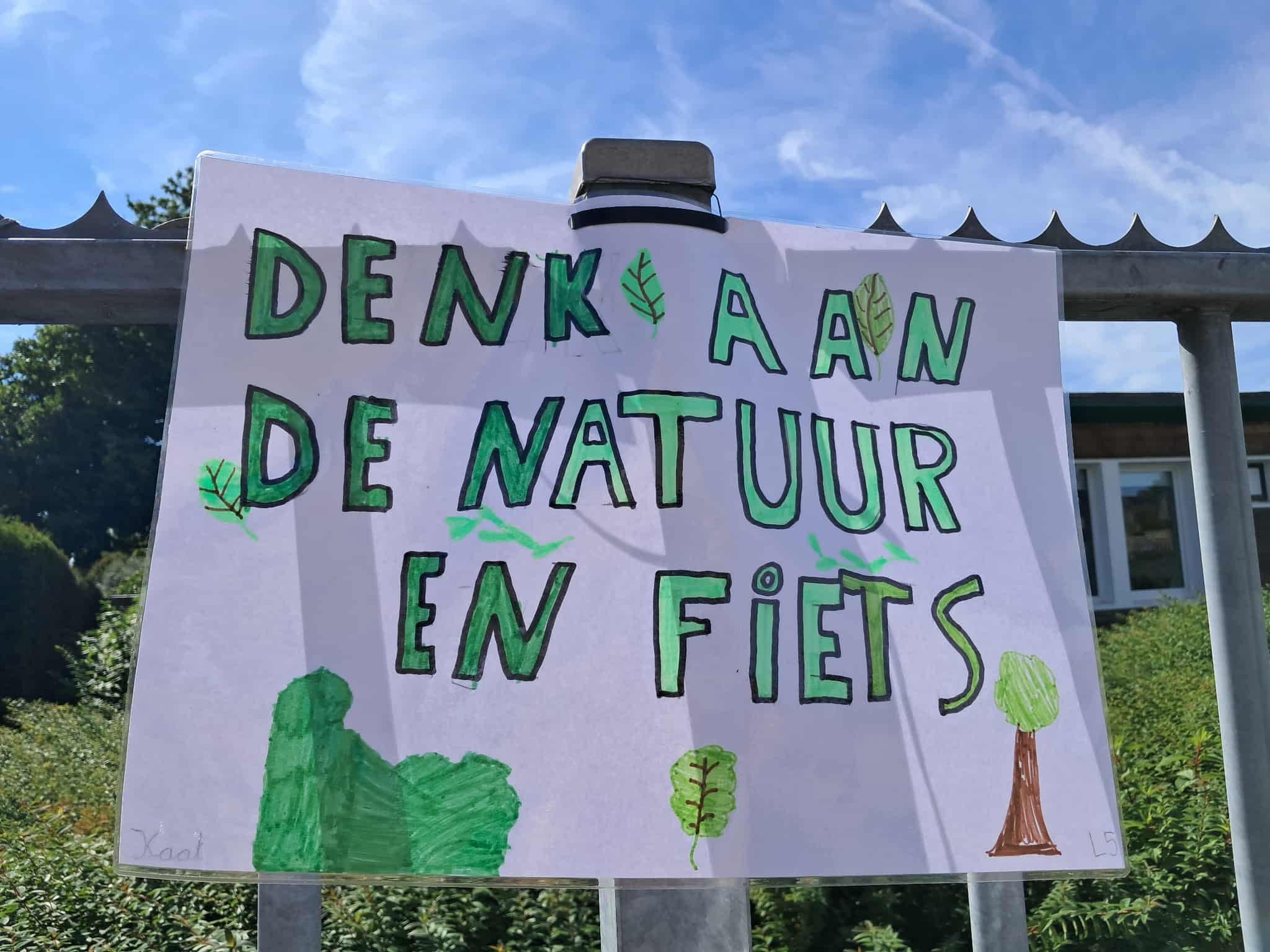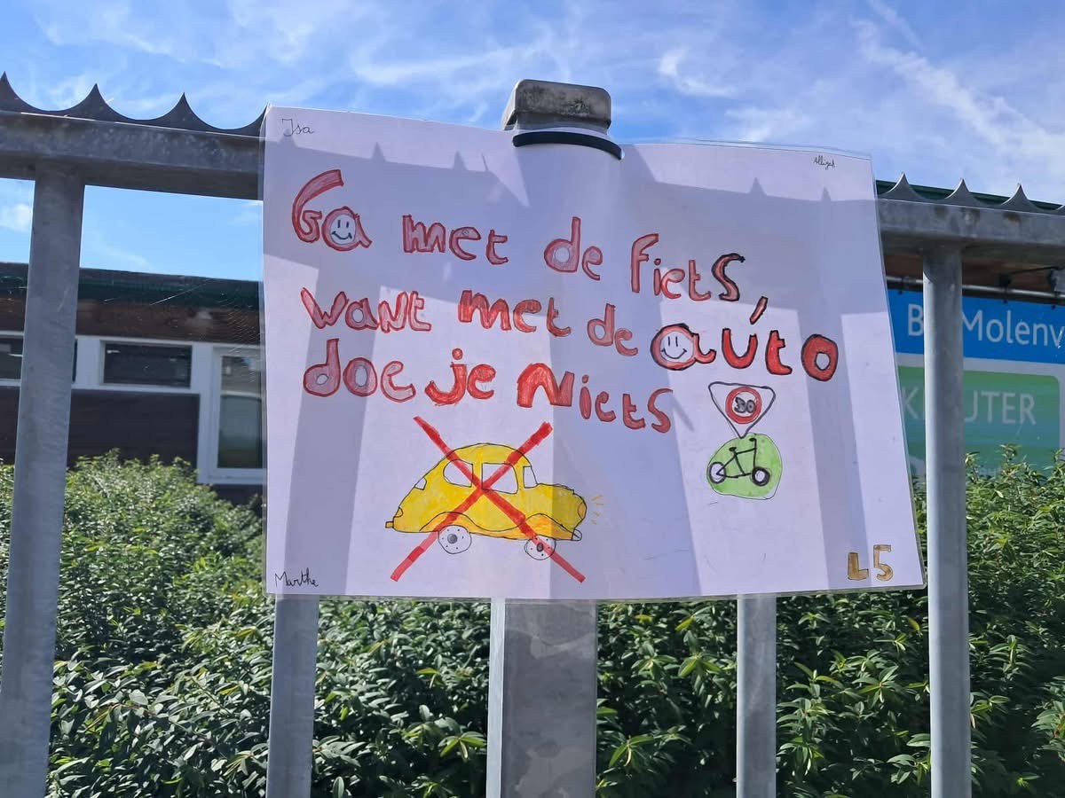 Die boodschap wilden de leerlingen van het 5de jaar in de basisschool Molenveld vrijdag 19 september uithangen: letterlijk met slogans op affiches aan de schoolpoort. Ze vroegen aan de voorbijgangers van de schoolomgeving om zoveel mogelijk te trappen en te stappen en de auto te vermijden. Ook de chauffeurs, die hun auto toch nodig hadden, kregen een duidelijke boodschap.
