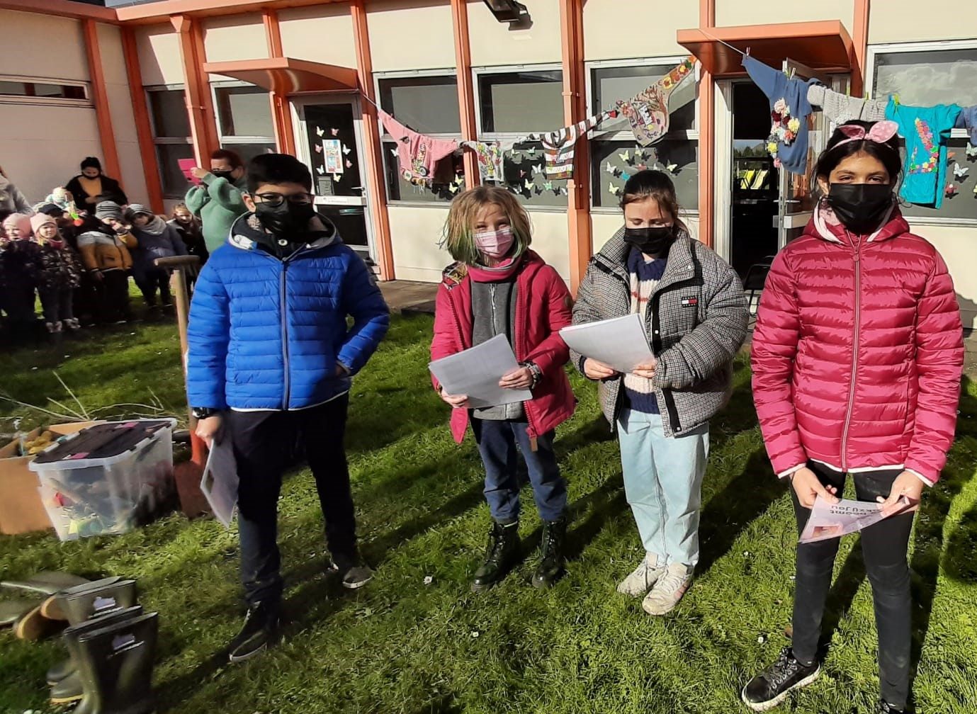 In De Wonderwijzer had iedere klas een trui versierd met een bepaalde letter. De Groene Ridders hingen deze truien buiten aan de waslijn. Zij vormden op die manier de slogan ‘Wijze planters’.