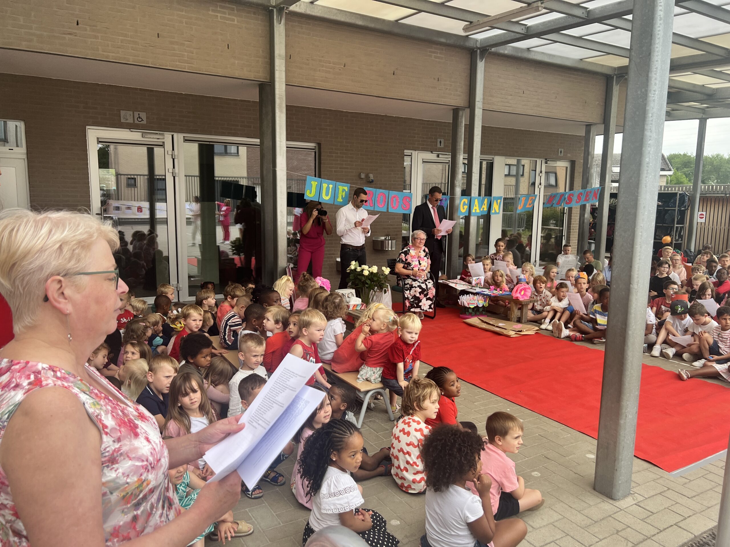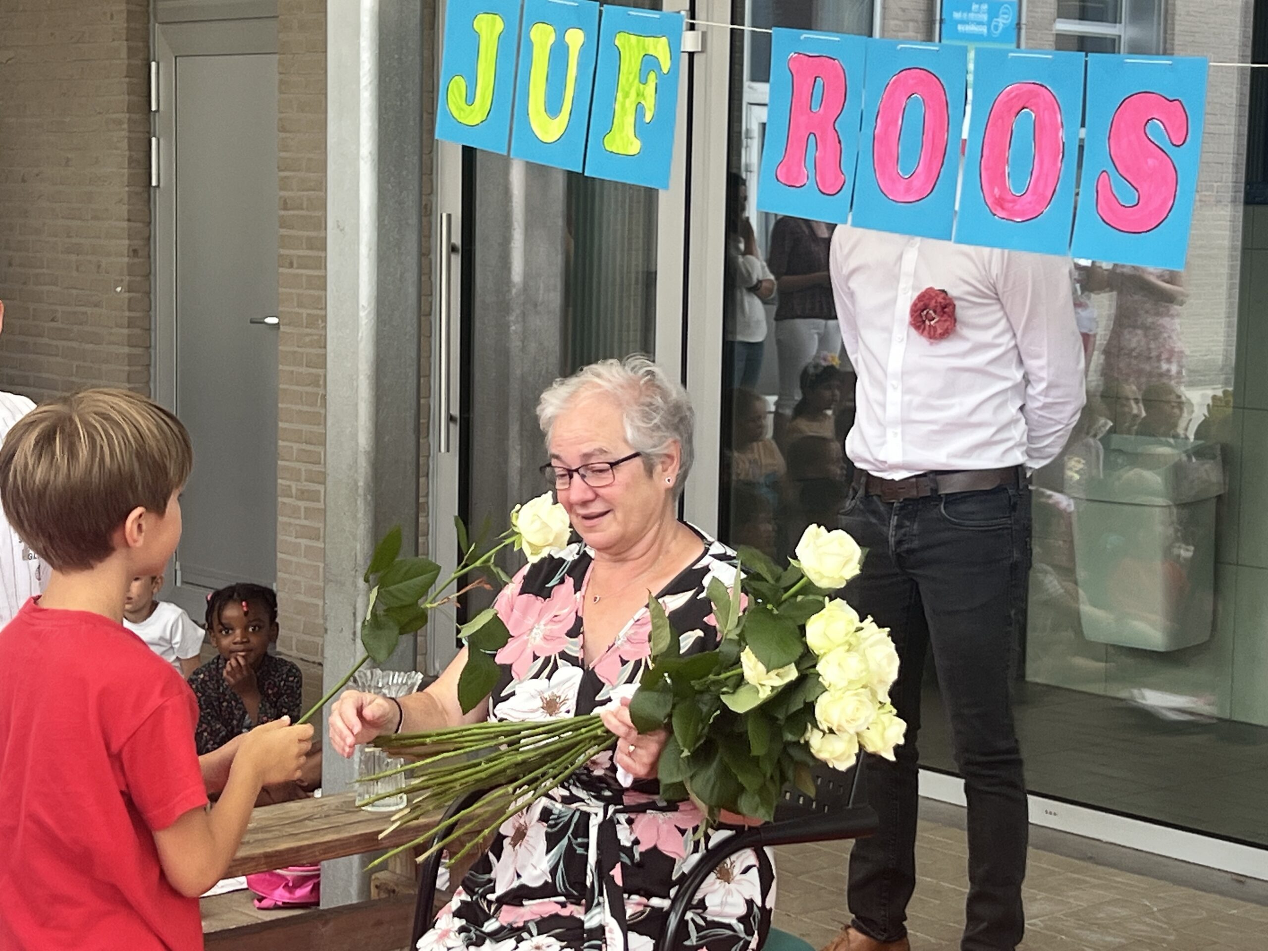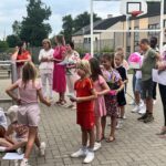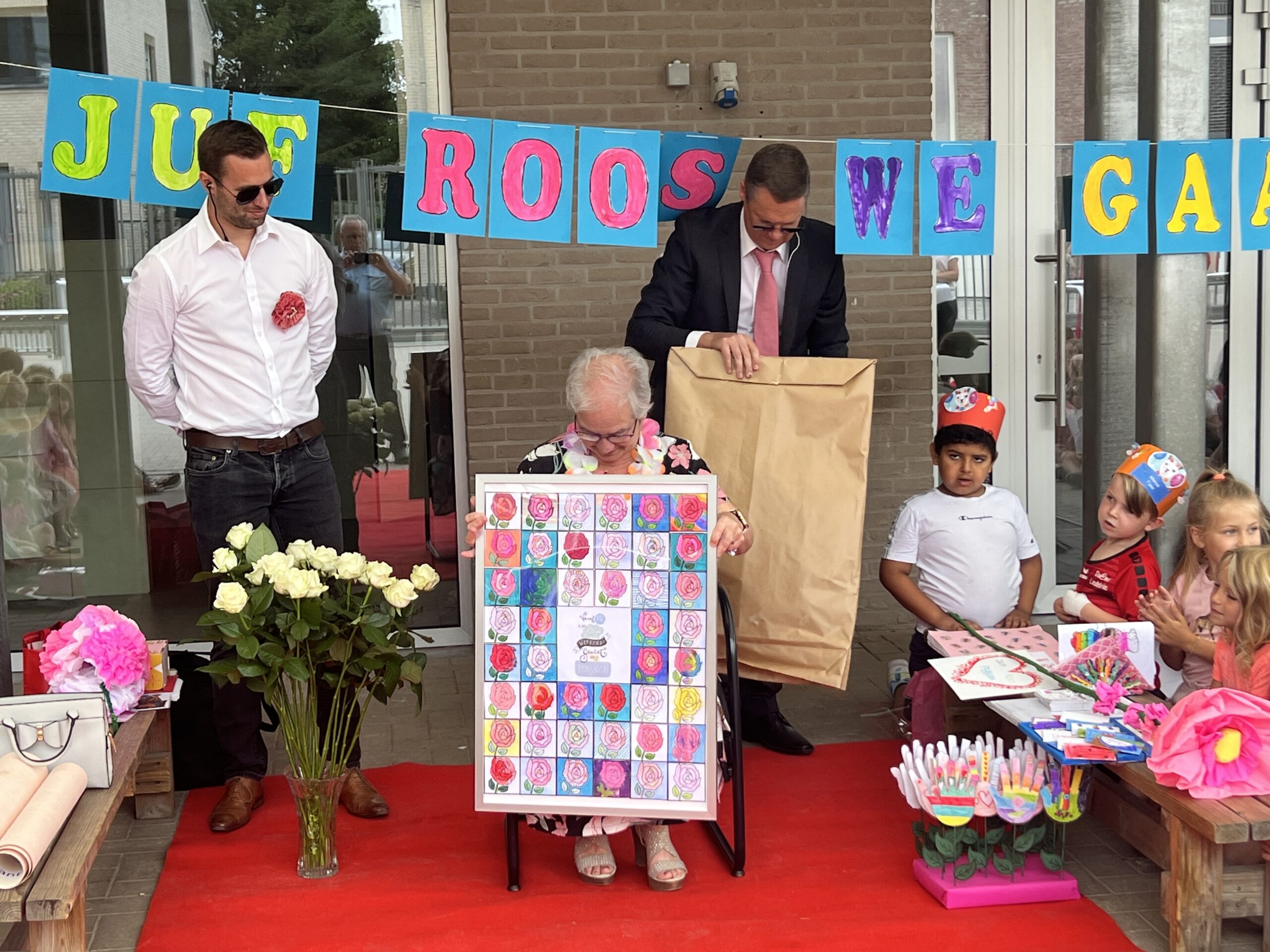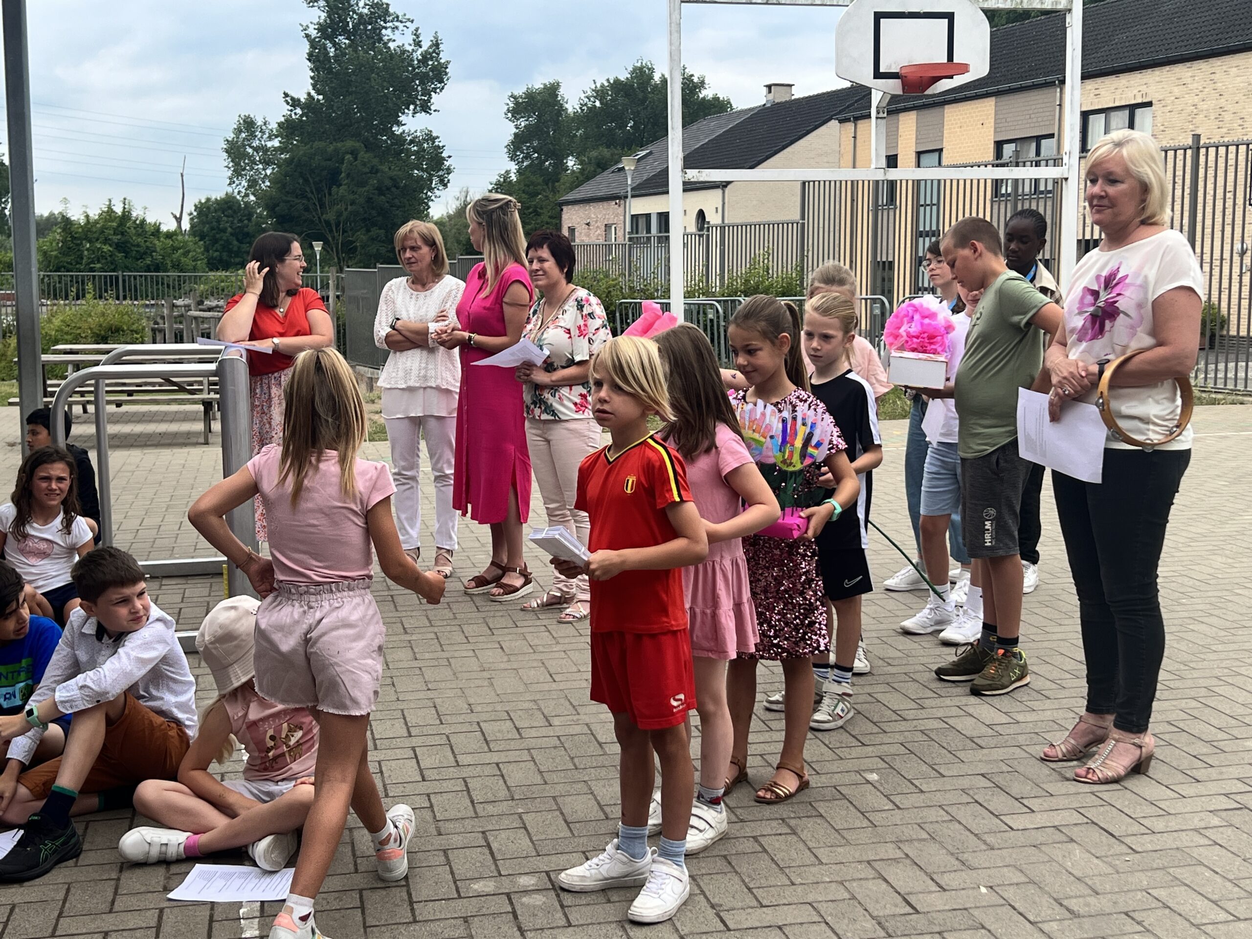 Op het einde van de dag vormen alle ouders in het schoolstraatje een erehaag en gaf de ouderraad haar nog een cadeautje als een tastbare blijk van hun waardering.