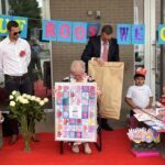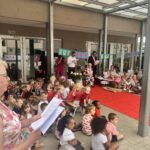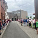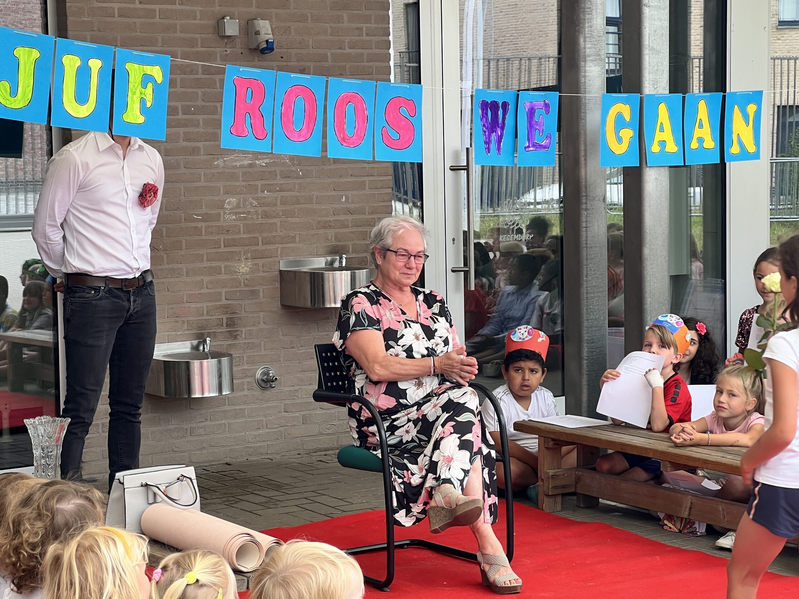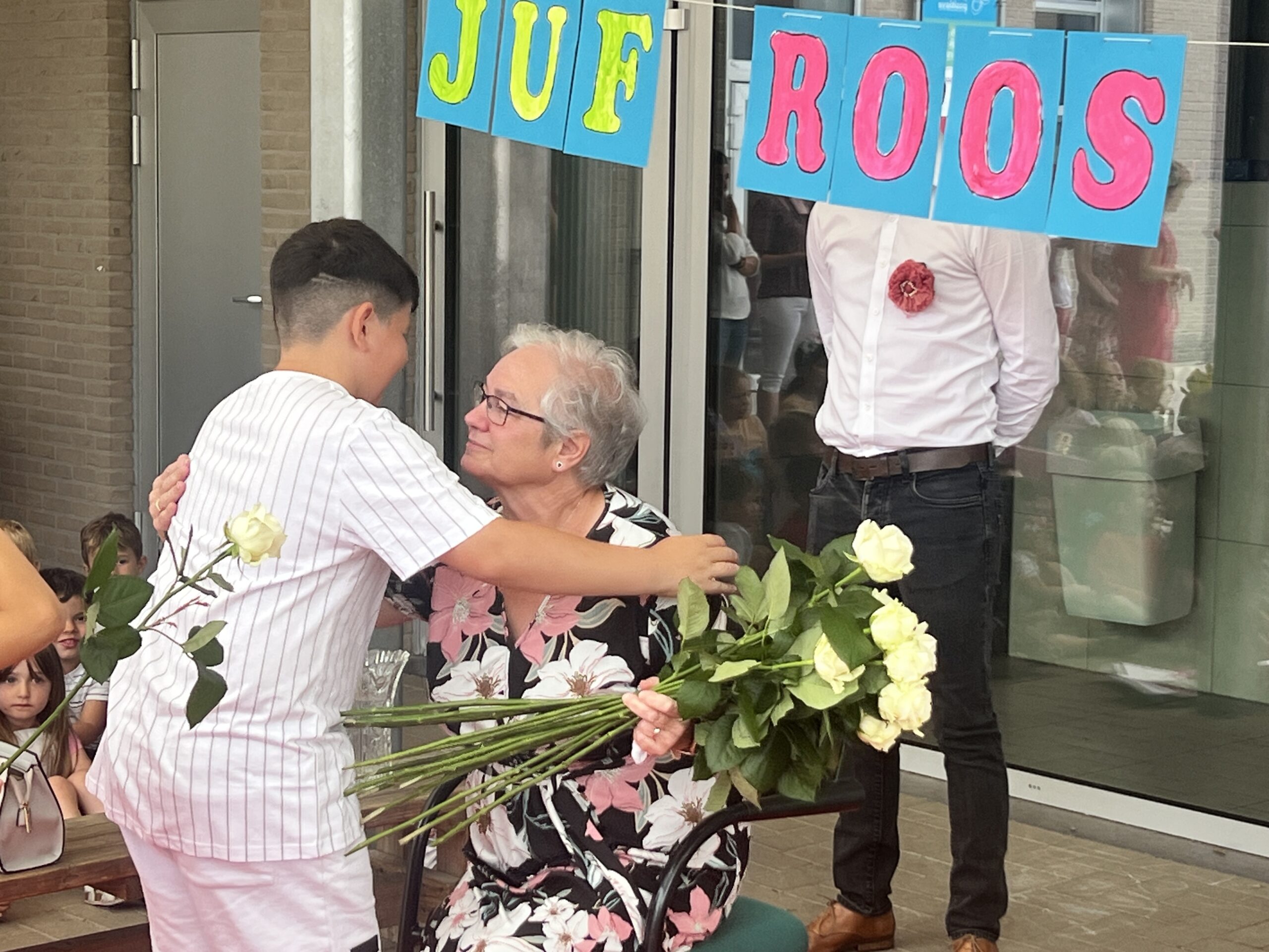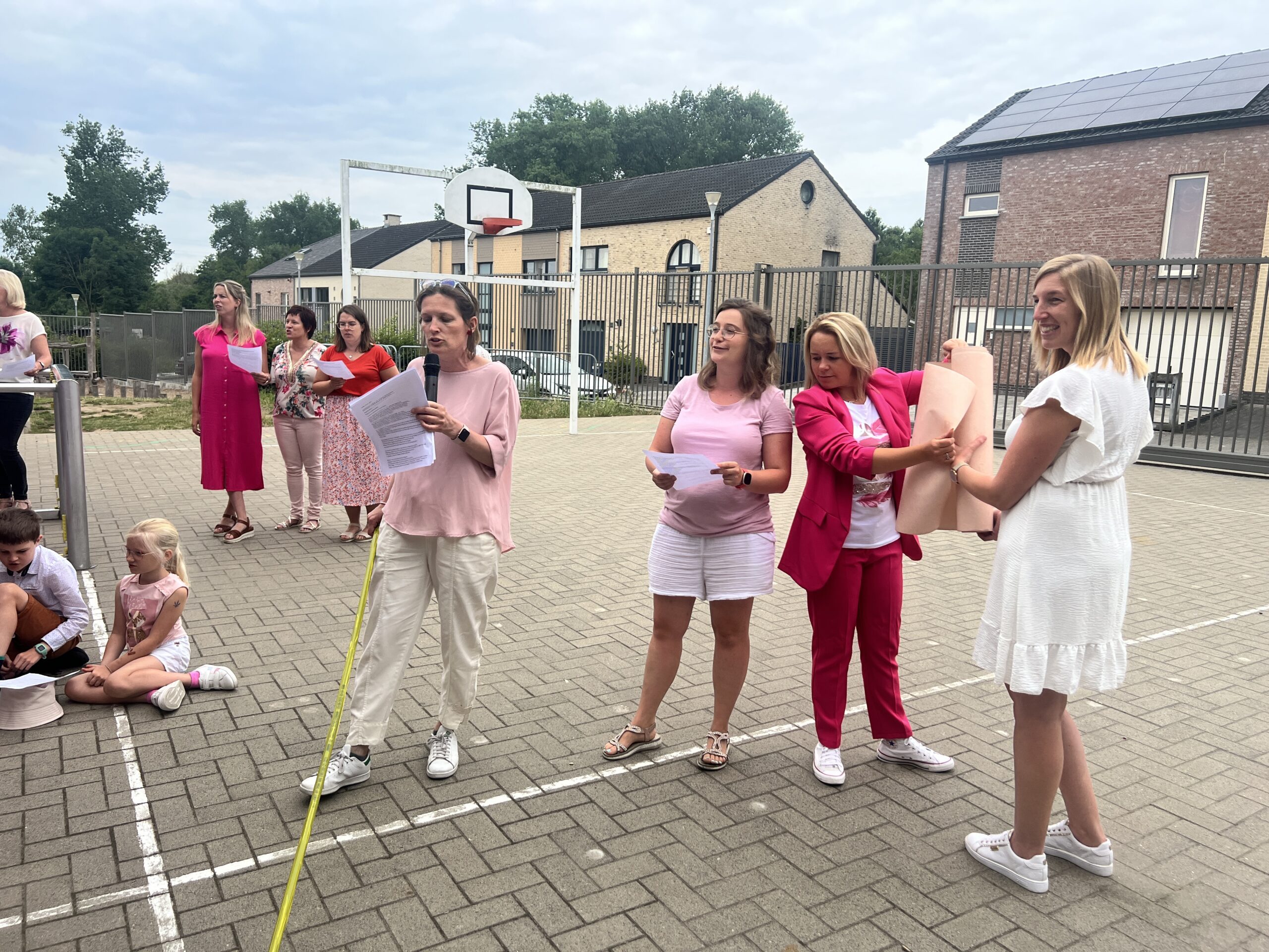 Op het einde van de dag vormen alle ouders in het schoolstraatje een erehaag en gaf de ouderraad haar nog een cadeautje als een tastbare blijk van hun waardering.