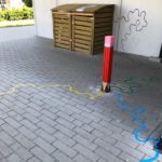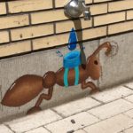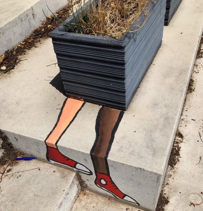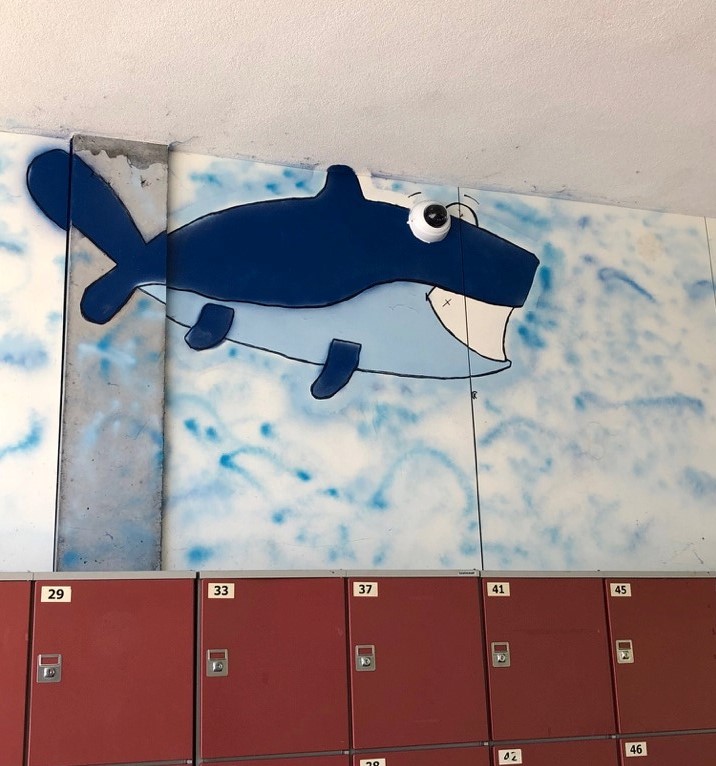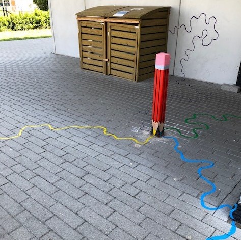 “Dat was in navolging van de straatkunst van de geheimzinnige Myra, die her en der opdook in het straatbeeld”, aldus Claude. “Het was de bedoeling om aanwezige objecten te verwerken in het ontwerp. Zo werd een camera het oog van een haai, een roostertje op de grond de snuffelplek van een hond. Een barst op de speelplaats was de basis van een gebroken hart of een paaltje veranderde in een potlood, dat verschillende gekleurde lijnen tekent.”