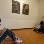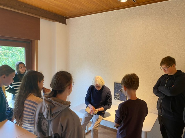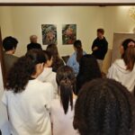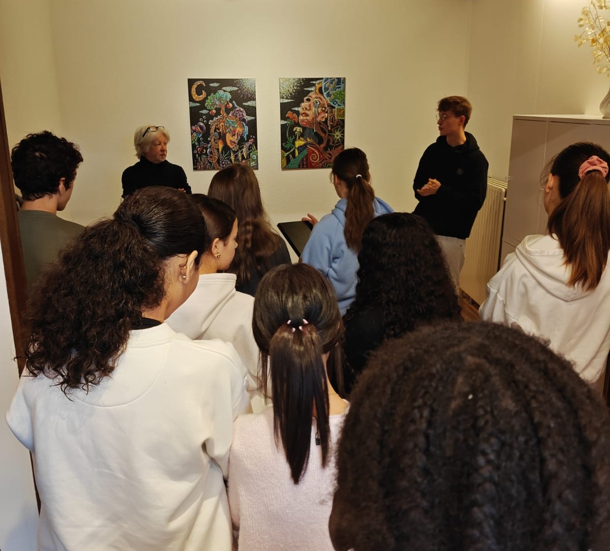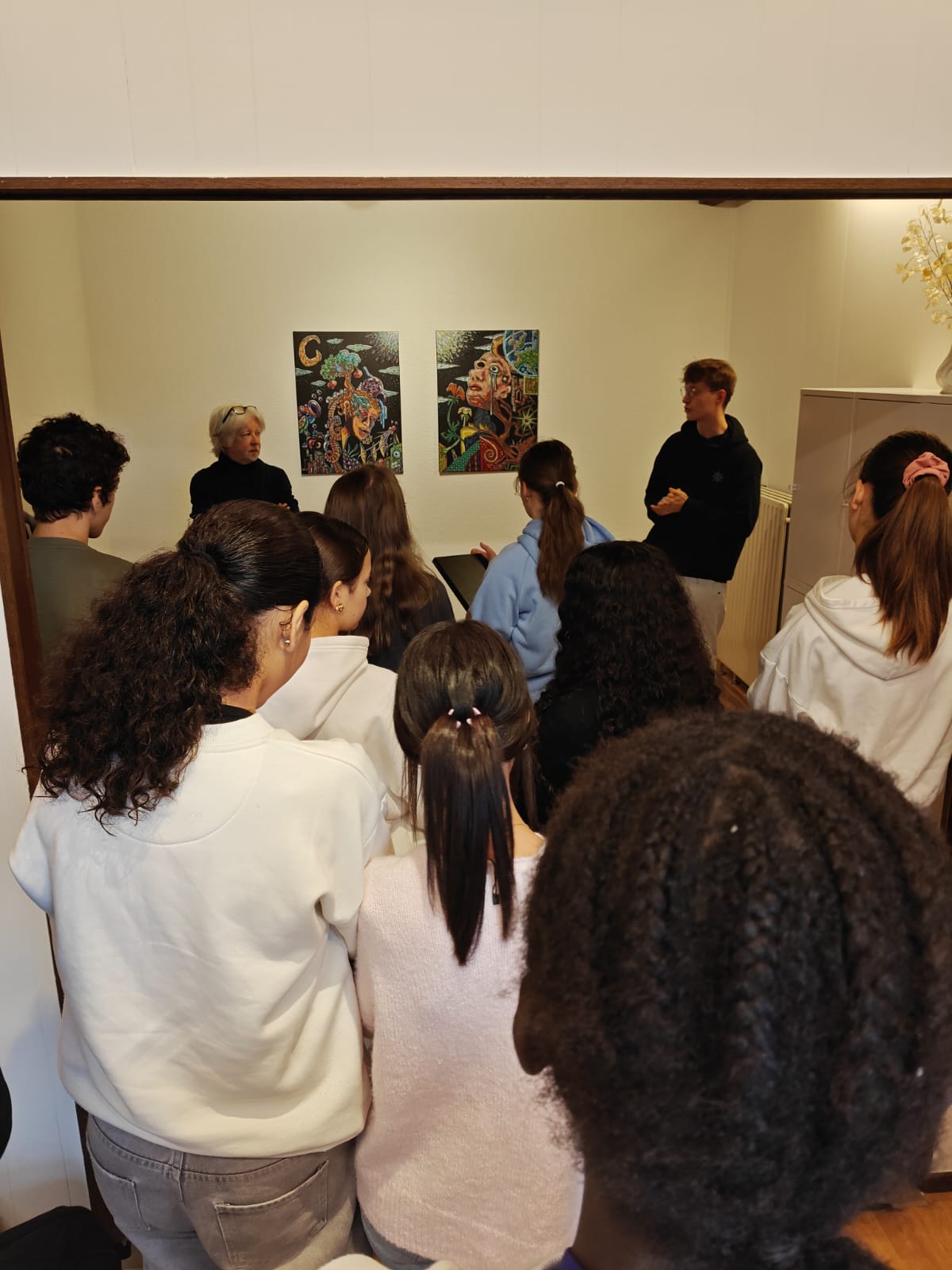Joeri Slincx gaf op zijn beurt toelichting bij zijn reeks ‘Vertelling nr. 2’. Daarin ontmoeten figuratieve elementen, hedendaagse kleurcontrasten en surrealistische verhalen elkaar. Zijn persoonlijke uitleg maakte diepe indruk op de jongeren.