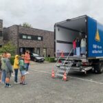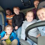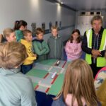 De voormiddag begon in de oplegger van de vrachtwagen, waar de kinderen leerden welke zones een chauffeur niet kan zien en welke vier vuistregels hen helpen om uit de dode hoek te blijven. Daarna volgde de praktijk: in en rond de vrachtwagen konden zij zelf ervaren hoe beperkt het zicht van een bestuurder is.