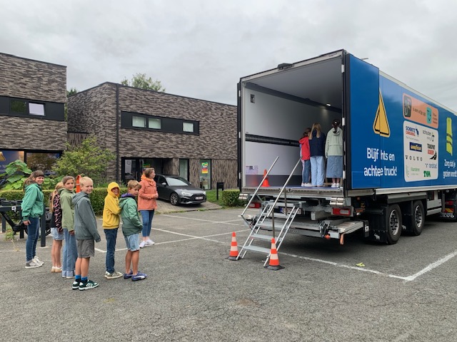 De Verkeersouders van de ouderraad organiseerden in samenwerking met Transport & Logistiek Vlaanderen deze dodehoeksessie, die best wel confronterend was voor de leerlingen van het 5de en 6de leerjaar.