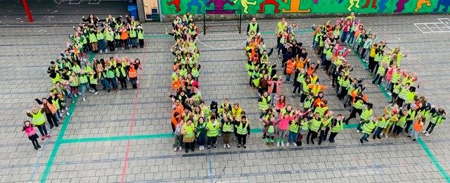 Het hoogtepunt van de dag was een foto met de hele school: leerlingen en leerkrachten in fluo-outfit.