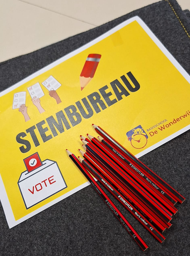 Omdat dit een verkiezingsjaar is, besloten de leerkrachten om het dit keer op schoolniveau uit te werken en op die manier de leerlingen actief te laten kennismaken met verkiezingen.